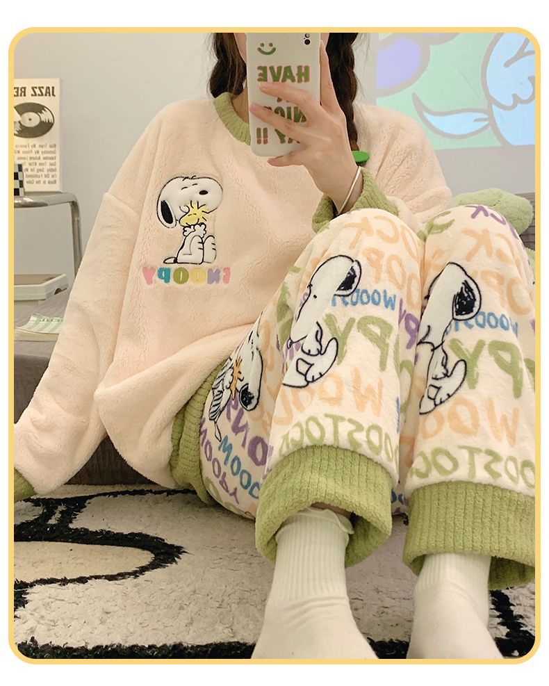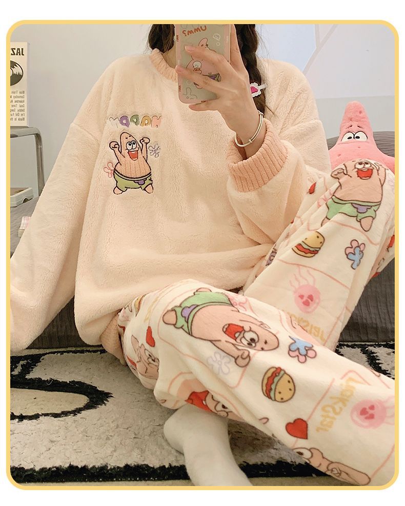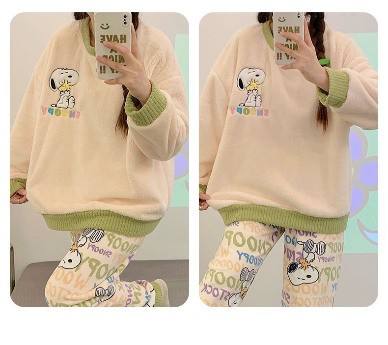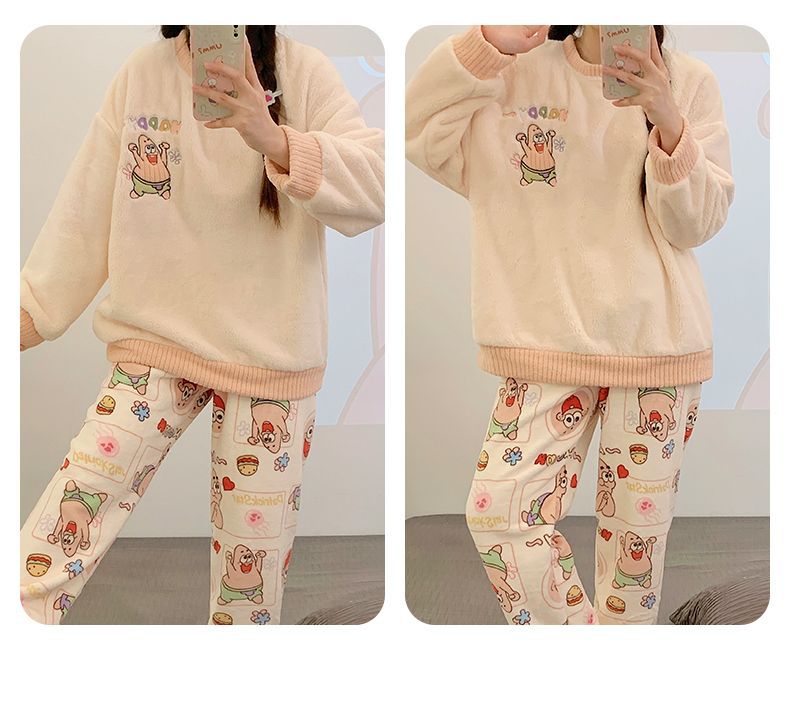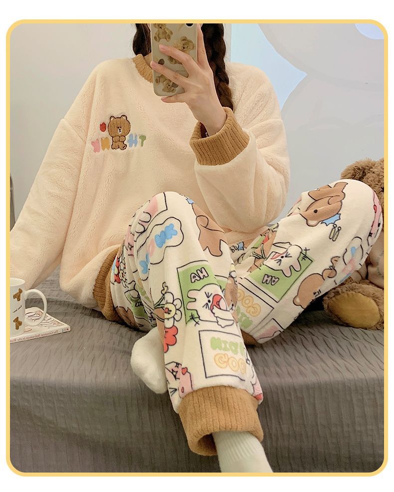 秋冬季【珊瑚绒睡衣女】新款波点可爱卡通 少女法兰绒加绒加厚套装