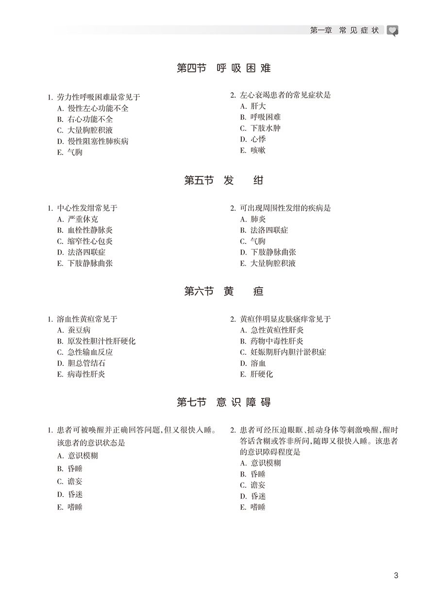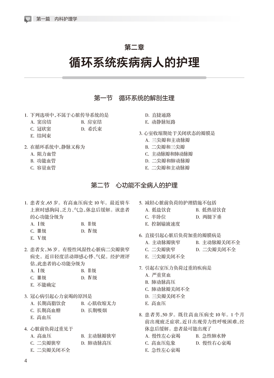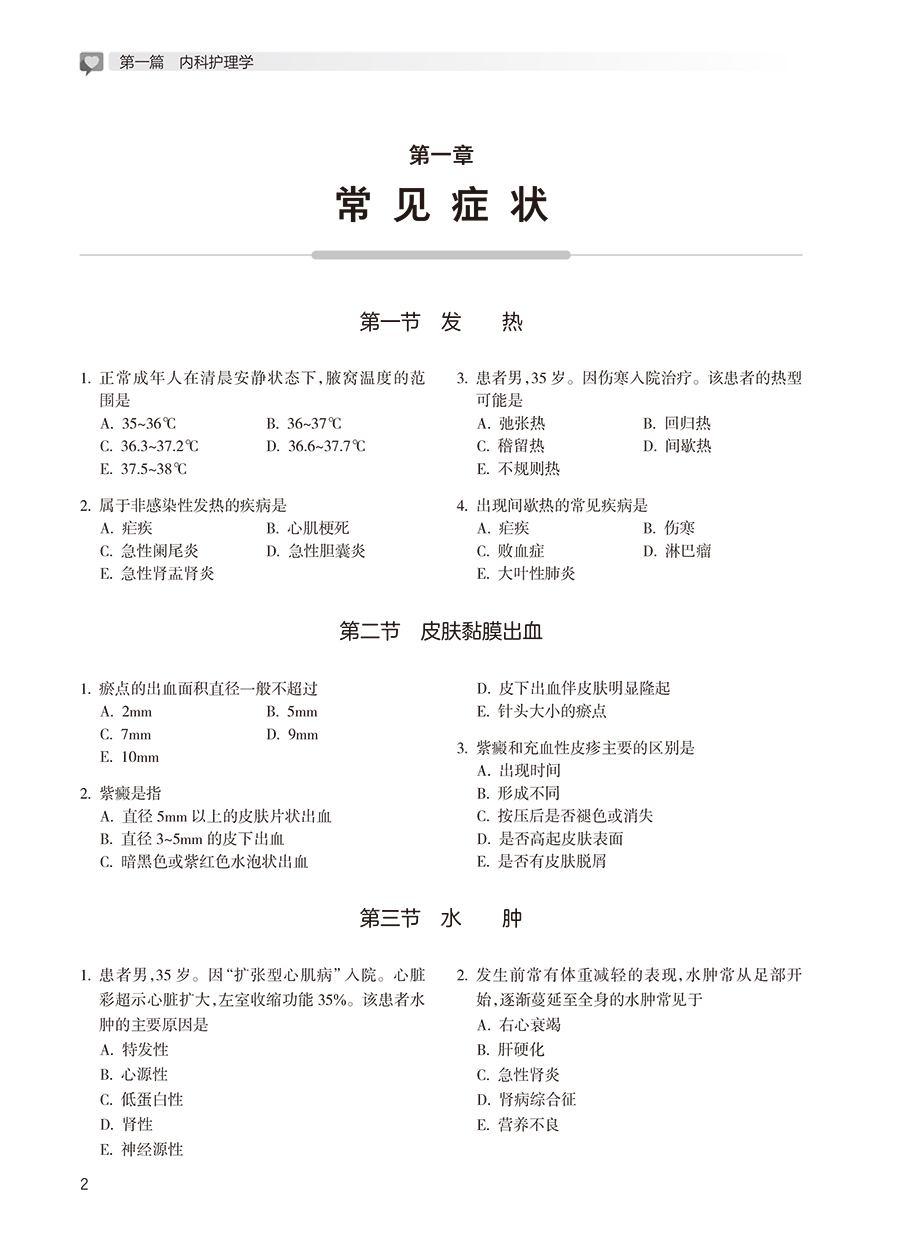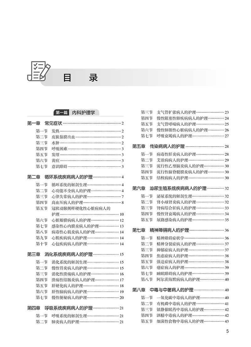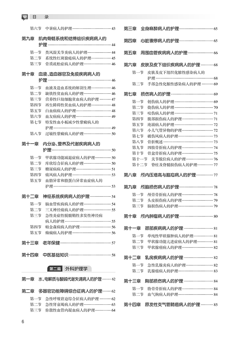第一篇 内科护理学 第一章 常见症状 / 2 第一节 发热 / 2 第二节 皮肤黏膜出血 / 2 第三节 水肿 / 2 第四节 呼吸困难 / 3 第五节 发绀 / 3 第六节 黄疸 / 3 第七节 意识障碍 / 3 第二章 循环系统疾病病人的护理 / 4 第一节 循环系统的解剖生理 / 4 第二节 心功能不全病人的护理 / 4 第三节 心律失常病人的护理 / 7 第四节 高血压病人的护理 / 8 第五节 冠状动脉粥样硬化性心脏病病人的护理 / 10 第六节 心脏瓣膜病病人的护理 / 12 第七节 感染性心内膜炎病人的护理 / 13 第八节 病毒性心肌炎病人的护理 / 14 第九节 心肌疾病病人的护理 / 14 第十节 心包疾病病人的护理 / 14 第三章 消化系统疾病病人的护理 / 15 第一节 消化系统的解剖生理 / 15 第二节 慢性胃炎病人的护理 / 15 第三节 消化性溃疡病人的护理 / 16 第四节 溃疡性结肠炎病人的护理 / 17 第五节 肝硬化病人的护理 / 18 第六节 肝性脑病病人的护理 / 19 第七节 慢性便秘病人的护理 / 20 第四章 呼吸系统疾病病人的护理 / 21 第一节 呼吸系统的解剖生理 / 21 第二节 肺炎病人的护理 / 21 第三节 支气管扩张病人的护理 / 23 第四节 慢性阻塞性肺疾病病人的护理/ 24 第五节 支气管哮喘病人的护理 / 25 第六节 慢性肺源性心脏病病人的护理/ 26 第七节 呼吸衰竭病人的护理 / 27 第五章 传染病病人的护理 / 28 第一节 病毒性肝炎病人的护理 / 28 第二节 艾滋病病人的护理 / 29 第三节 流行性乙型脑炎病人的护理 / 30 第四节 流行性脑脊髓膜炎病人的护理/ 30 第五节 结核病病人的护理 / 30 第六章 泌尿生殖系统疾病病人的护理 / 32 第一节 泌尿系统的解剖生理 / 32 第二节 肾小球肾炎病人的护理 / 32 第三节 肾病综合征病人的护理 / 33 第四节 慢性肾衰竭病人的护理 / 34 第五节 尿路感染病人的护理 / 35 第七章 精神障碍病人的护理 / 36 第一节 精神障碍症状学 / 36 第二节 精神分裂症病人的护理 / 37 第三节 抑郁症病人的护理 / 37 第四节 焦虑症病人的护理 / 38 第五节 强迫症病人的护理 / 38 第六节 癔症病人的护理 / 39 第七节 睡眠障碍病人的护理 / 39 第八节 阿尔茨海默病病人的护理 / 40 第八章 中毒与中暑病人的护理 / 40 第一节 一氧化碳中毒病人的护理 / 40 第二节 有机磷中毒病人的护理 / 41 第三节 镇静催眠药中毒病人的护理 / 42 第四节 酒精中毒病人的护理 / 42 第五节 细菌性食物中毒病人的护理 / 43 第六节 中暑病人的护理 / 43 第九章 肌肉骨骼系统和结缔组织疾病病人的护理 / 44 第一节 类风湿关节炎病人的护理 / 44 第二节 系统性红斑狼疮病人的护理 / 45 第三节 骨质疏松症病人的护理 / 46 第十章 血液、造血器官及免疫疾病病人的护理 / 46 第一节 血液及造血系统的解剖生理 / 46 第二节 缺铁性贫血病人的护理 / 46 第三节 营养性巨幼细胞贫血病人的护理 / 47 第四节 再生障碍性贫血病人的护理 / 48 第五节 白血病病人的护理 / 48 第六节 血友病病人的护理 / 49 第七节 特发性血小板减少性紫癜病人的护理 / 49 第八节 过敏性紫癜病人的护理 / 50 第十一章 内分泌、营养及代谢疾病病人的护理 / 50 第一节 甲状腺功能减退症病人的护理/ 50 第二节 库欣综合征病人的护理 / 50 第三节 糖尿病病人的护理 / 51 第四节 痛风病人的护理 / 53 第五节 血脂异常和脂蛋白异常血症病人的 护理 / 53 第十二章 神经系统疾病病人的护理 / 54 第一节 脑血管疾病病人的护理 / 54 第二节 三叉神经痛病人的护理 / 55 第三节 急性炎症性脱髓鞘性多发性神经病 病人的护理 / 55 第四节 帕金森病病人的护理 / 56 第五节 癫痫病人的护理 / 56 第十三章 老年保健 / 57 第十四章 中医基础知识 / 58 第二篇 外科护理学 第一章 水、电解质与酸碱代谢失调病人的护理 / 62 第二章 多器官功能障碍综合征病人的护理 / 62 第一节 急性呼吸窘迫综合征病人的护理 / 62 第二节 急性肾衰竭病人的护理 / 63 第三节 弥散性血管内凝血病人的护理/ 64 第三章 全身麻醉病人的护理 / 65 第四章 心脏骤停病人的护理 / 65 第五章 周围血管疾病病人的护理 / 66 第六章 皮肤及皮下组织疾病病人的护理 / 68 第一节 皮肤及皮下组织化脓性感染病人的护理 / 68 第二节 手部急性化脓性感染病人的护理 / 69 第七章 损伤病人的护理 / 69 第一节 创伤病人的护理 / 69 第二节 烧伤病人的护理 / 70 第三节 咬伤病人的护理 / 71 第四节 腹部损伤病人的护理 / 71 第五节 淹溺病人的护理 / 72 第六节 小儿气管异物的护理 / 72 第七节 破伤风病人的护理 / 73 第八节 骨折概述 / 73 第九节 四肢骨折病人的护理 / 74 第十节 骨盆骨折病人的护理 / 75 第十一节 关节脱位病人的护理 / 76 第十二节 脊柱及脊髓损伤病人的护理/ 77 第八章 颅内压增高与脑疝病人的护理 / 77 第九章 颅脑损伤病人的护理 / 78 第一节 颅骨骨折病人的护理 / 78 第二节 头皮损伤病人的护理 / 79 第三节 脑损伤病人的护理 / 79 第十章 颅内肿瘤病人的护理 / 80 第十一章 颈部疾病病人的护理 / 81 第一节 单纯性甲状腺肿病人的护理 / 81 第二节 甲状腺功能亢进症病人的护理/ 81 第三节 甲状腺癌病人的护理 / 82 第十二章 乳房疾病病人的护理 / 82 第一节 急性乳腺炎病人的护理 / 82 第二节 乳腺癌病人的护理 / 83 第十三章 胸部损伤病人的护理 / 84 第一节 肋骨骨折病人的护理 / 84 第二节 血气胸病人的护理 / 84 第十四章 原发性支气管肺癌病