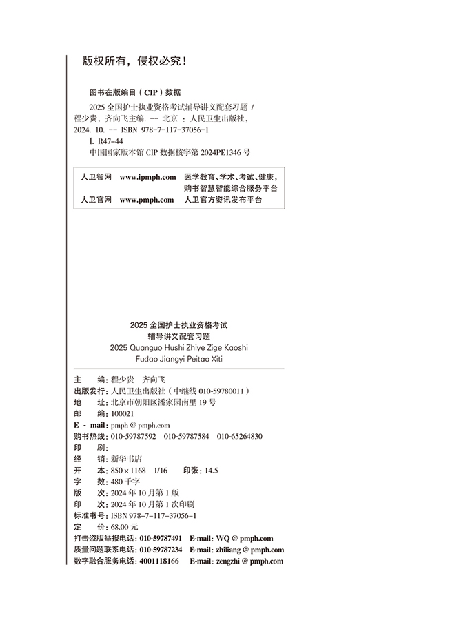 本书为2025全国护士执业资格考试辅导讲义的配套精选习题。习题注重优化,内容精练,紧密结合最新考试大纲和权威考试指导,满足考生复习检测的需求。本书是完全符合新护考精神的辅导教材,突出新护考的“护”字,在精研新大纲实施后题型特点的基础上,以最权威、最具指导性的《2025全国护士执业资格考试指导》为蓝本,对新护考已经涉及和可能涉及的考点进行了多种形式的标记,并给每个考点配了例题或习题,精心整合考点与习题,使考生在备考之时好学易记、事半功倍。配套习题的顺序和《辅导讲义》内容完全一致,方便考生及时通过习题来实现对复习内容的巩固和提高,进一步加深对考点的理解与把握。考点习题化,用习题来模拟临床情景是本书的特色。用习题来覆盖考点,用习题来明确复习方向,将有效地提高考生的应试能力,并真正地帮助考生通过考试难关。