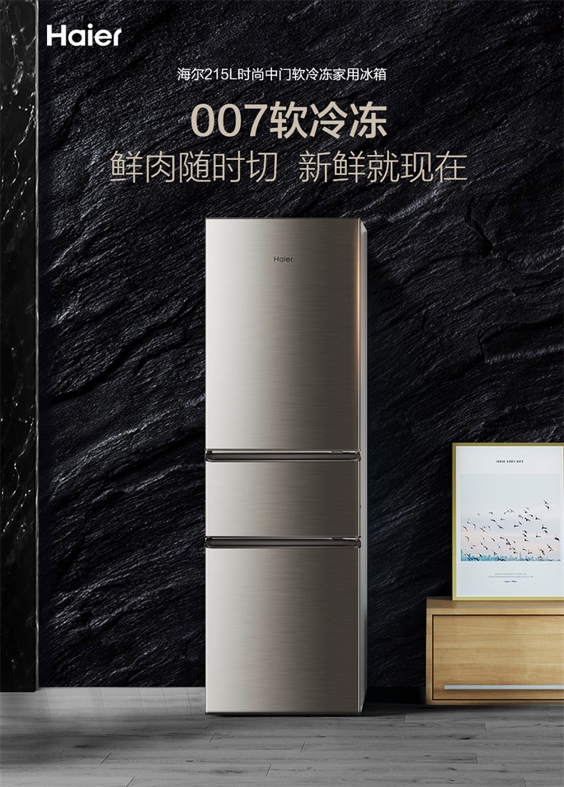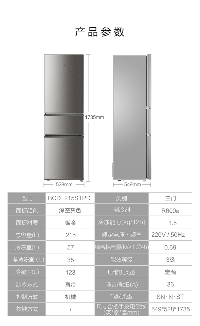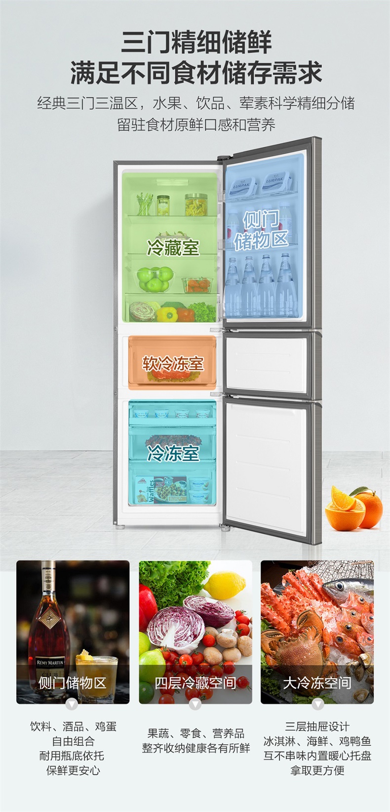 海尔(Haier)三门小型家用宿舍租房冷藏冷冻小冰箱 海尔215升