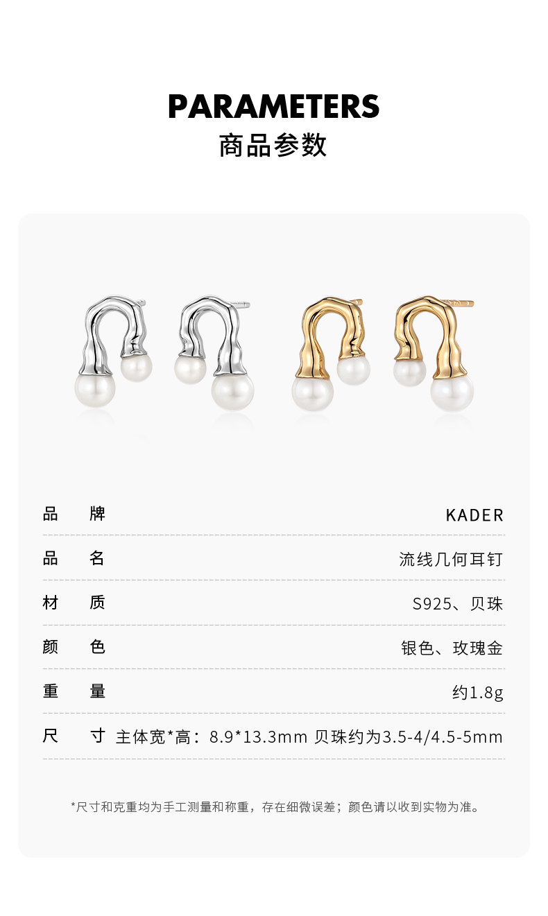 KADER卡蒂罗 流线几何 人造珍珠耳钉女925银耳饰小众设计感2023新款爆款
