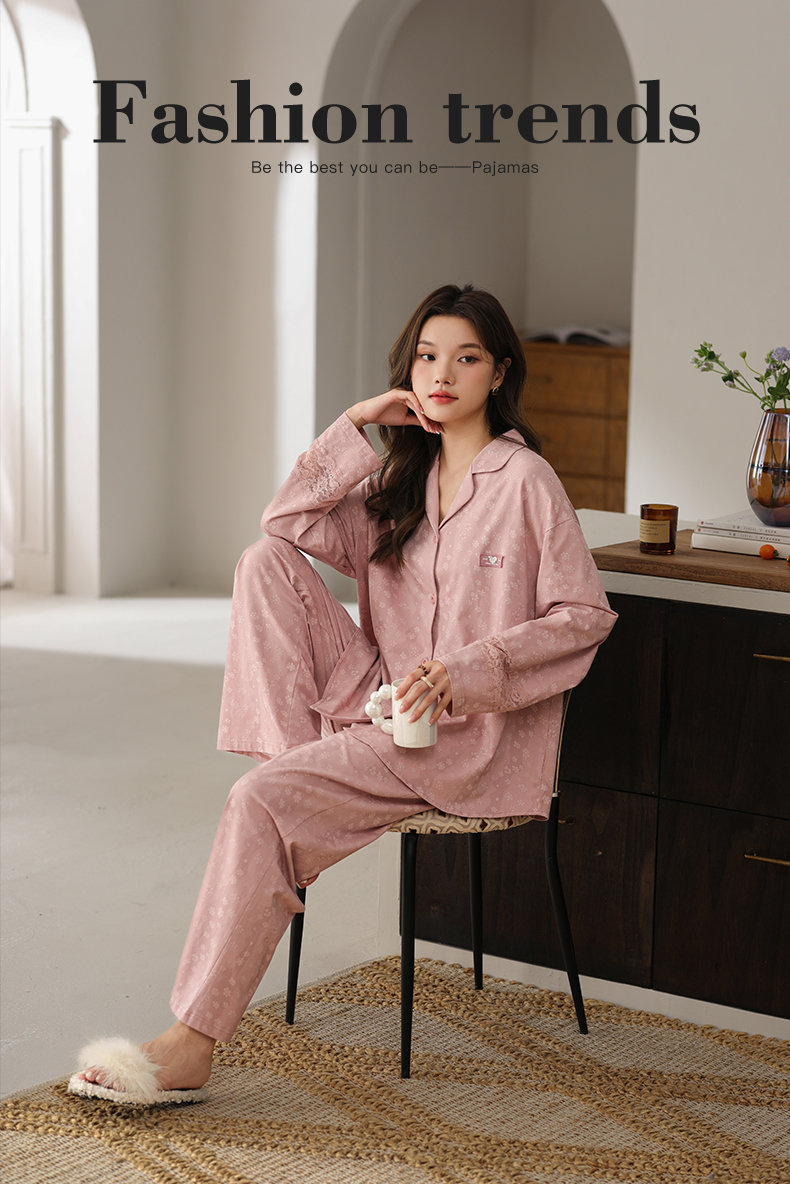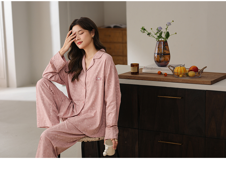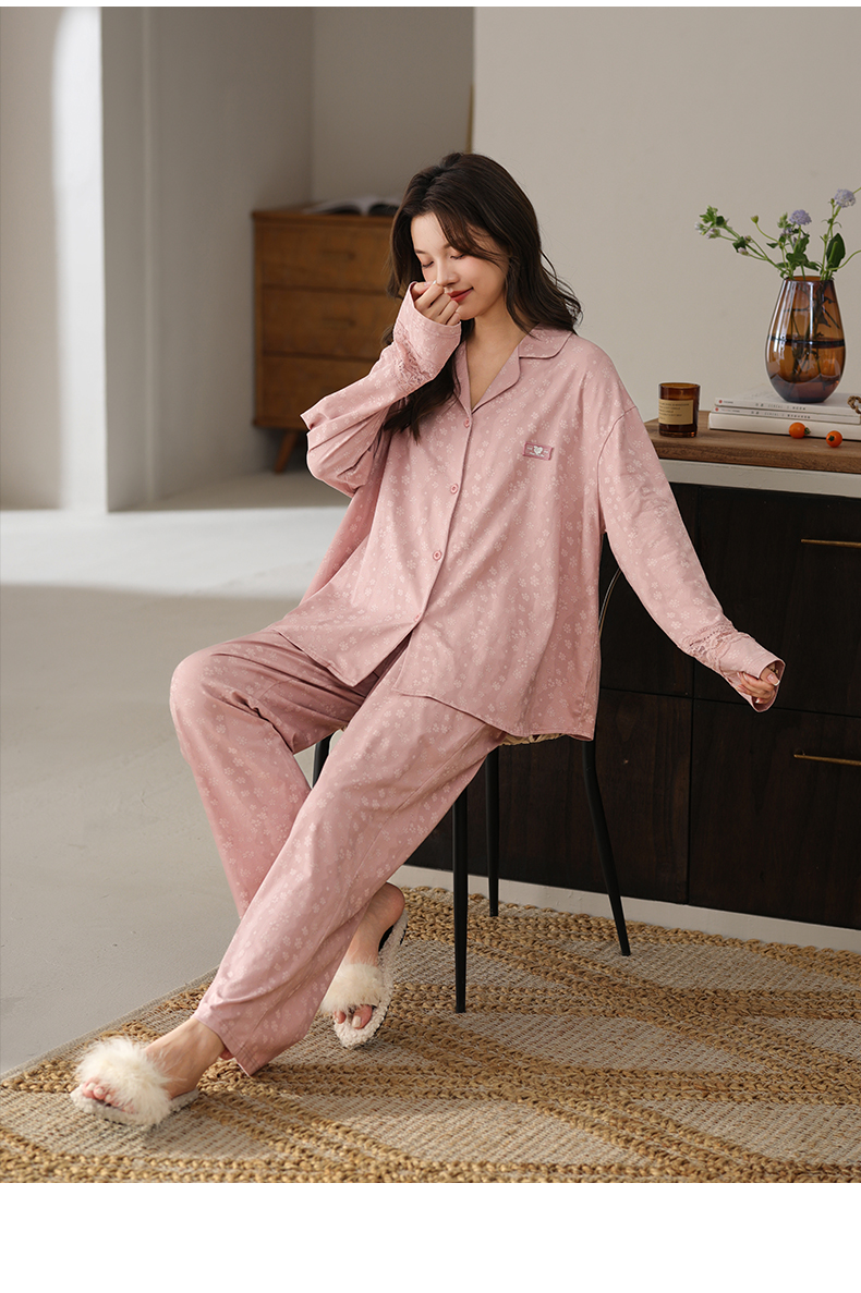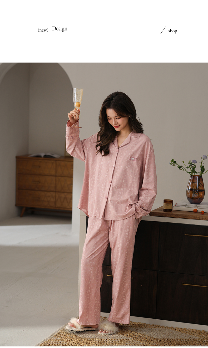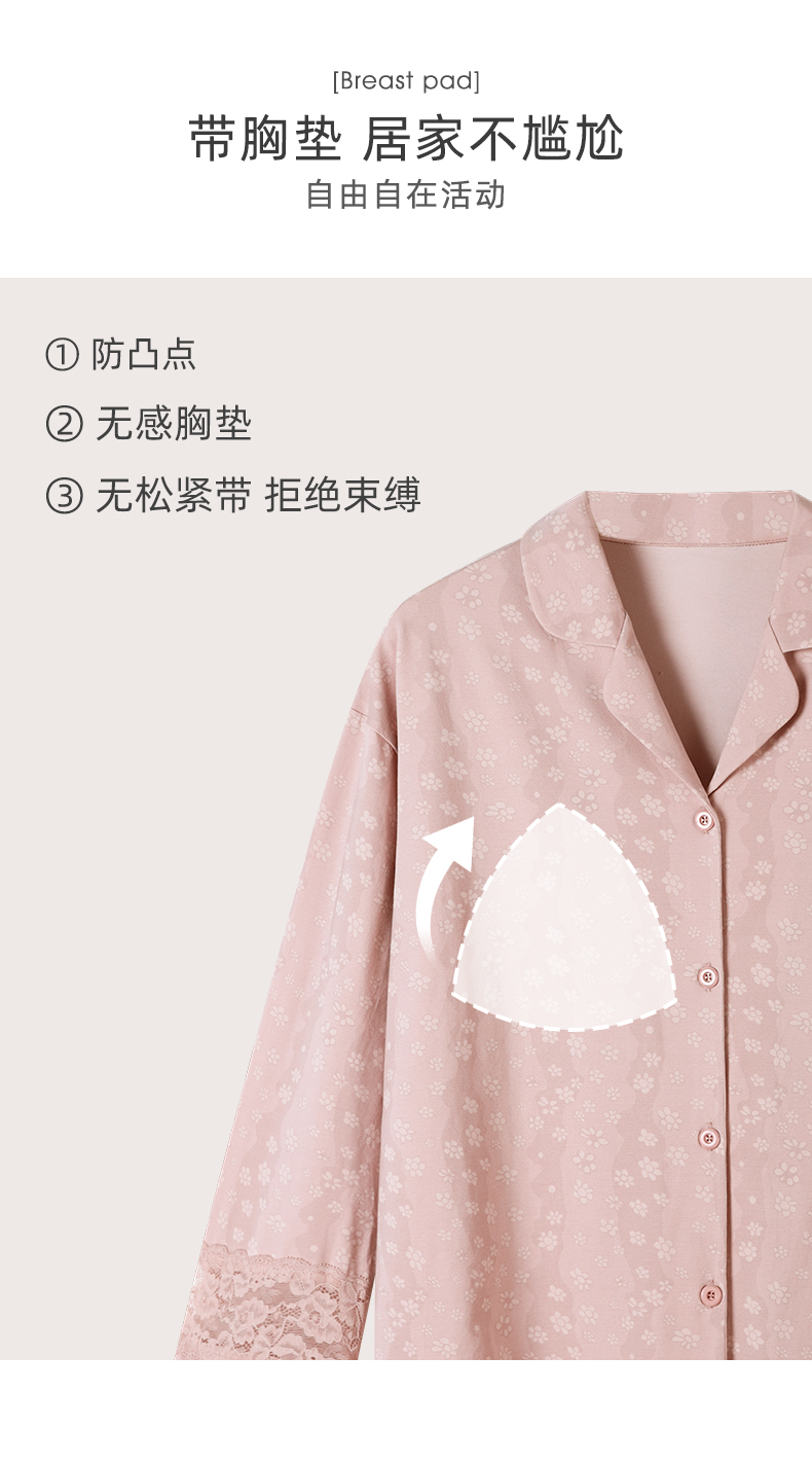 可人儿春秋季带胸垫奥力棉女士长袖长裤睡衣可外出纯棉家居服套装