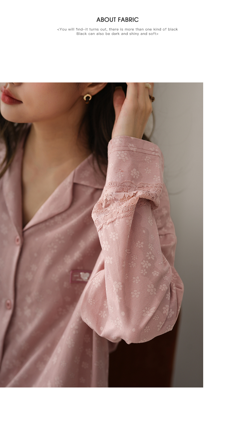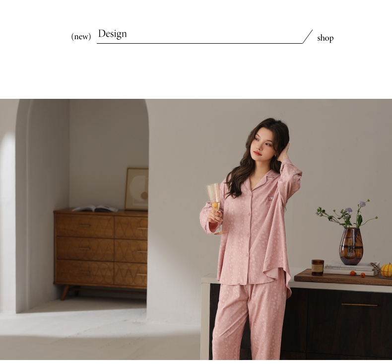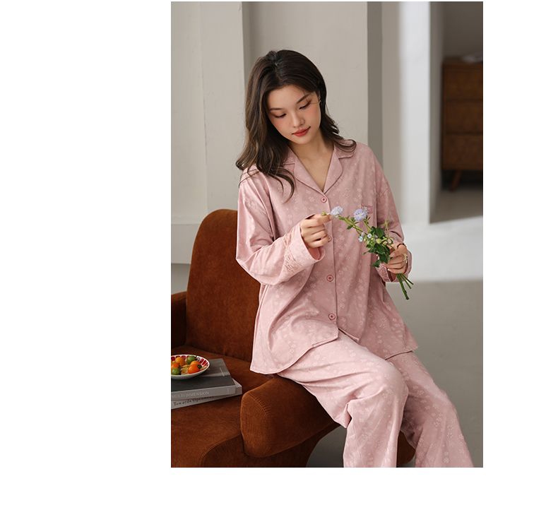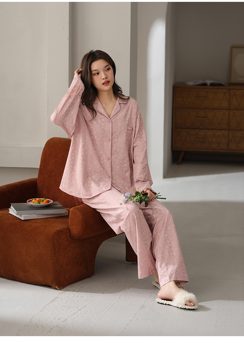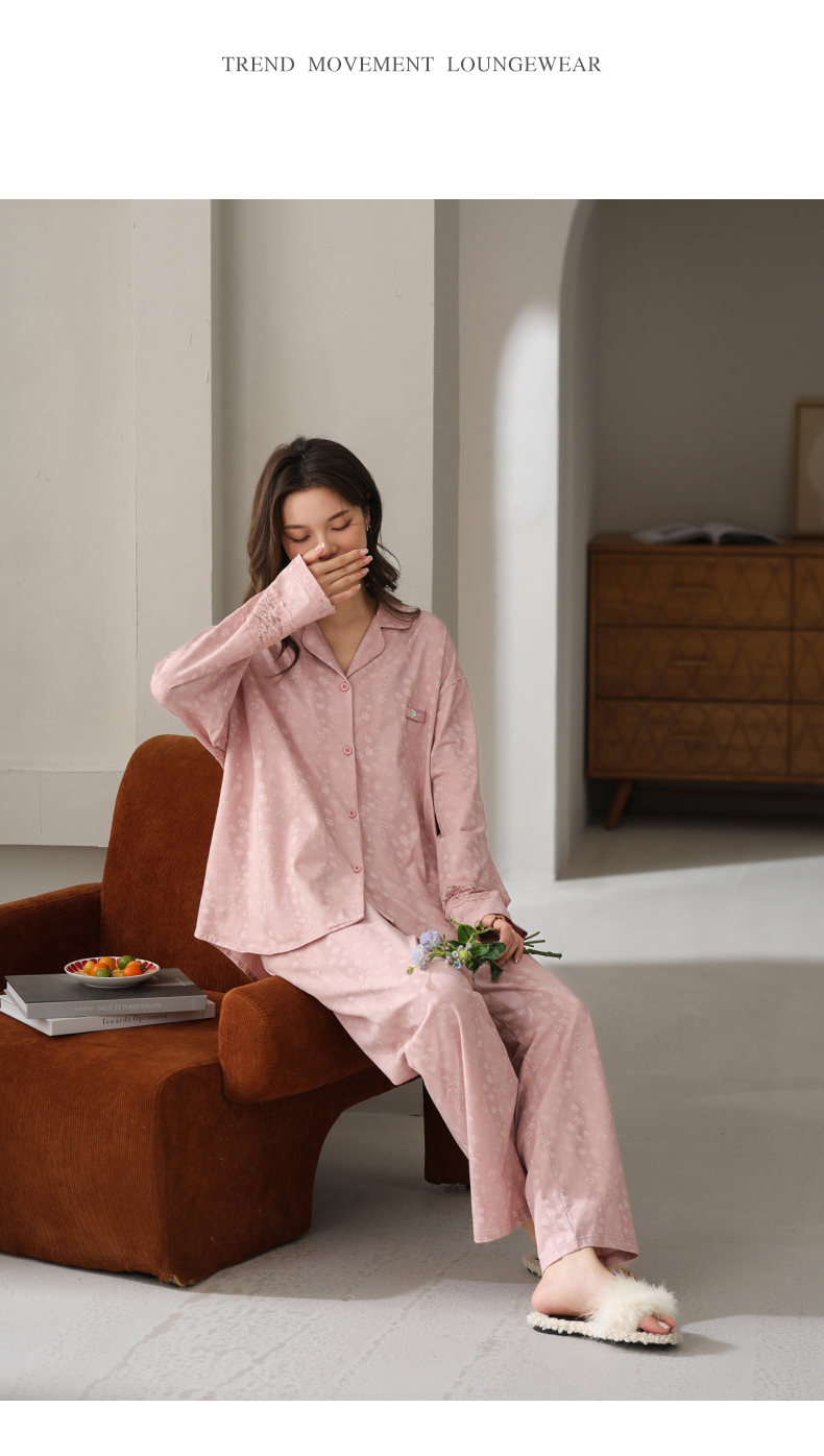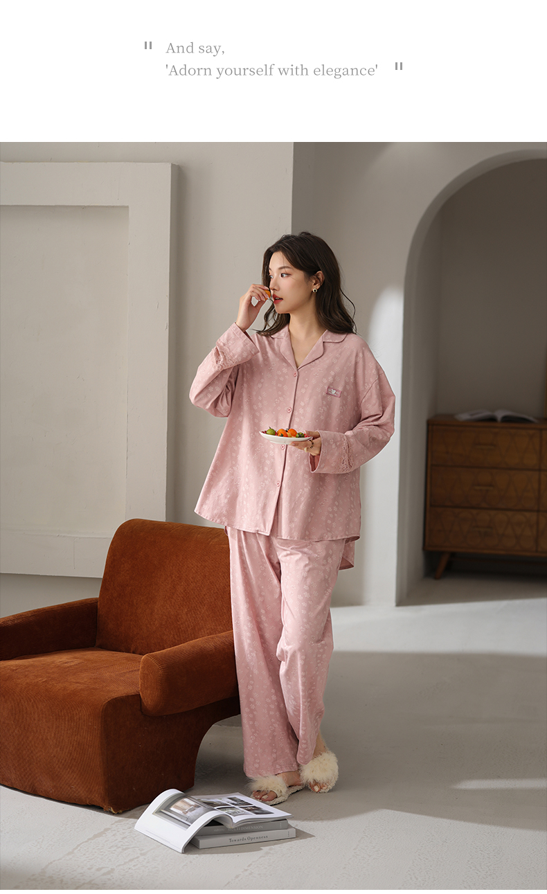 可人儿春秋季带胸垫奥力棉女士长袖长裤睡衣可外出纯棉家居服套装