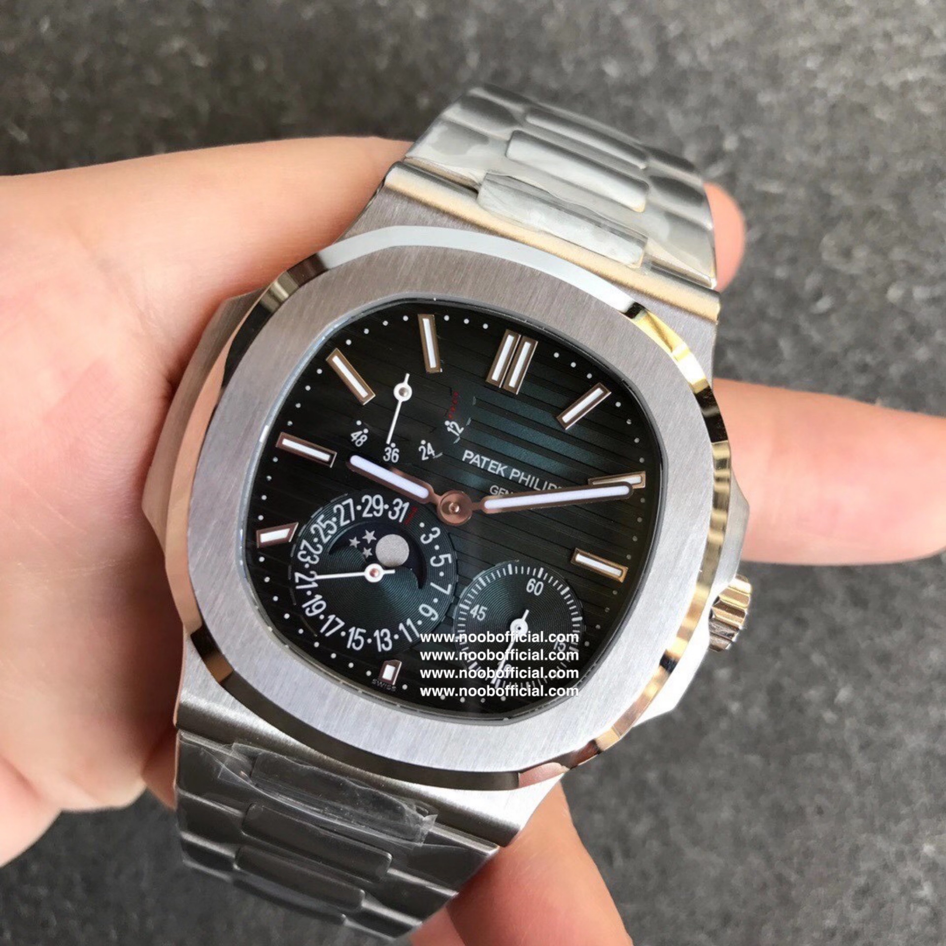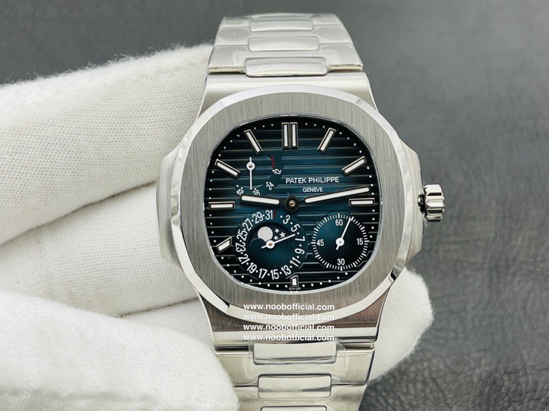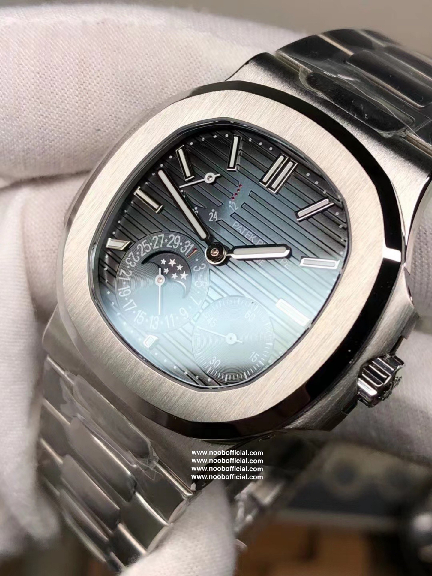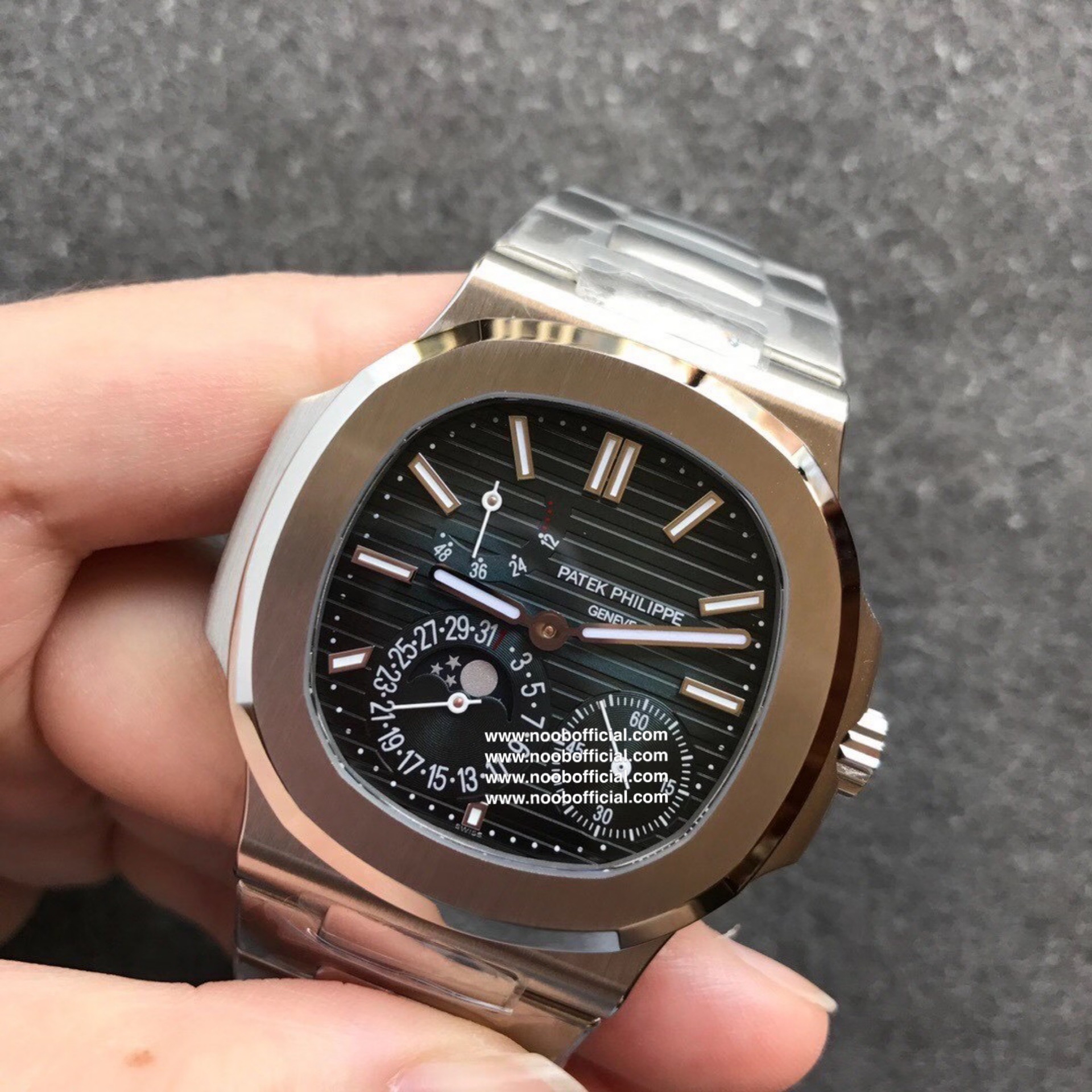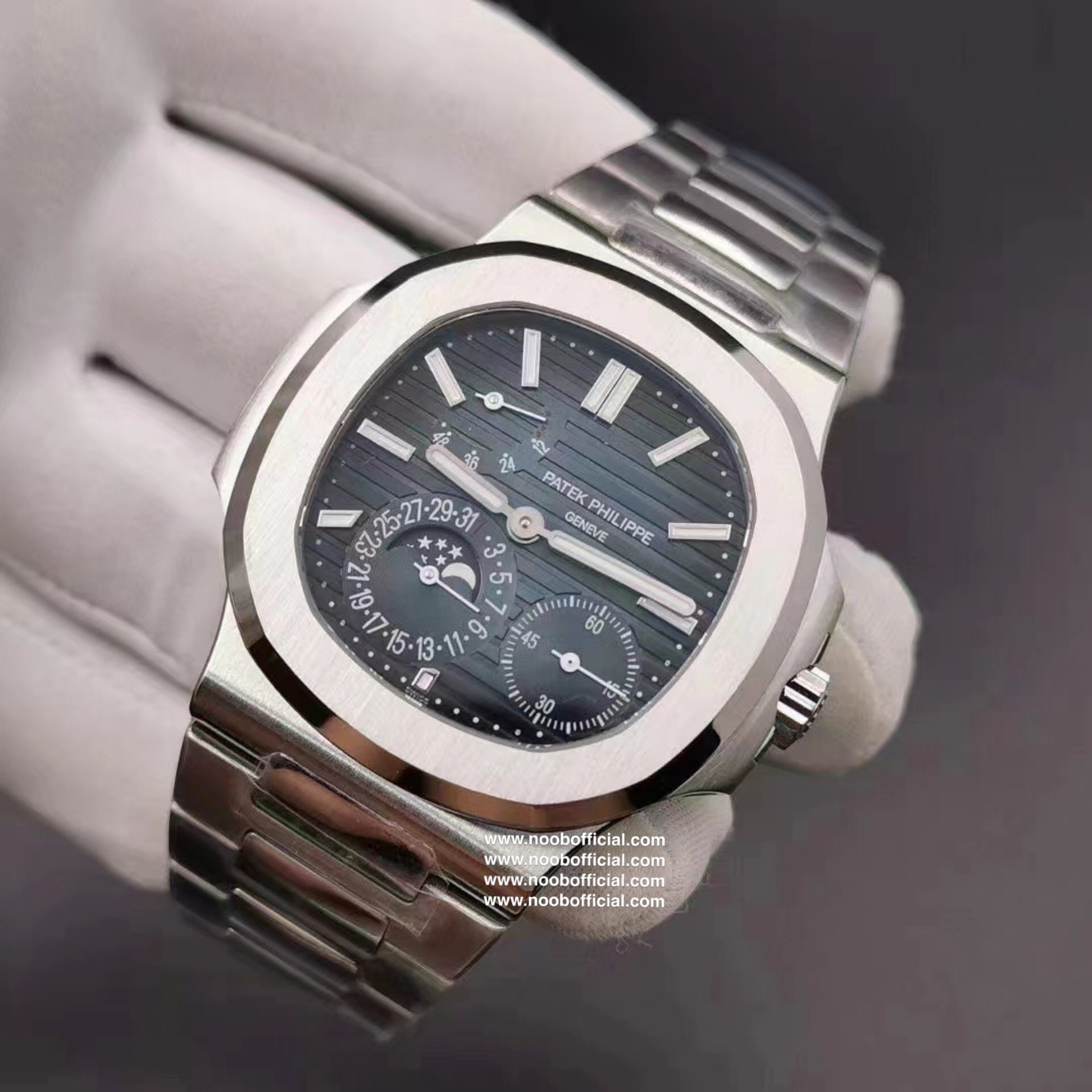 Noob潜心三年 真"芯"之作!百达翡丽PP5712GR"钢王之王"巅峰出道了!这是真正具有里程碑意义的超级一体机芯Cal.240 PS IRM C LU。全机芯零件数265个,平面游丝,21600每小时振荡次数 Gyromax带调节砝码的摆轮,稳定无误差。(不同于市面上现有的假机芯盖甲板,假珍珠陀) 全新修正的不锈钢表带,铰链部分根据真正的百达翡丽鹦鹉螺不锈钢表带拆解开发,和正品一致的贴合效果,逆袭市面上所有副本,铰链开合角度和正品一致,锁毕声音和正品相同。而PPF厂独家的"蓝魅"面无限接近接近原版,更是傲视群雄!