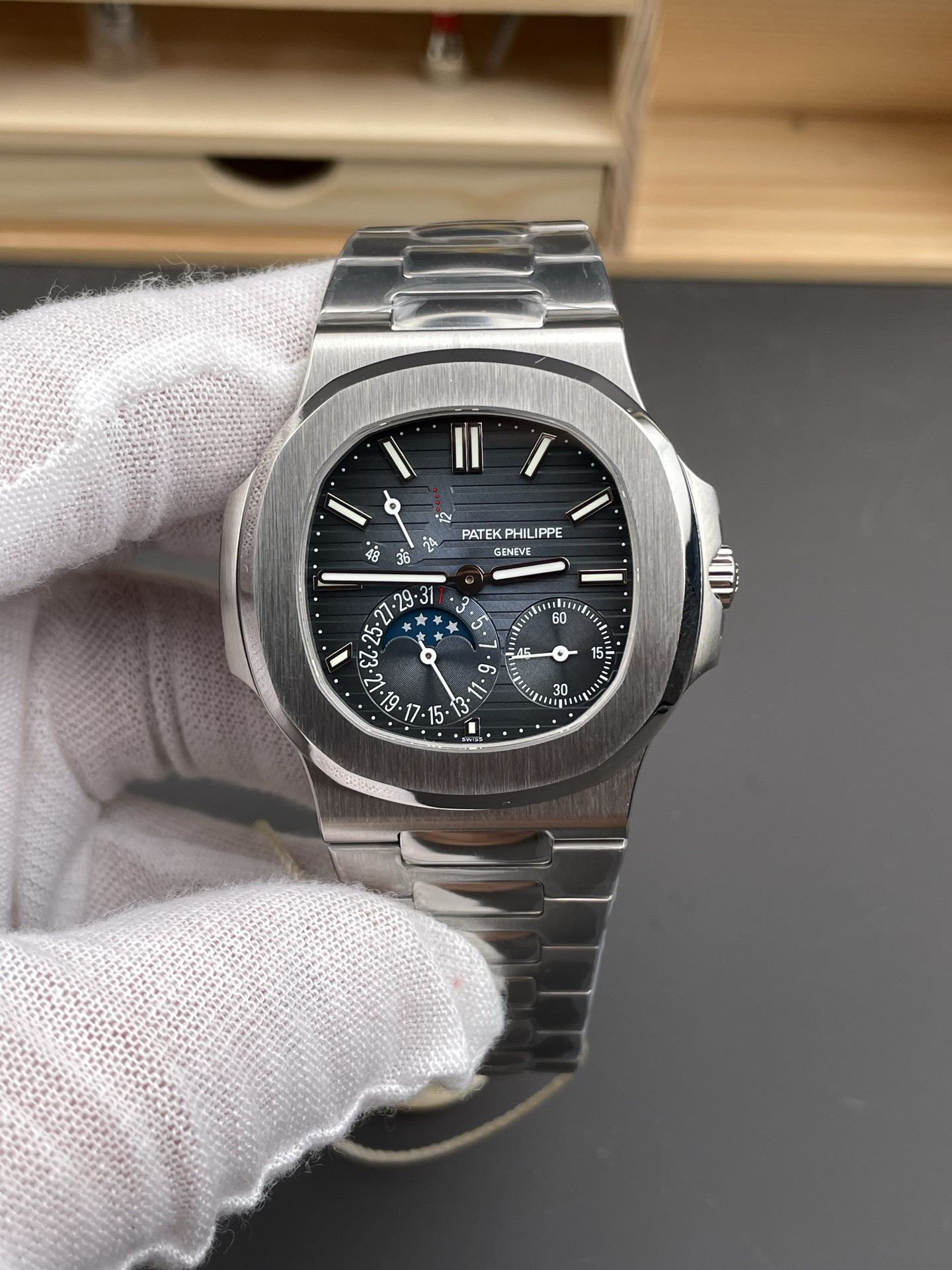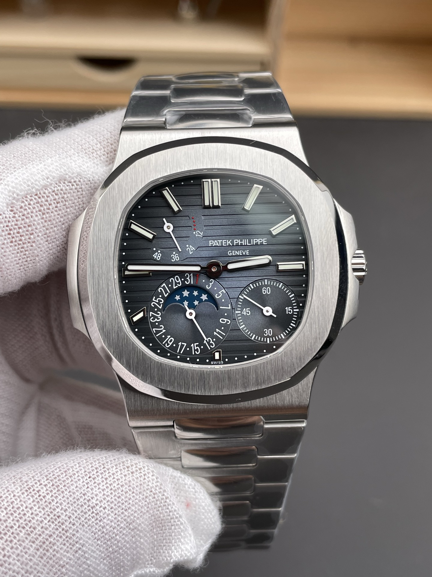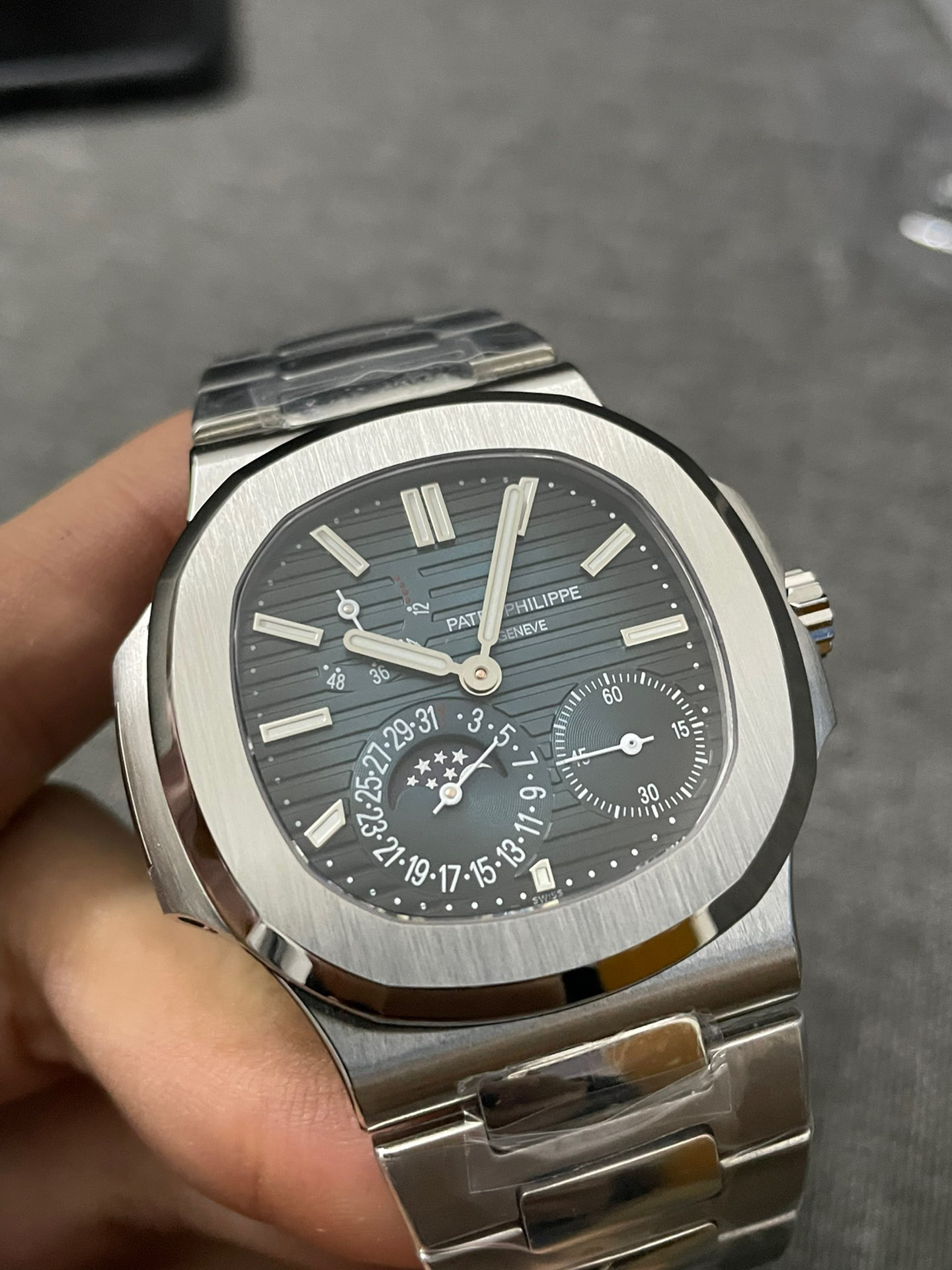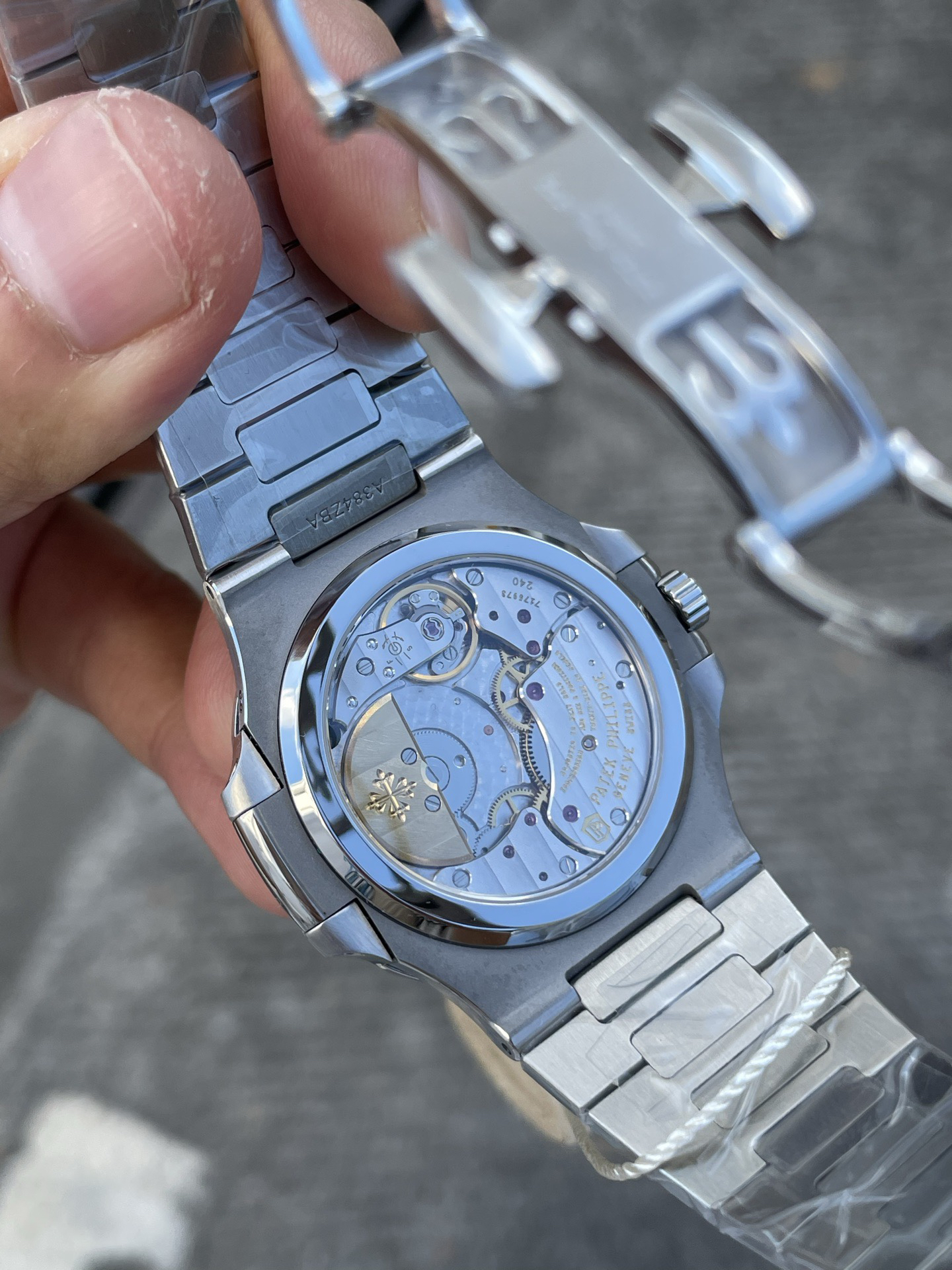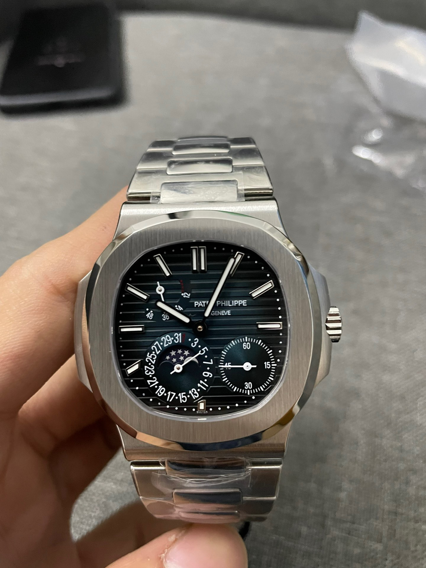 Noob潜心三年 真"芯"之作!百达翡丽PP5712GR"钢王之王"巅峰出道了!这是真正具有里程碑意义的超级一体机芯Cal.240 PS IRM C LU。全机芯零件数265个,平面游丝,21600每小时振荡次数 Gyromax带调节砝码的摆轮,稳定无误差。(不同于市面上现有的假机芯盖甲板,假珍珠陀) 全新修正的不锈钢表带,铰链部分根据真正的百达翡丽鹦鹉螺不锈钢表带拆解开发,和正品一致的贴合效果,逆袭市面上所有副本,铰链开合角度和正品一致,锁毕声音和正品相同。而PPF厂独家的"蓝魅"面无限接近接近原版,更是傲视群雄!