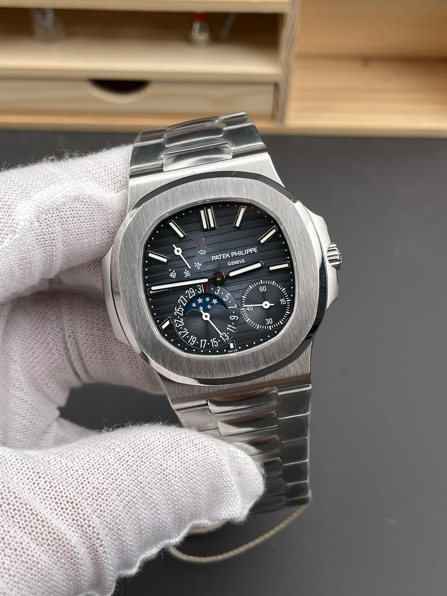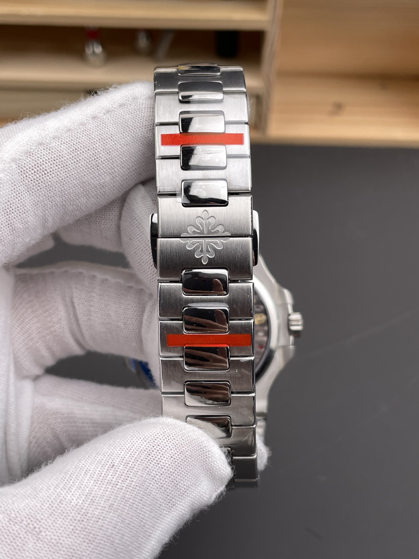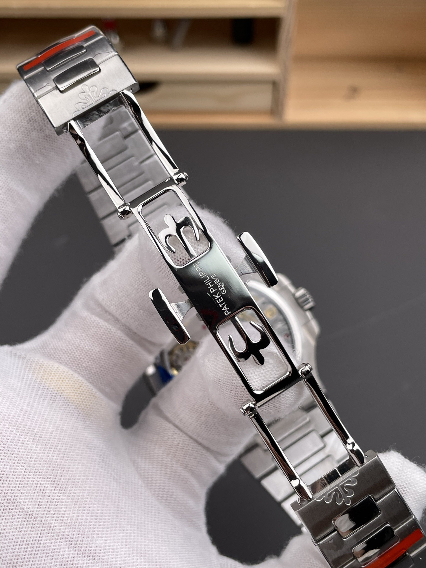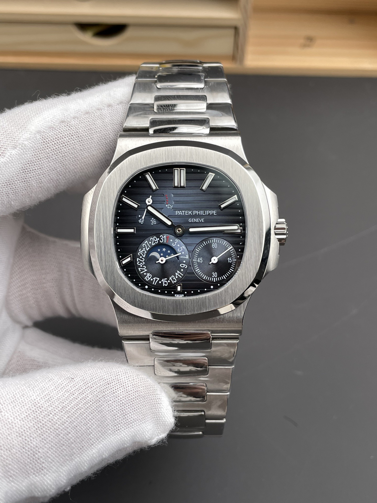 Noob潜心三年 真"芯"之作!百达翡丽PP5712GR"钢王之王"巅峰出道了!这是真正具有里程碑意义的超级一体机芯Cal.240 PS IRM C LU。全机芯零件数265个,平面游丝,21600每小时振荡次数 Gyromax带调节砝码的摆轮,稳定无误差。(不同于市面上现有的假机芯盖甲板,假珍珠陀) 全新修正的不锈钢表带,铰链部分根据真正的百达翡丽鹦鹉螺不锈钢表带拆解开发,和正品一致的贴合效果,逆袭市面上所有副本,铰链开合角度和正品一致,锁毕声音和正品相同。而PPF厂独家的"蓝魅"面无限接近接近原版,更是傲视群雄!