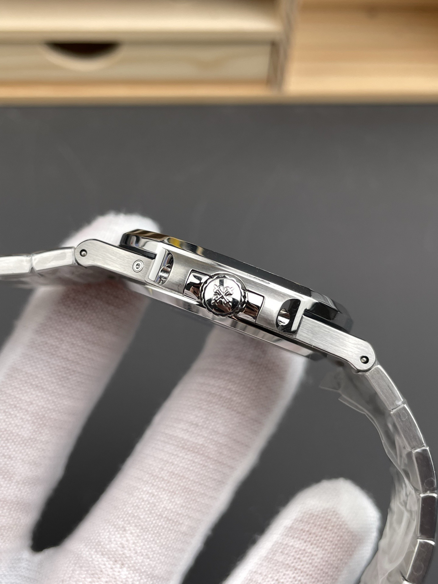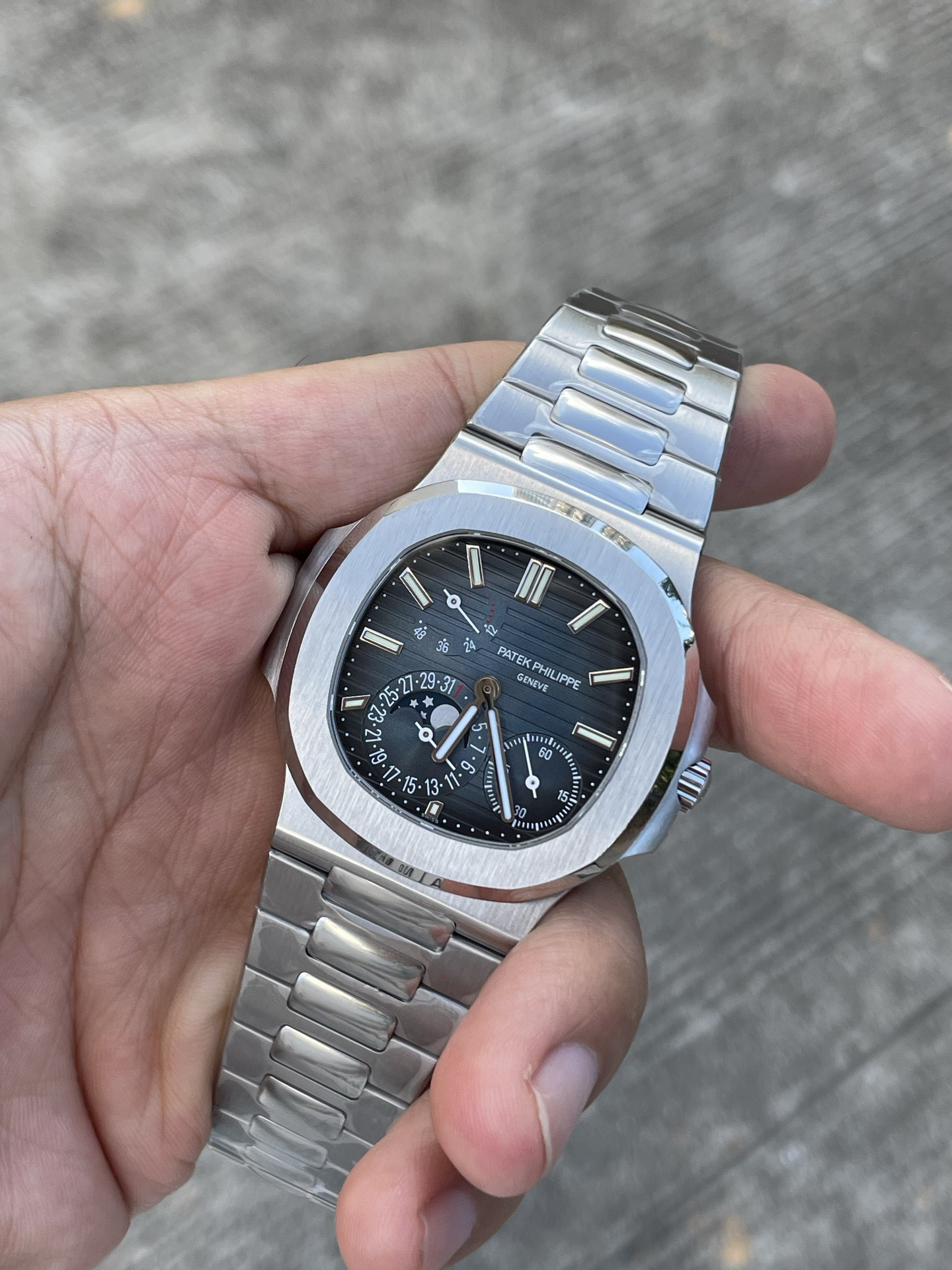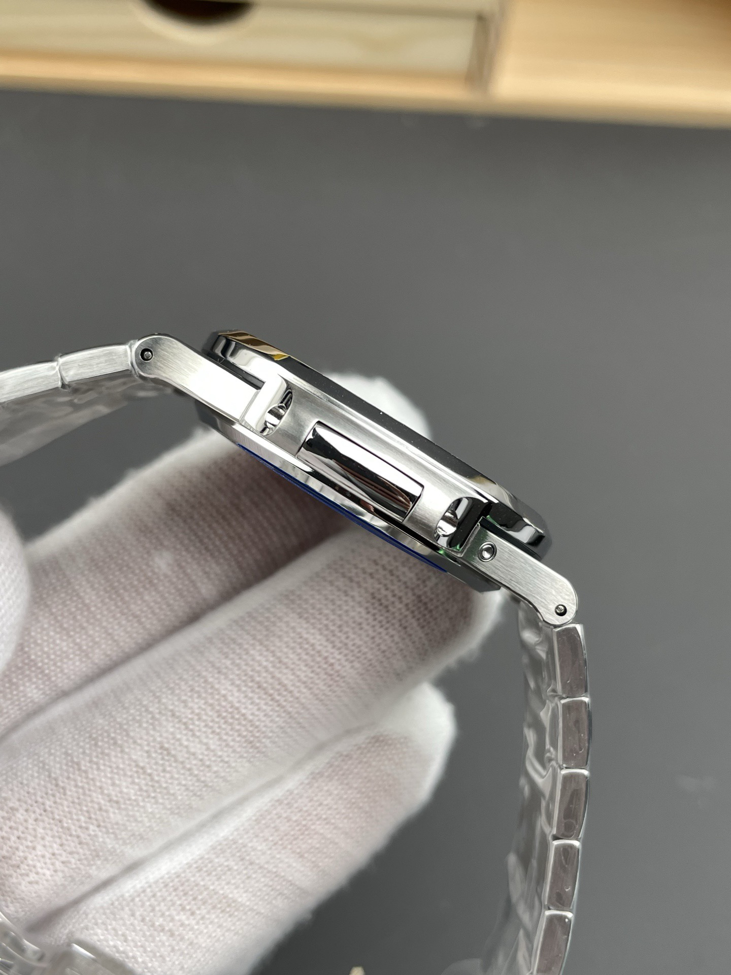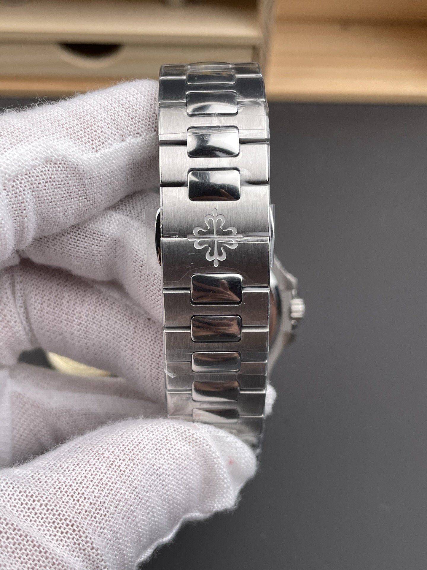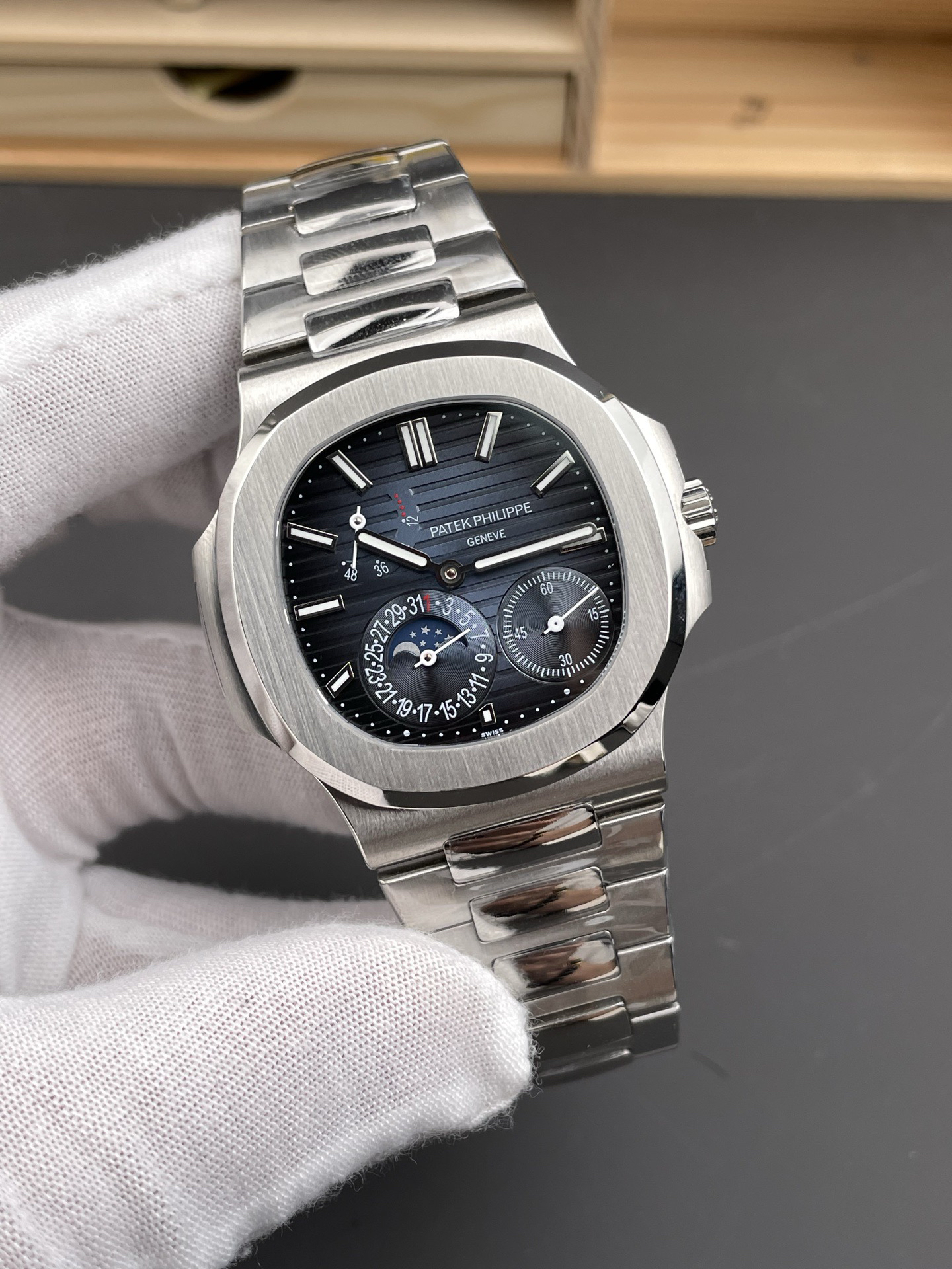 Noob潜心三年 真"芯"之作!百达翡丽PP5712GR"钢王之王"巅峰出道了!这是真正具有里程碑意义的超级一体机芯Cal.240 PS IRM C LU。全机芯零件数265个,平面游丝,21600每小时振荡次数 Gyromax带调节砝码的摆轮,稳定无误差。(不同于市面上现有的假机芯盖甲板,假珍珠陀) 全新修正的不锈钢表带,铰链部分根据真正的百达翡丽鹦鹉螺不锈钢表带拆解开发,和正品一致的贴合效果,逆袭市面上所有副本,铰链开合角度和正品一致,锁毕声音和正品相同。而PPF厂独家的"蓝魅"面无限接近接近原版,更是傲视群雄!