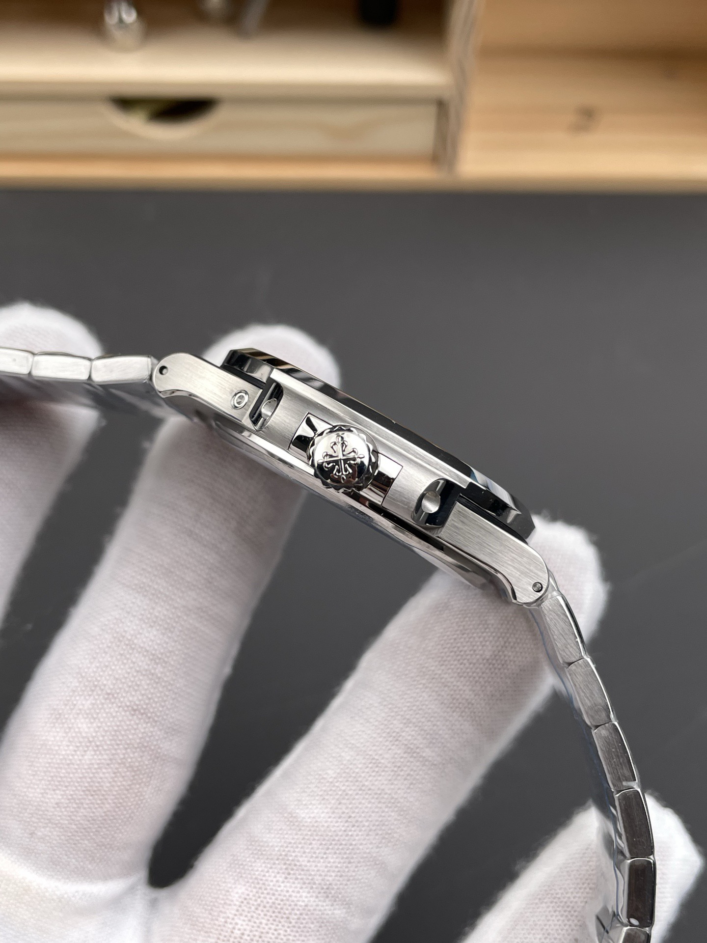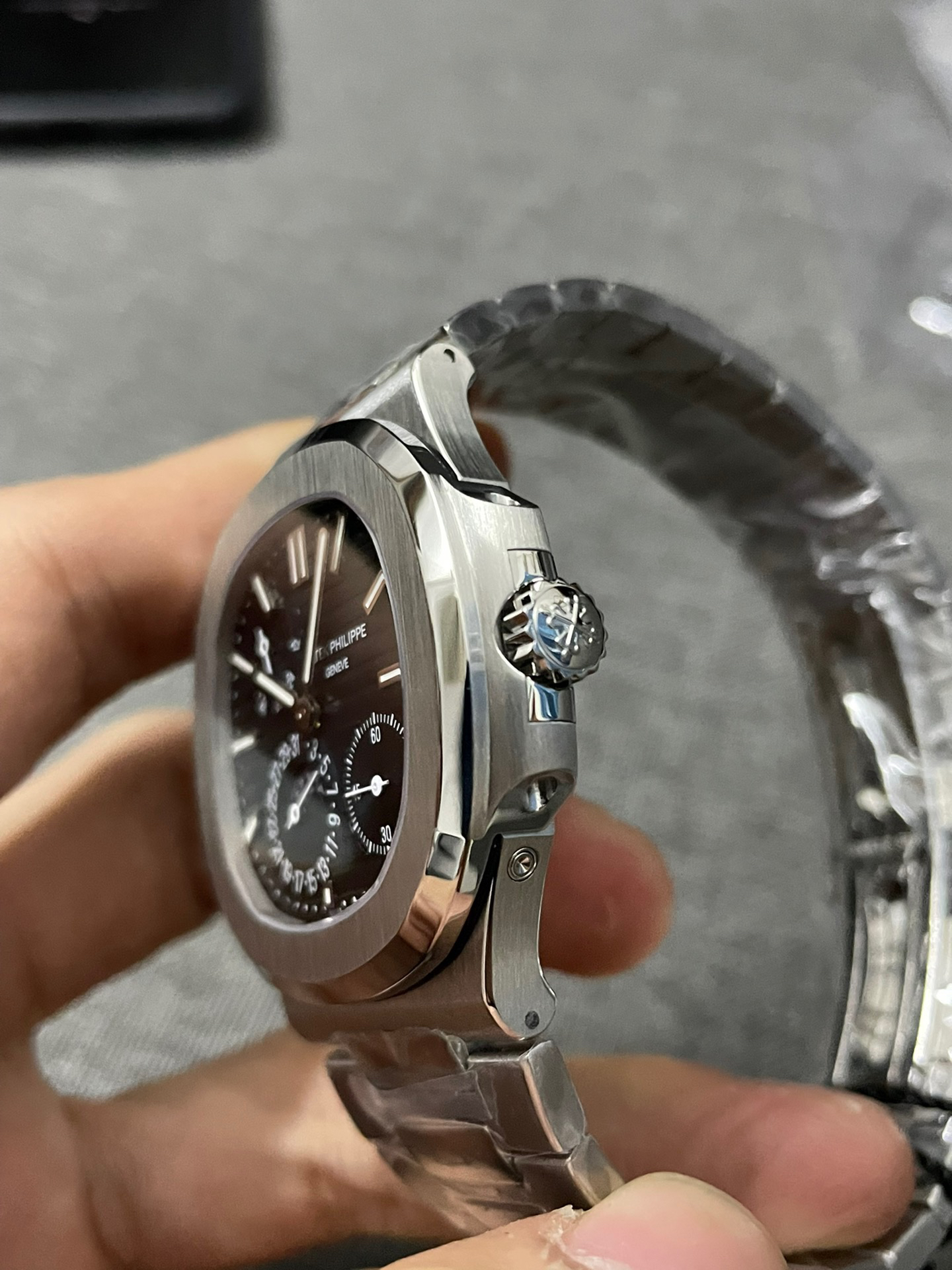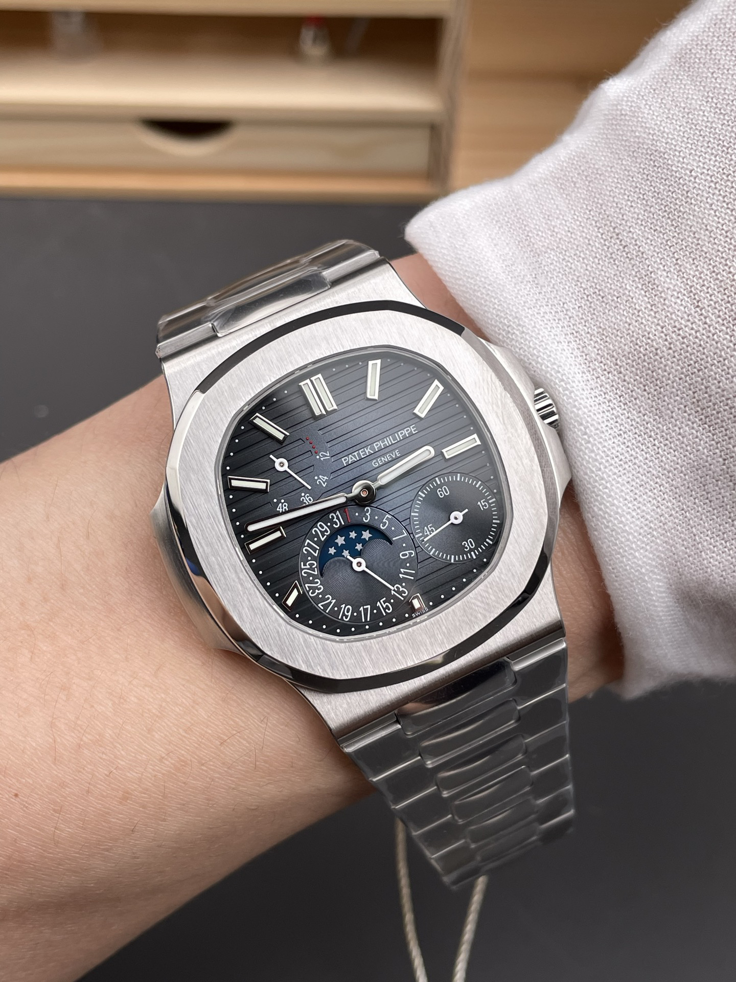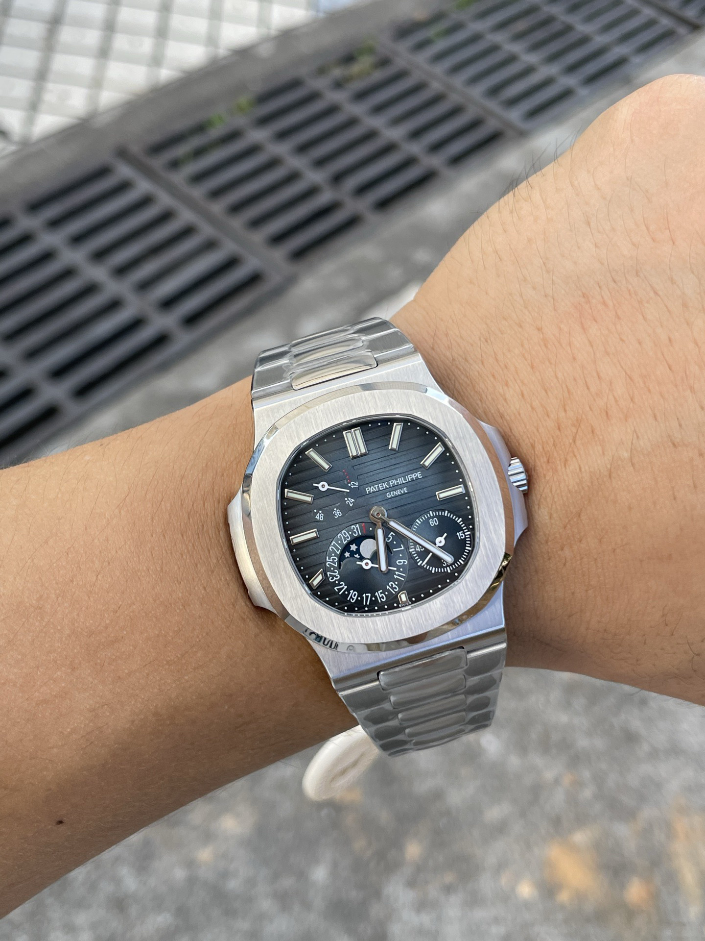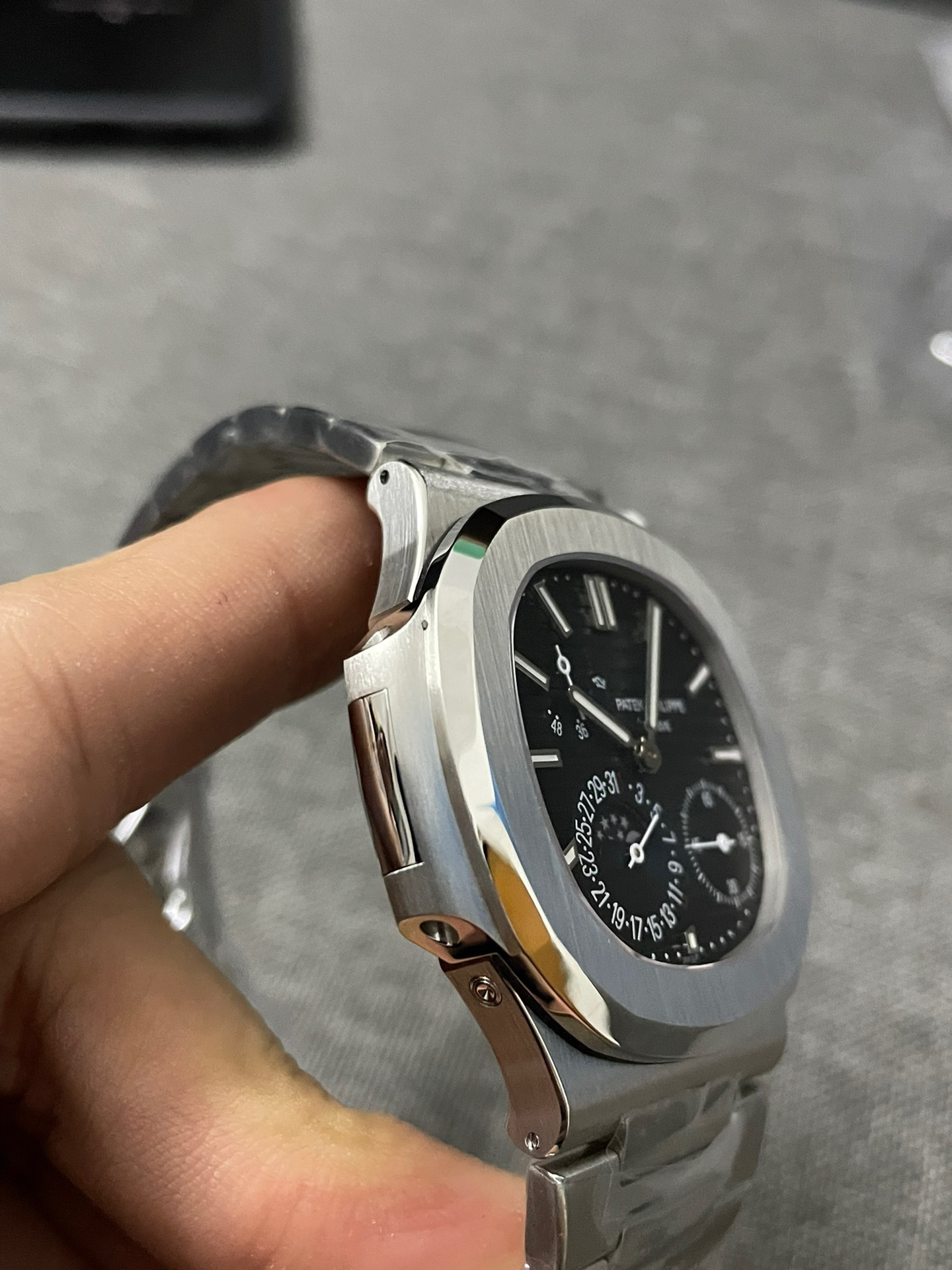 Noob潜心三年 真"芯"之作!百达翡丽PP5712GR"钢王之王"巅峰出道了!这是真正具有里程碑意义的超级一体机芯Cal.240 PS IRM C LU。全机芯零件数265个,平面游丝,21600每小时振荡次数 Gyromax带调节砝码的摆轮,稳定无误差。(不同于市面上现有的假机芯盖甲板,假珍珠陀) 全新修正的不锈钢表带,铰链部分根据真正的百达翡丽鹦鹉螺不锈钢表带拆解开发,和正品一致的贴合效果,逆袭市面上所有副本,铰链开合角度和正品一致,锁毕声音和正品相同。而PPF厂独家的"蓝魅"面无限接近接近原版,更是傲视群雄!
