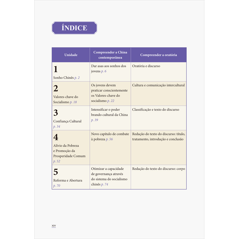 《葡萄牙语演讲教程》共10个单元。各单元课文选自《习近平谈治国理政》第一卷、第二卷、第三卷的葡文版。每单元探讨习近平新时代中国特色社会主义思想的一个或多个重要方面。单元标题为:1)我的中国梦;2)文化建设;3)脱贫攻坚;4)中国的改革开放;5)生态文明;6)中国特色大国外交;7)“一带一路”建设;8)人类命运共同体;9)社会主义法治国家;10)中国共产党的自我革命。