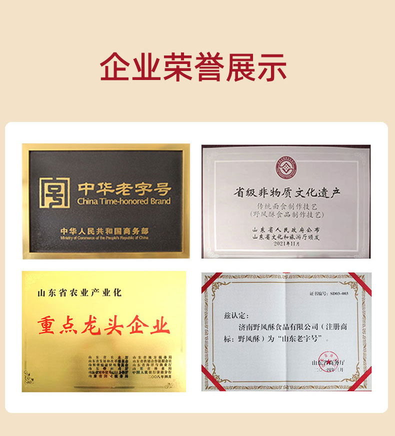 - 济南野风酥食品有限公司是一家从事绿色无公害农产品深加工,生产山东特产食品的企业。职工总人数586人,其中高中级技术人员56人。2007年济南野风酥食品有限公司被山东省人民政府授予省级农业产业化经营重点龙头企业。我公司生产的糖酥煎饼等系列产品曾连续获农业部、山东省优质产品奖,被人民大会堂定为国宴用品。“九顶塔”牌商标获得“省优”“部优”商标称号。全国著名的营养学家于若木曾来厂视察并亲笔题词,姜春云、苏毅然等国家、省级领导先后来厂视察。“野风酥”被中国食品协会评为“优秀民族食品”,获得“中华名吃”称号。产品连续获得国家级食品展销会的畅销产品奖,成为山东省的特色食品,省、市旅游局的十佳旅游商品。“山东煎饼”和“山东烧饼” 被认证为绿色食品。