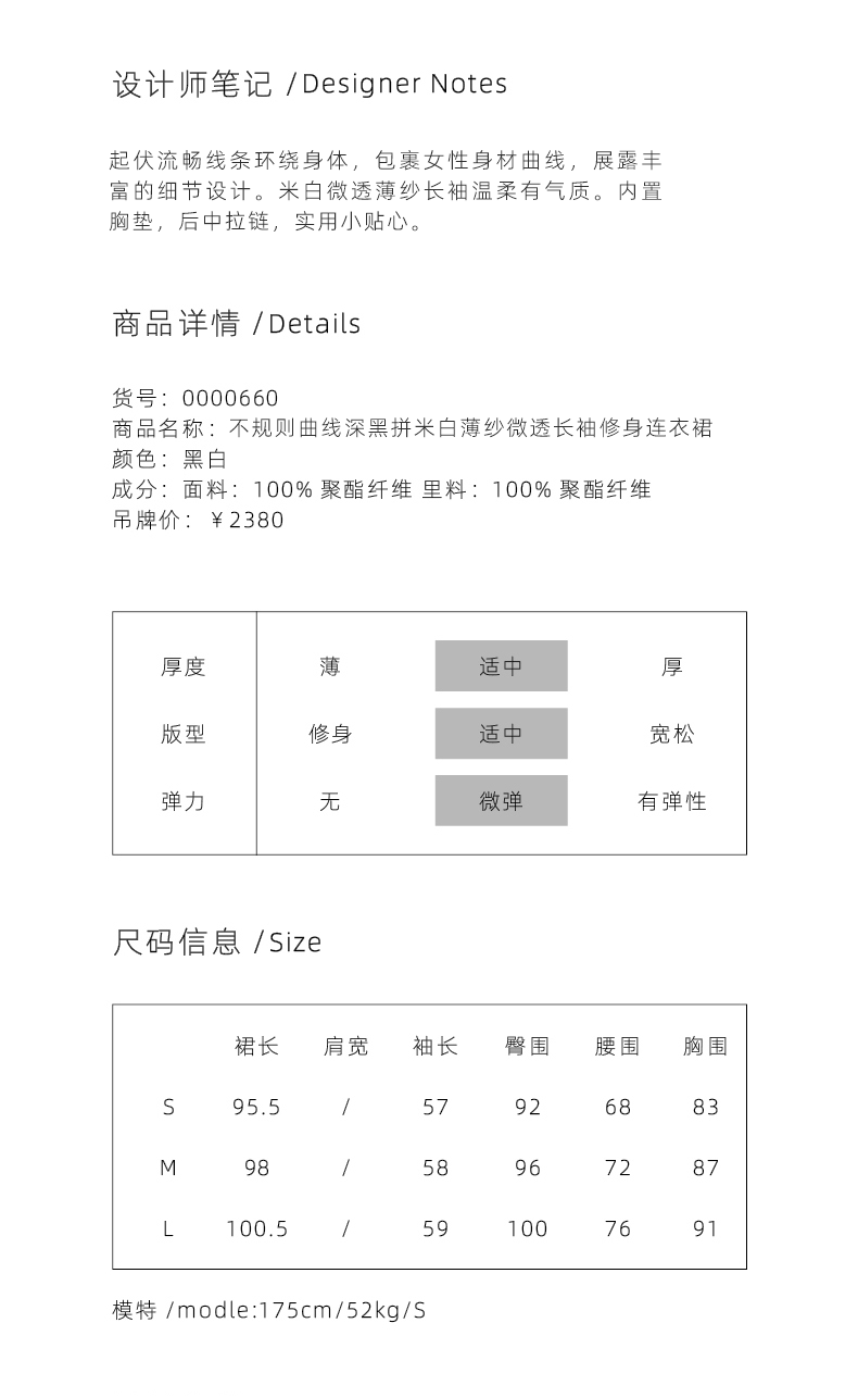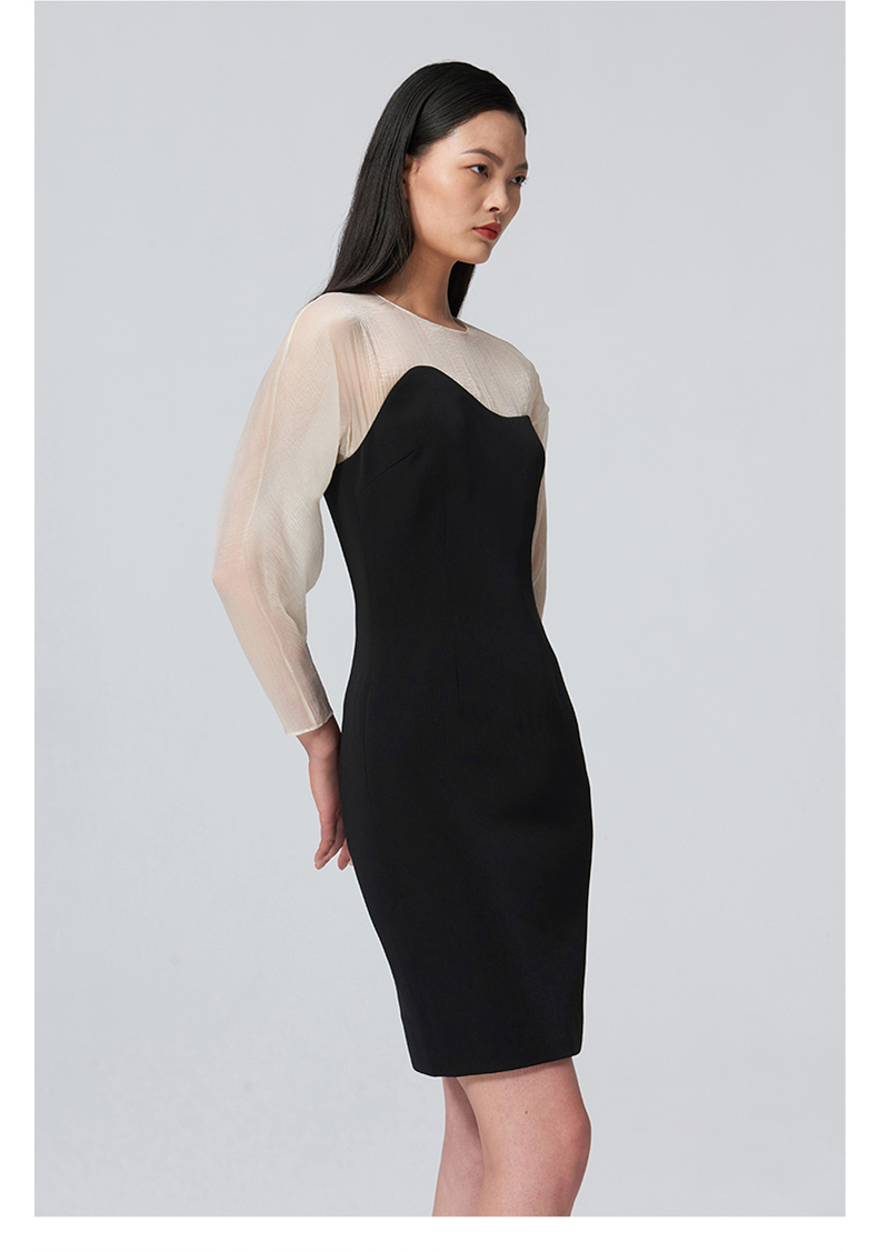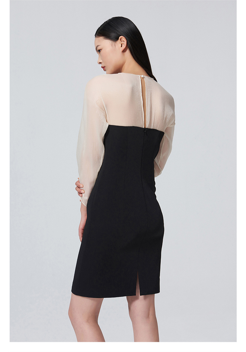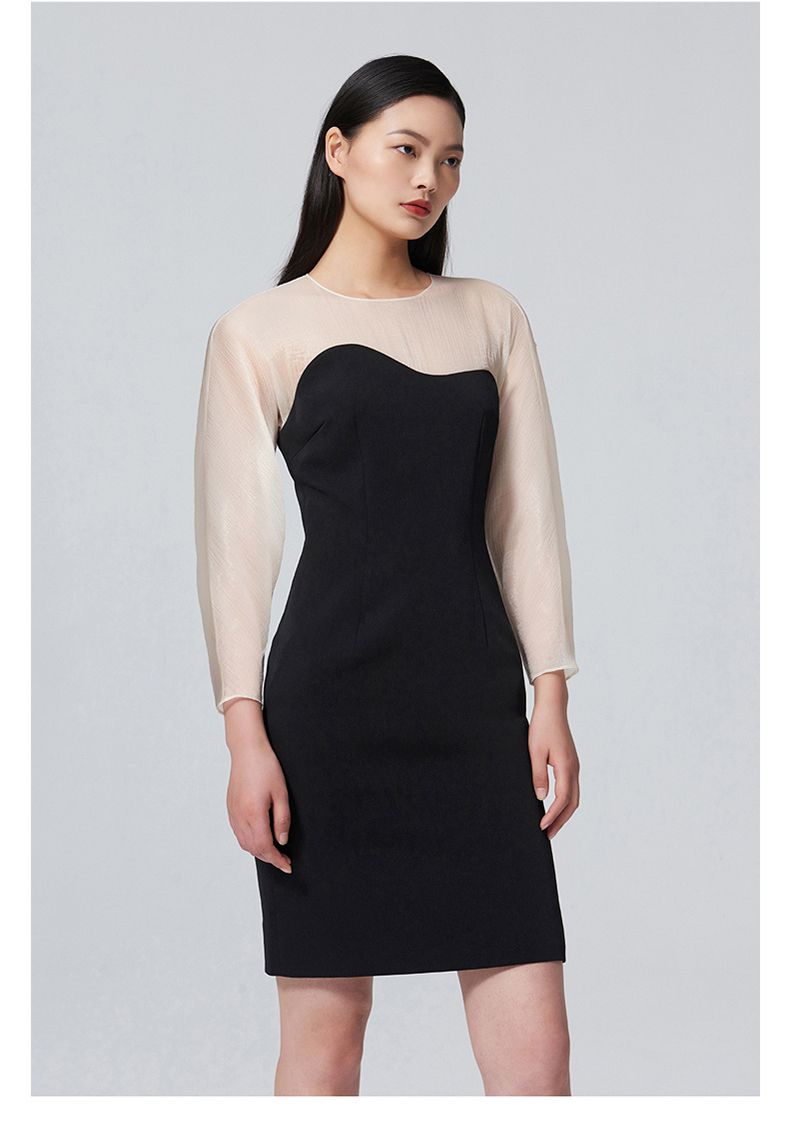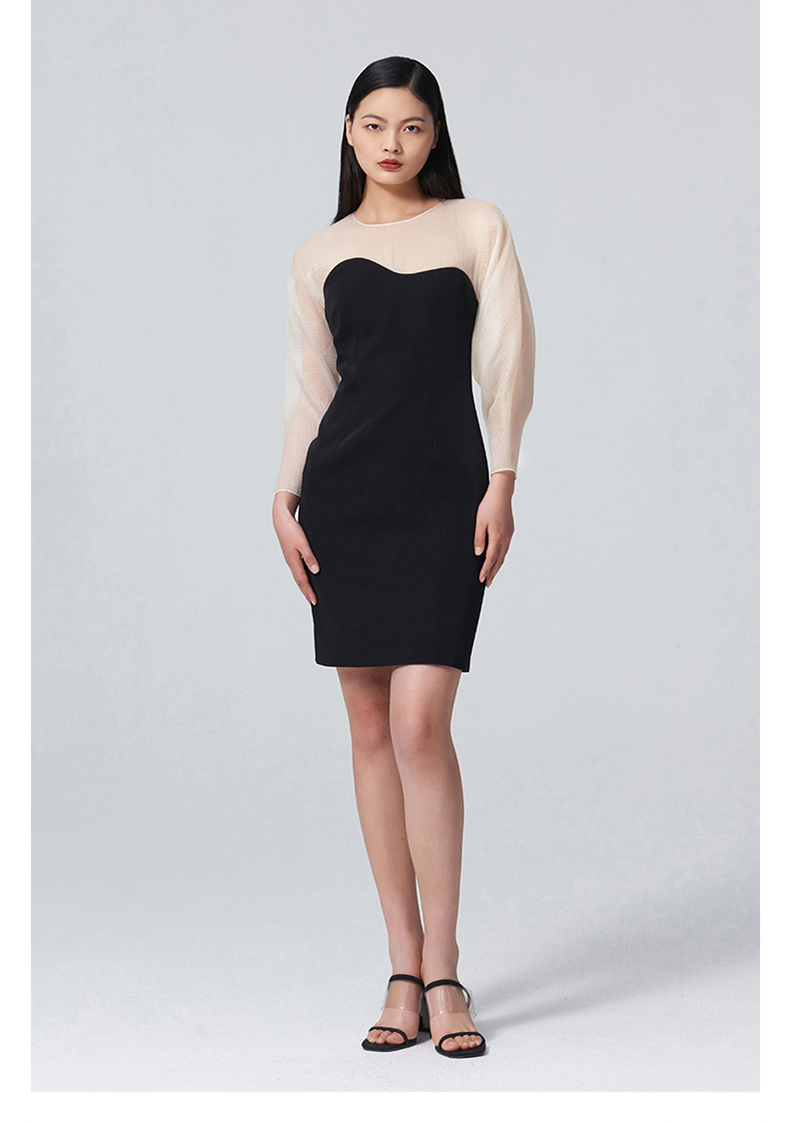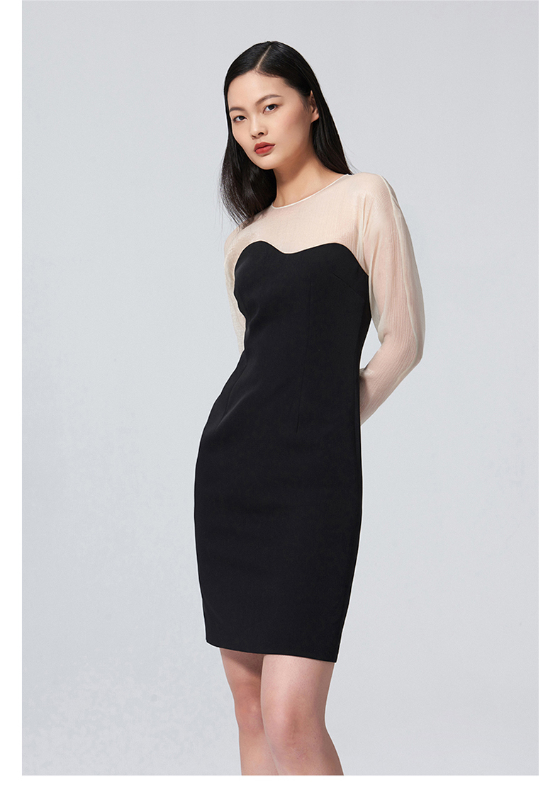 【旺角卡门】不规则曲线黑拼米白薄纱透视长袖修身连衣裙/0000660