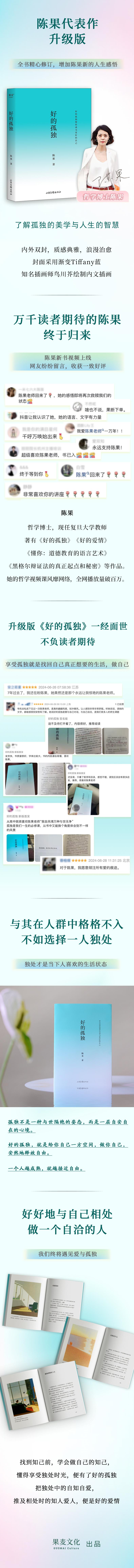 《好的孤独》是一本哲学通俗读物,精选了哲学博士陈果十多年的生活思考与教学心得,囊括了她的思想精髓。整本书包含了很多孤独者对生活、对生命、对自我、对世界的困惑与追问,陈果用八个章节循序渐进,为孤独者指出了一条逻辑自洽的明路:好的孤独,让你更懂自己,成为更好的自己。