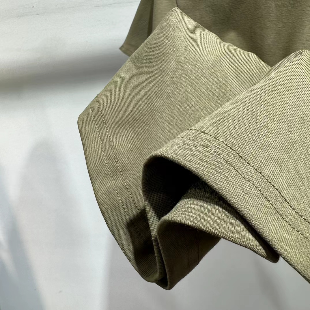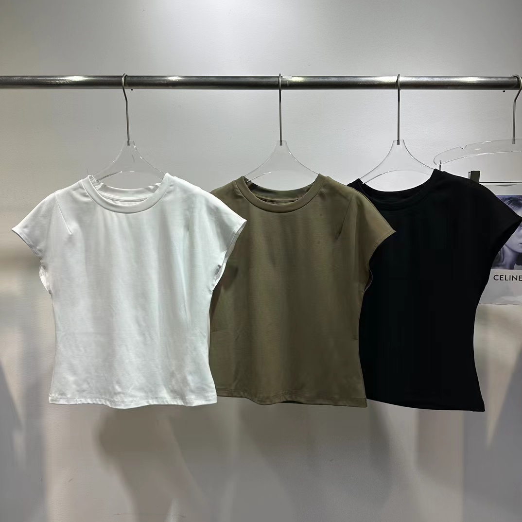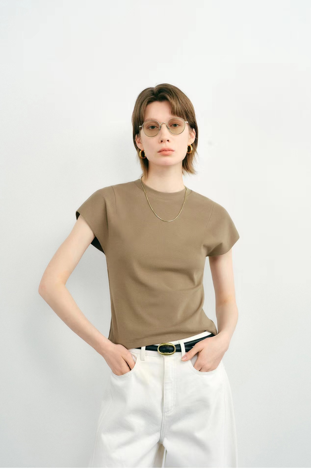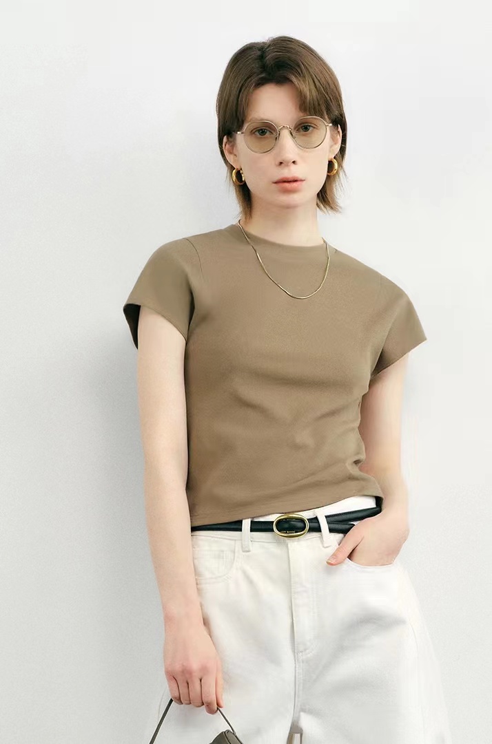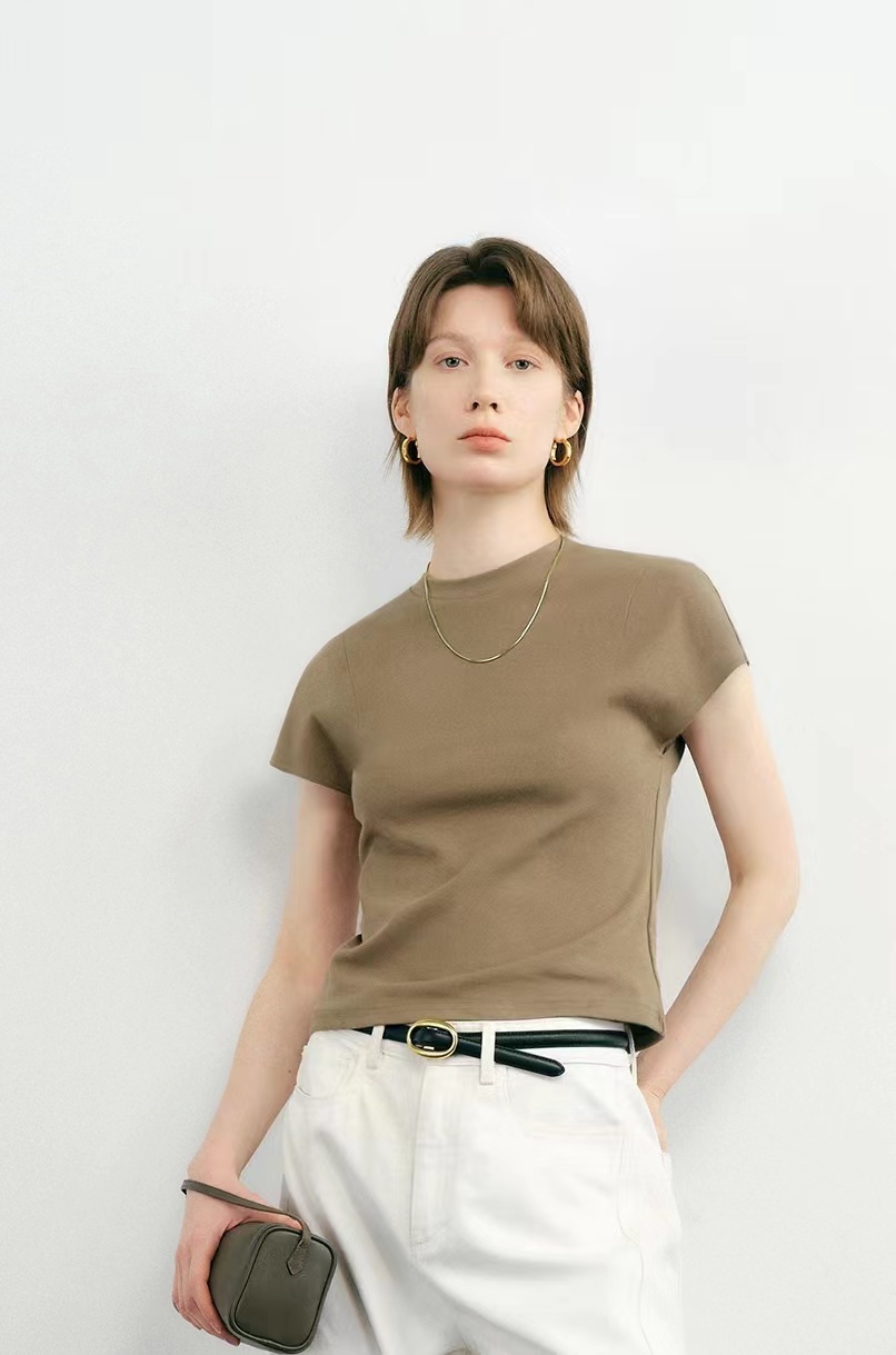 经典圆领/小飞袖设计/双针线工艺。圆领设计,领圈采用本布面料