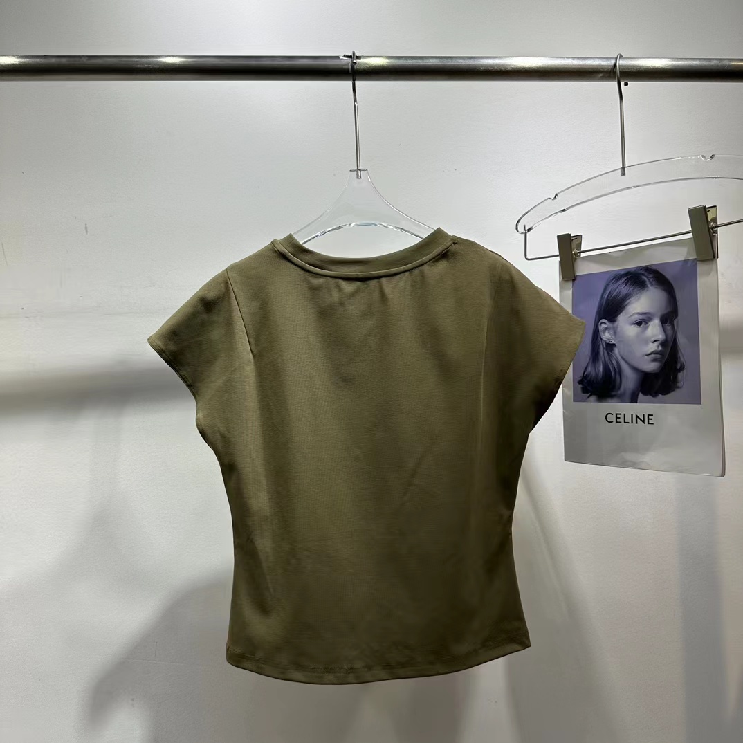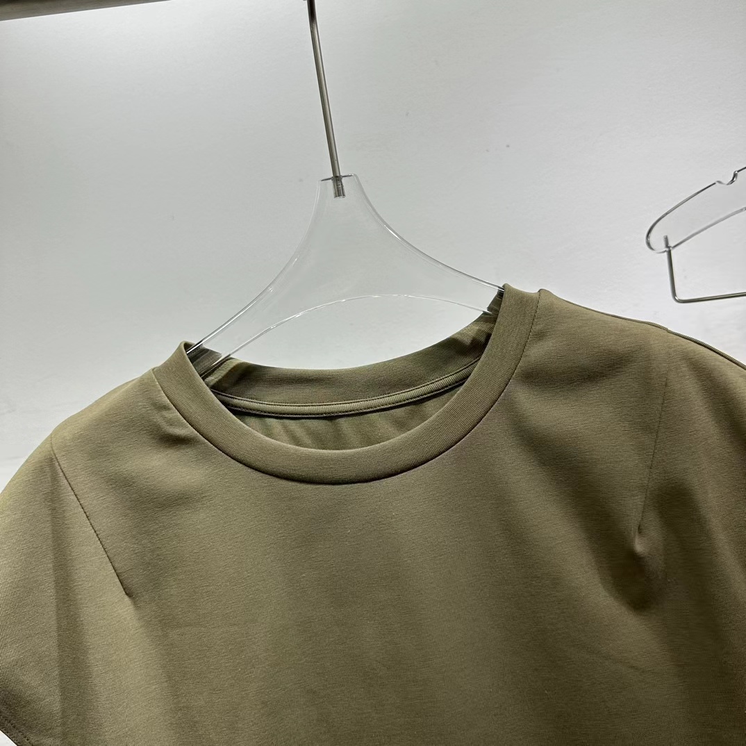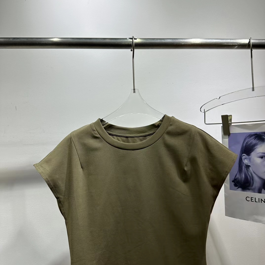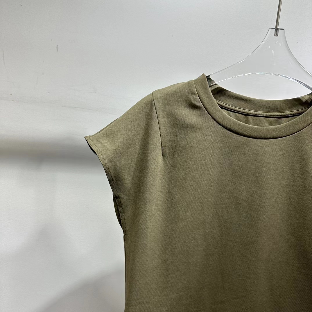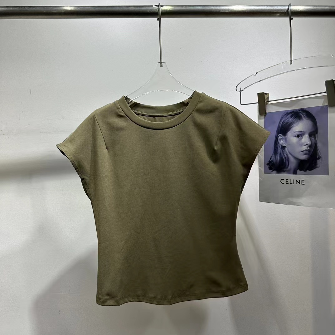 经典圆领/小飞袖设计/双针线工艺。圆领设计,领圈采用本布面料