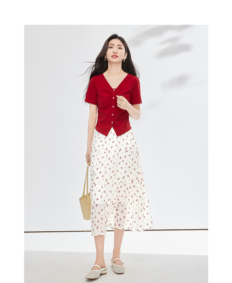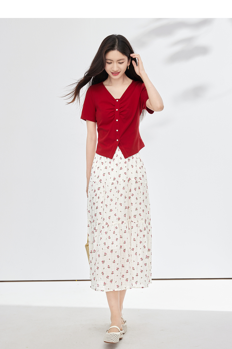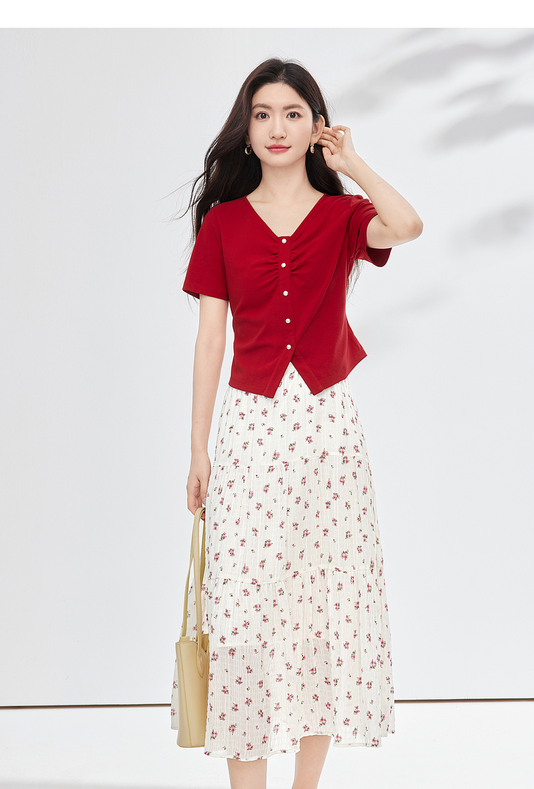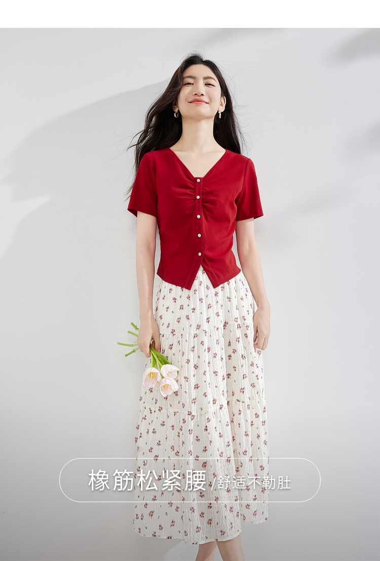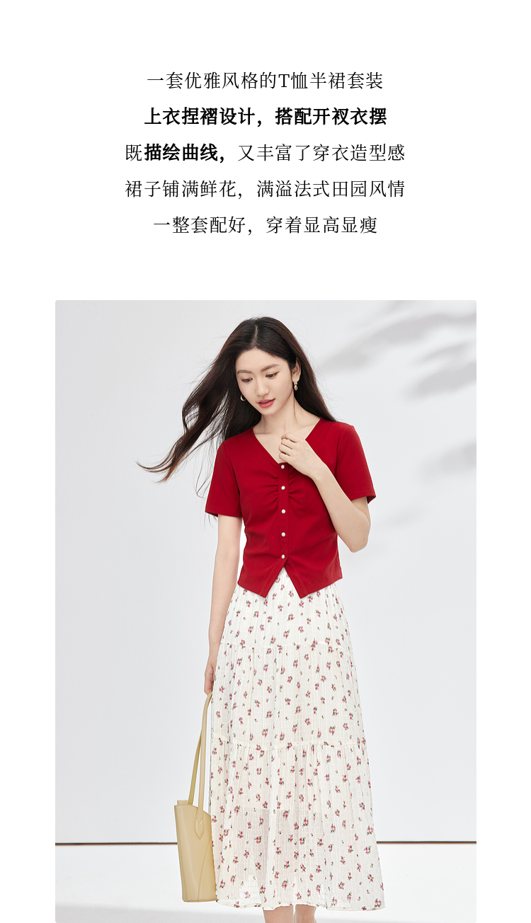 【07/23新品】熙世界法式田园风穿搭套装女夏装褶皱收腰V领T恤碎花半身裙两件套