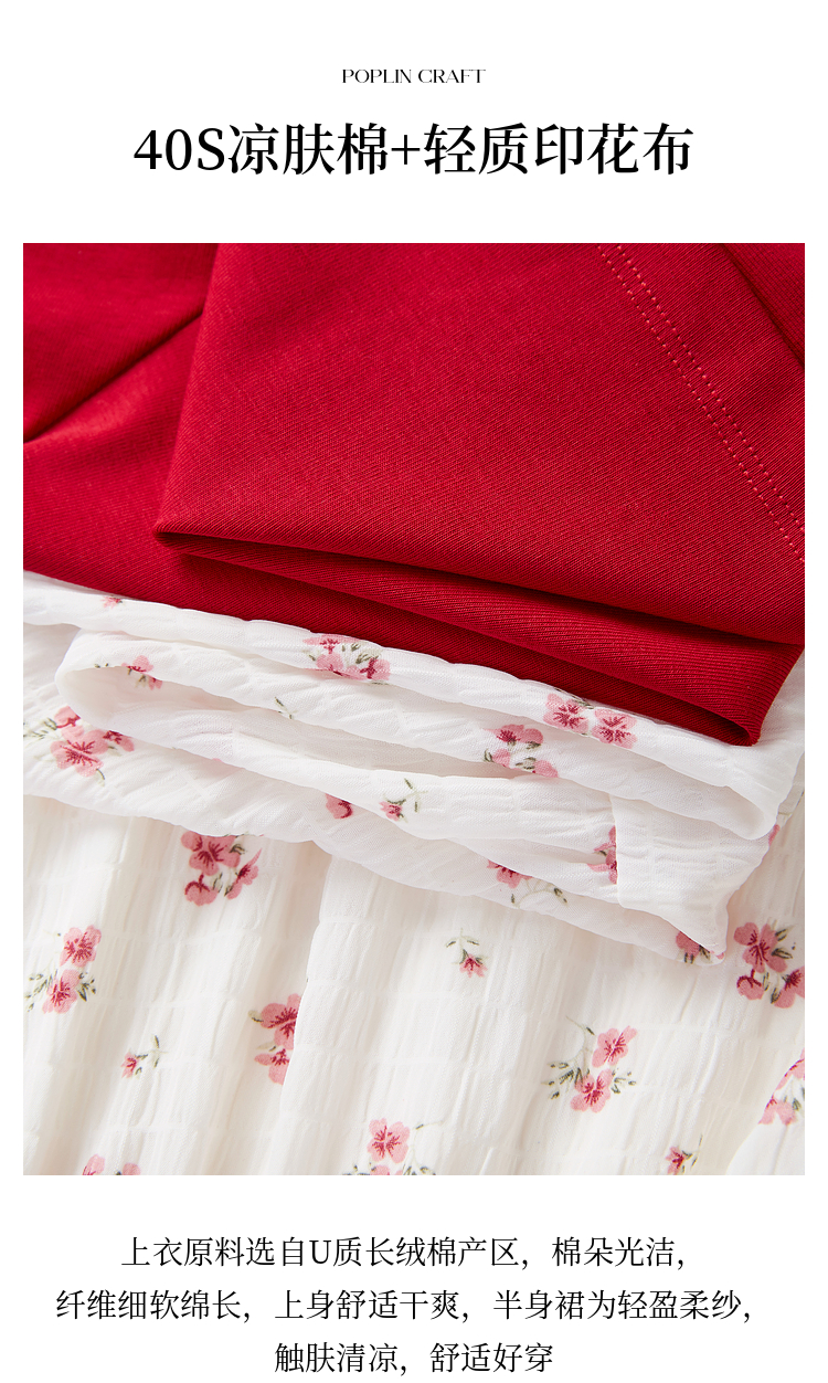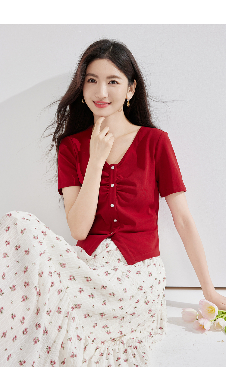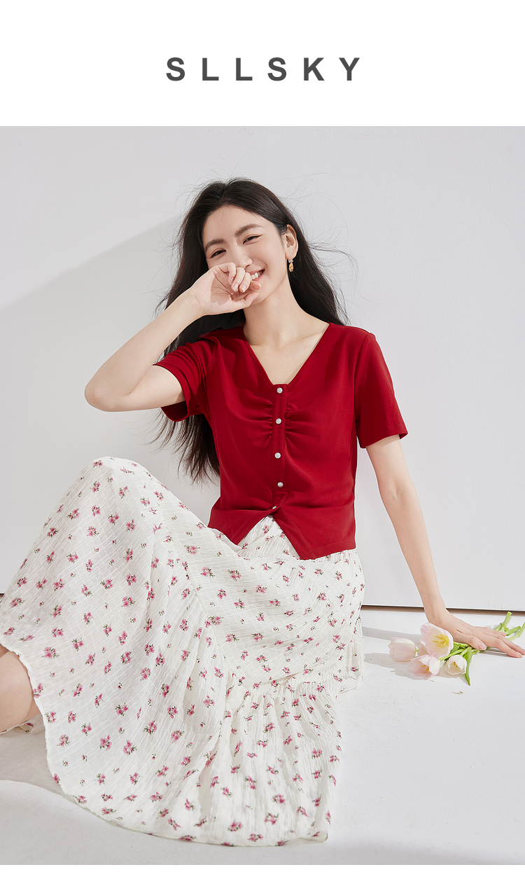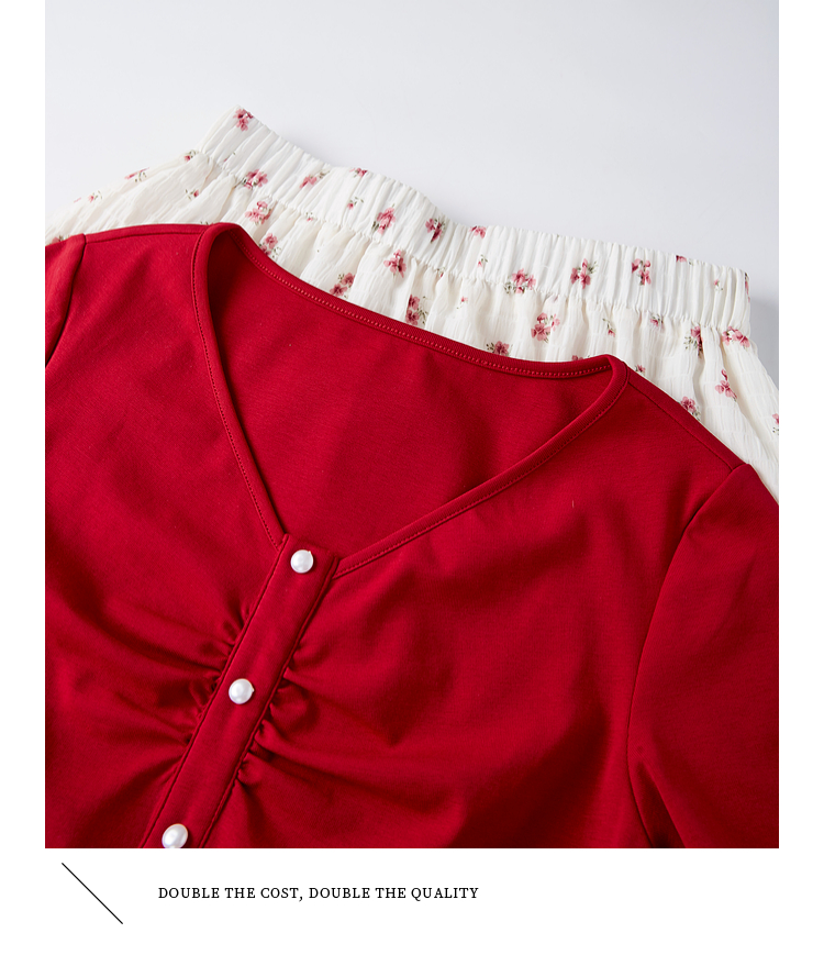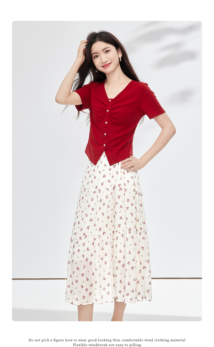 【07/23新品】熙世界法式田园风穿搭套装女夏装褶皱收腰V领T恤碎花半身裙两件套