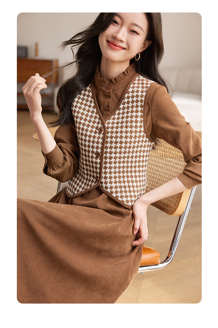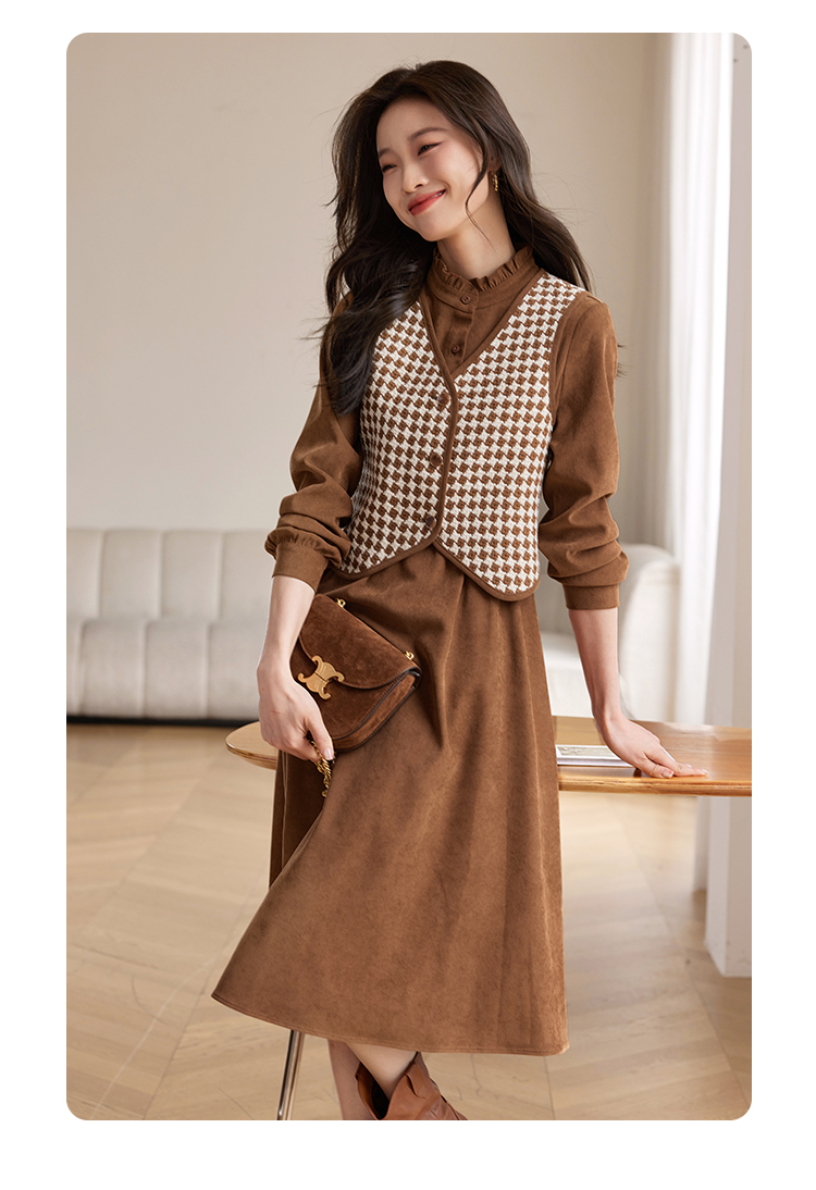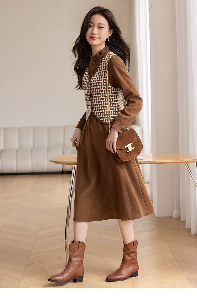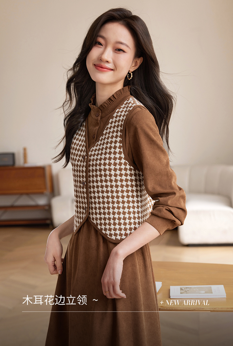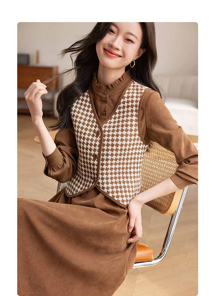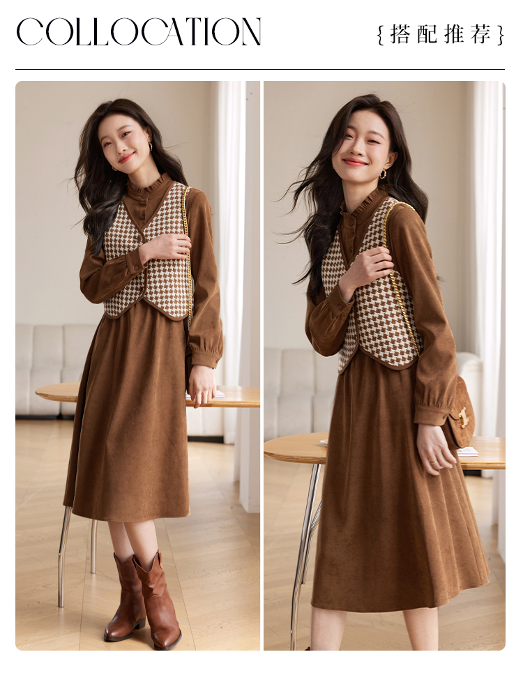 【年终特卖】熙世界美拉德穿搭秋冬新款千鸟格马甲磨绒连衣裙两件套装