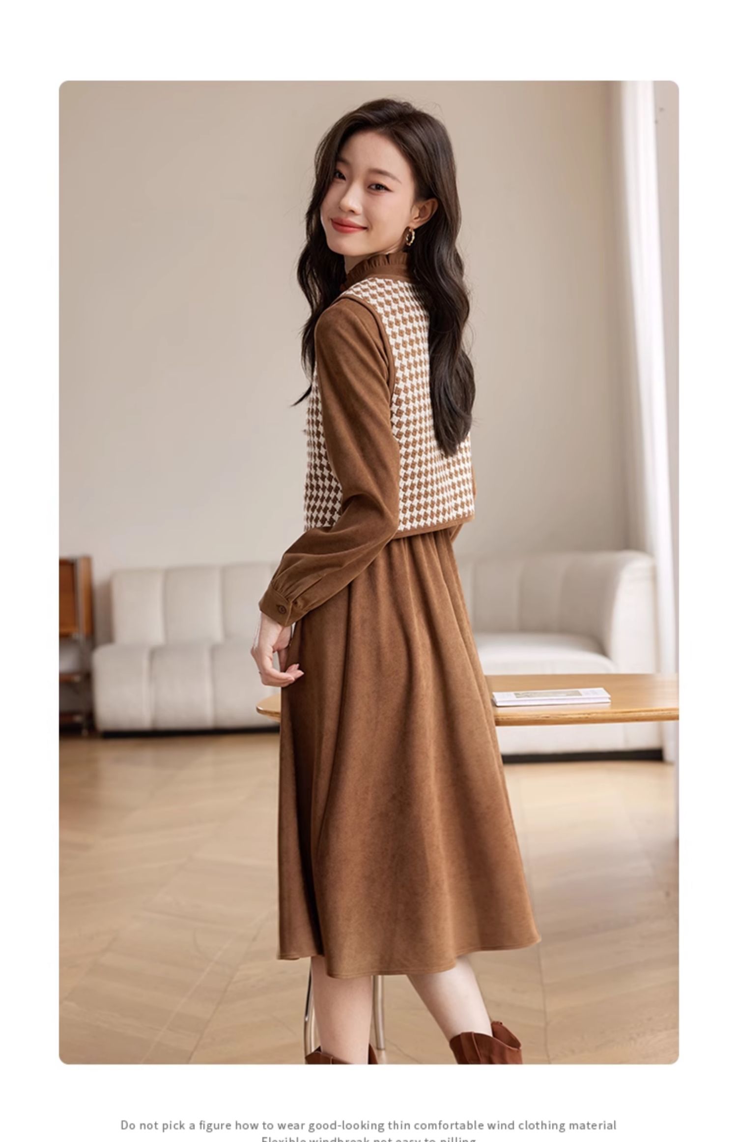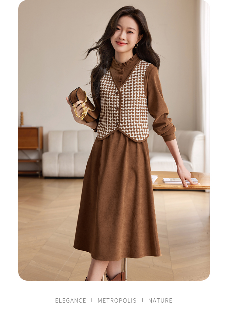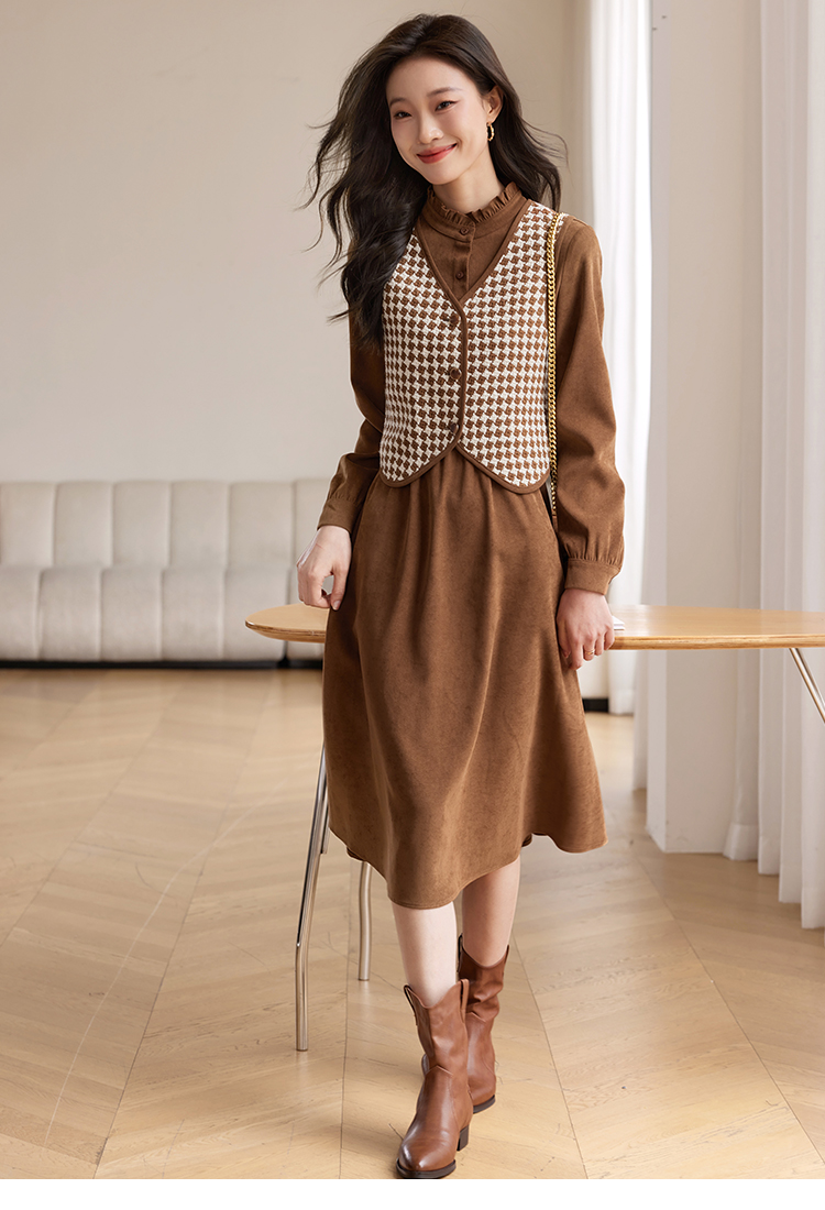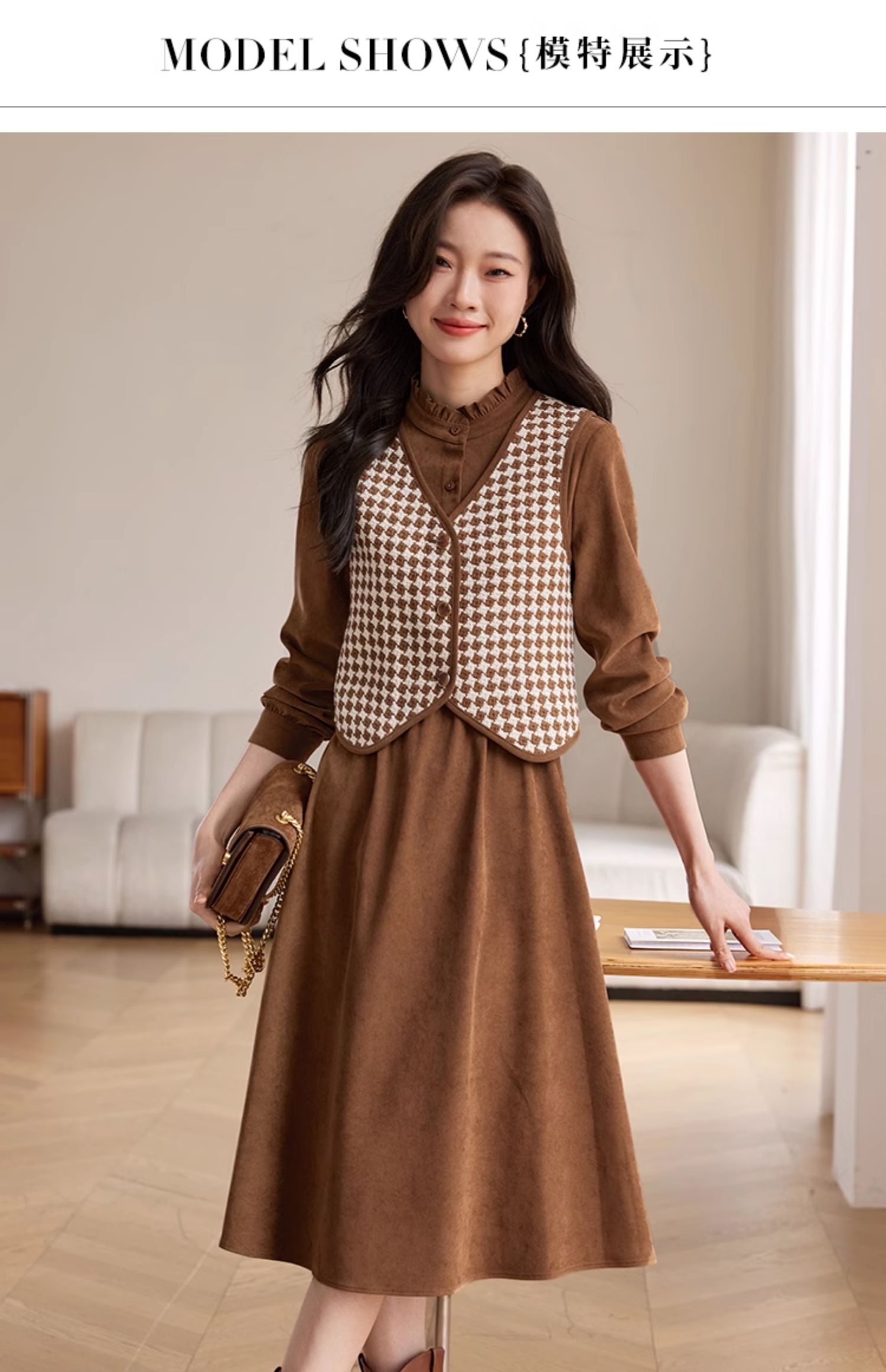 【年终特卖】熙世界美拉德穿搭秋冬新款千鸟格马甲磨绒连衣裙两件套装