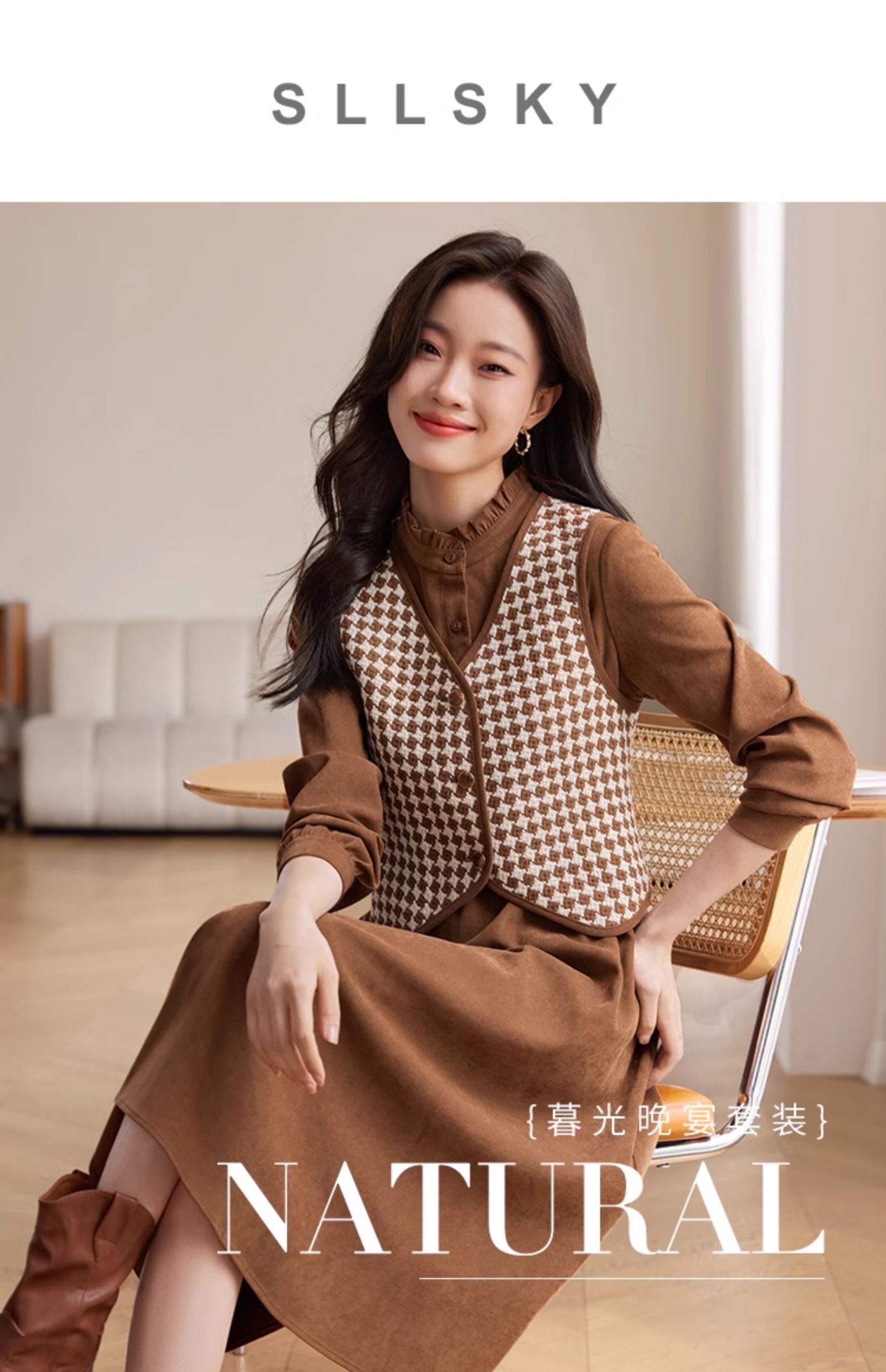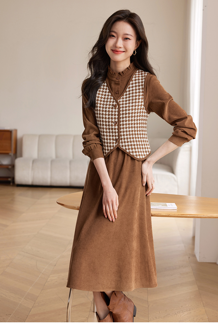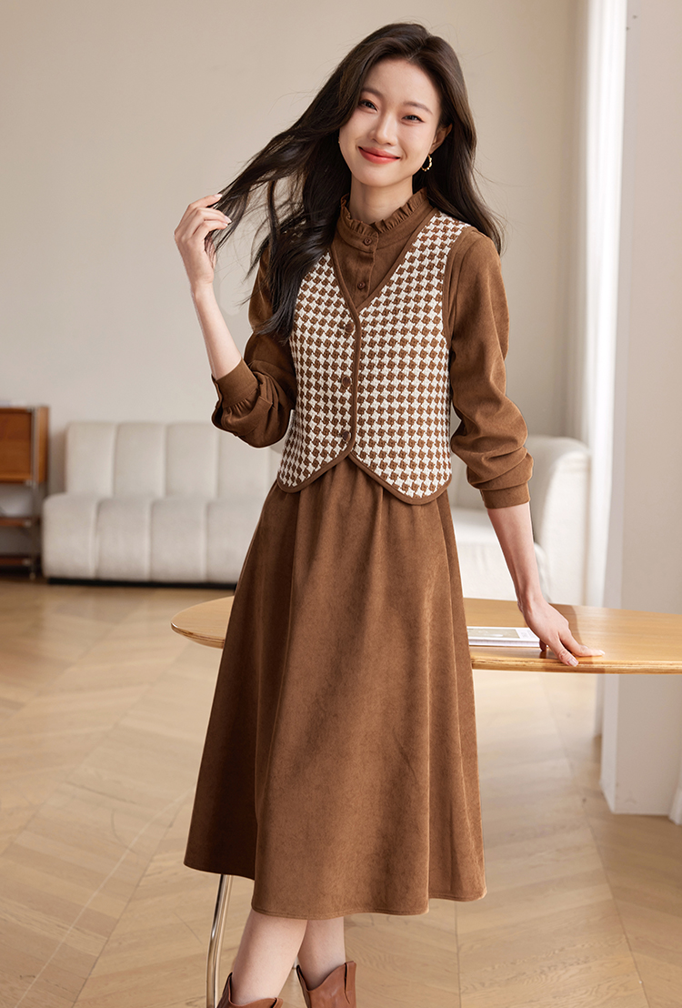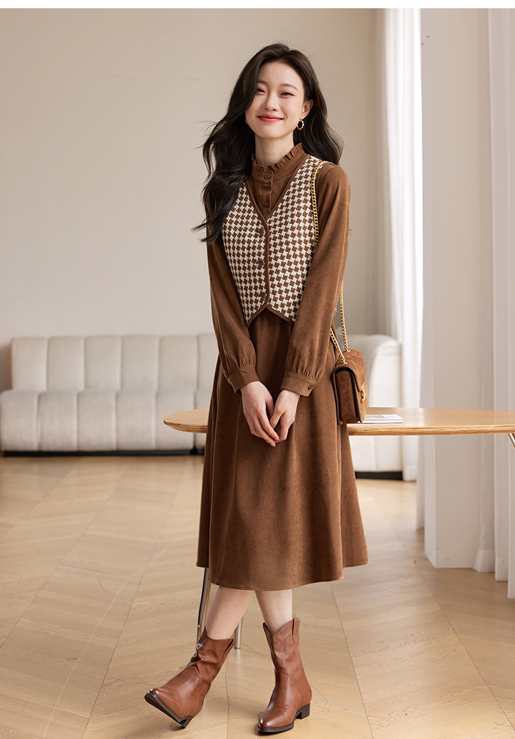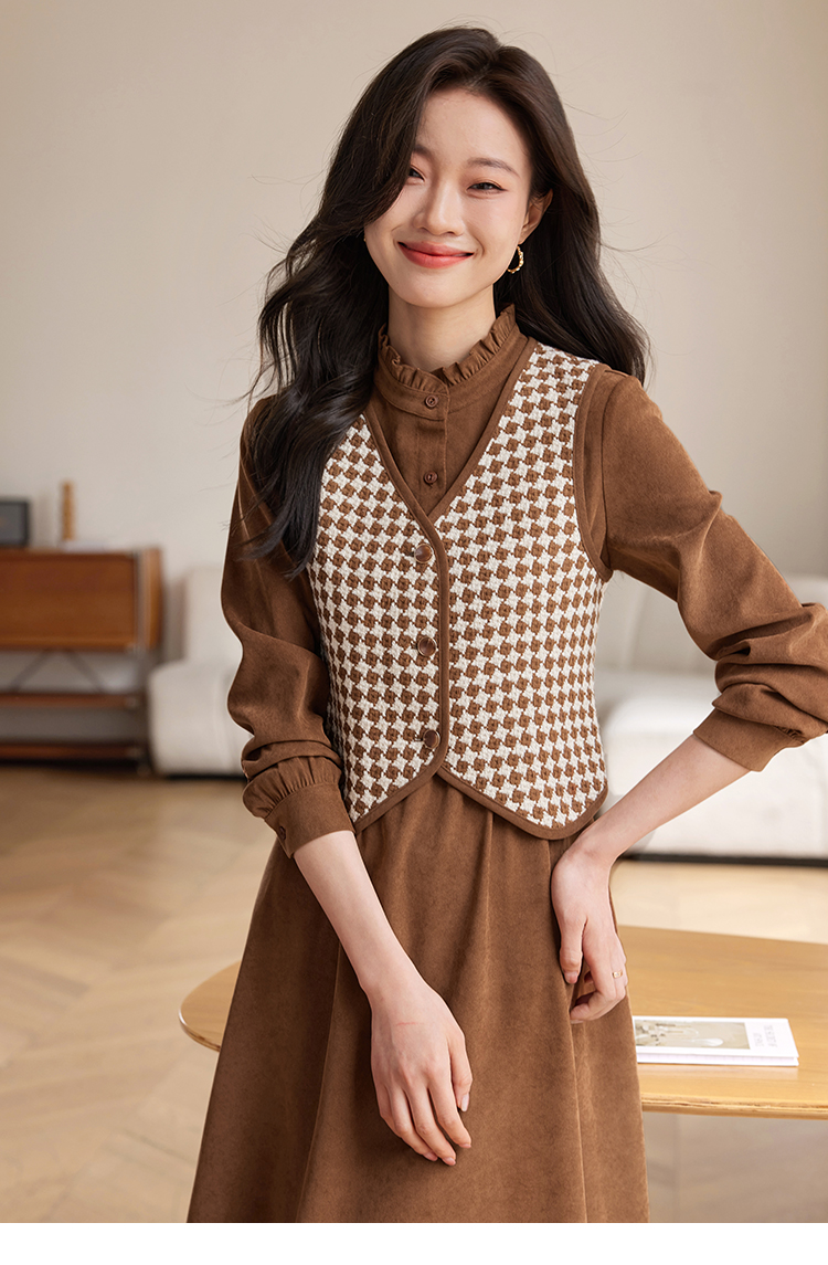 【年终特卖】熙世界美拉德穿搭秋冬新款千鸟格马甲磨绒连衣裙两件套装