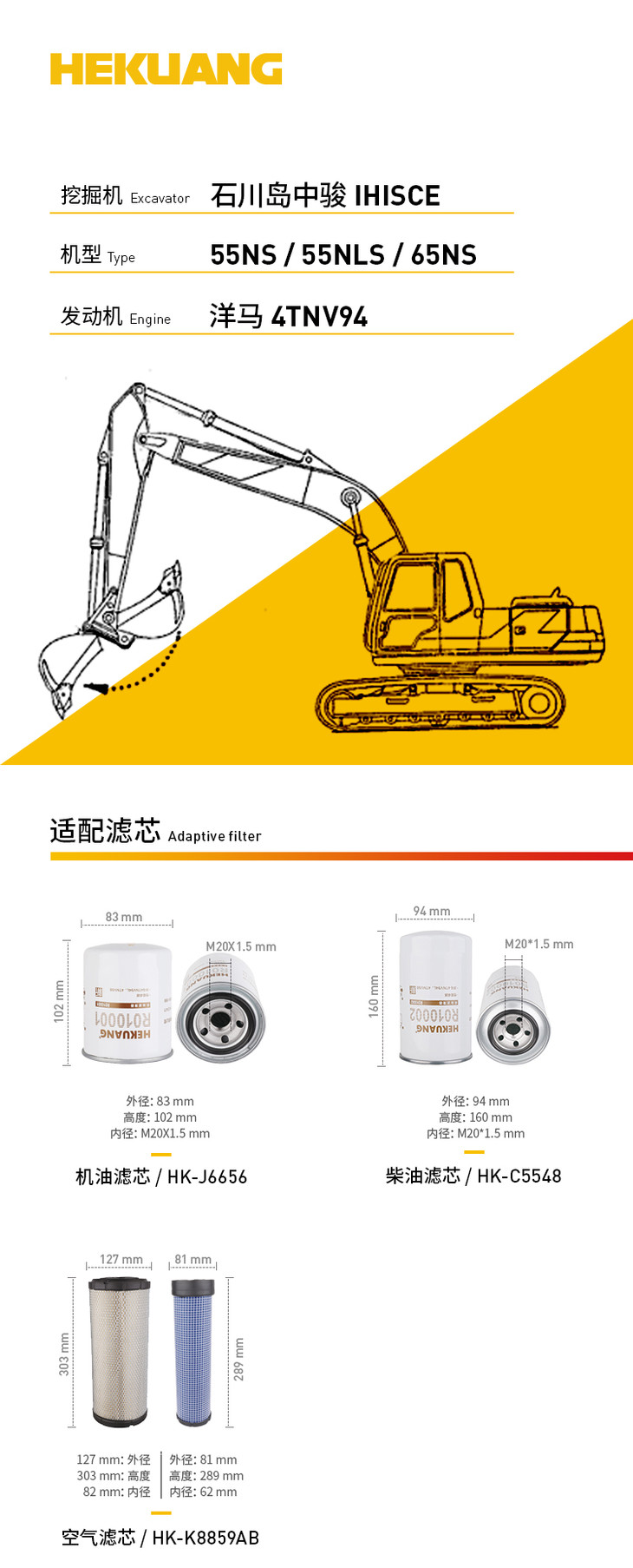 石川岛中骏55NS/55NLS/65NS挖掘机滤芯 机油柴油空气滤芯 液压油吸油回油滤芯