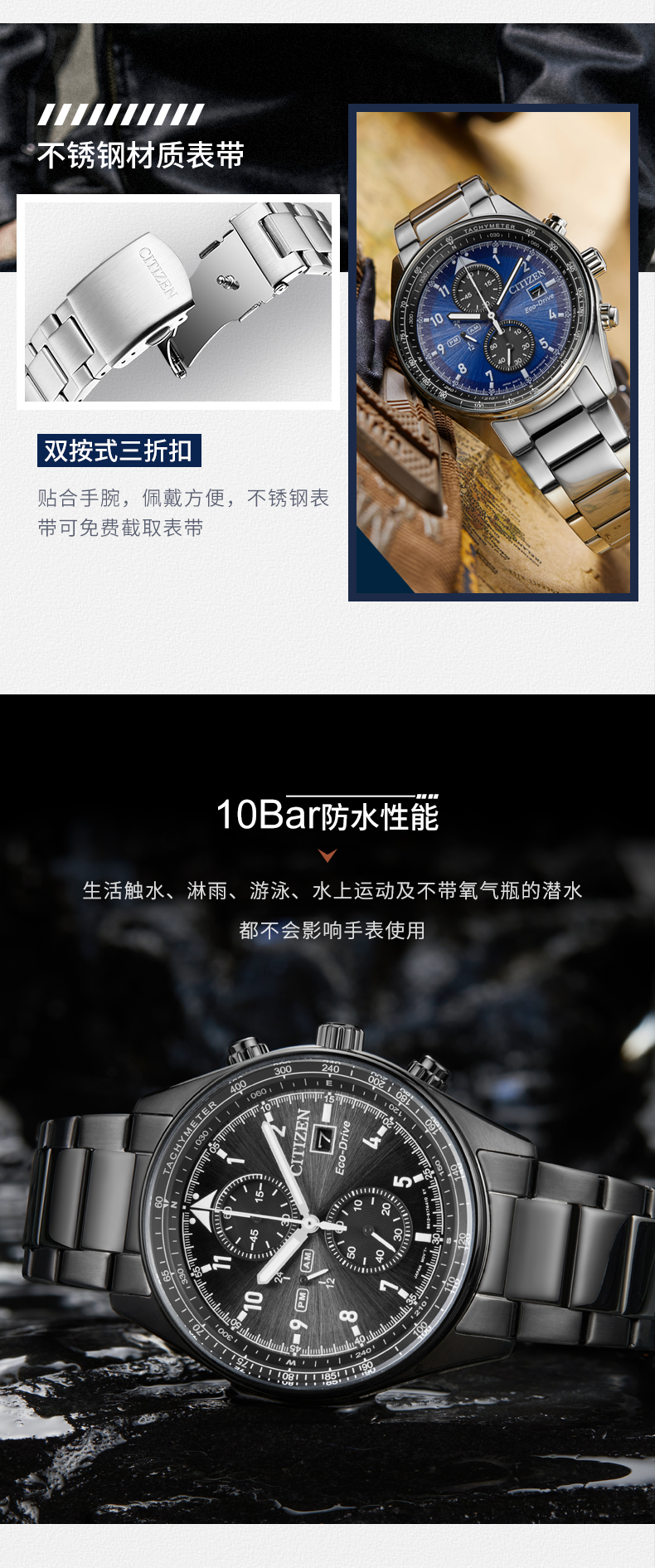 西铁城日本官方正品光动能钢带防水时尚黑色潮流计时男表CA0615-59E