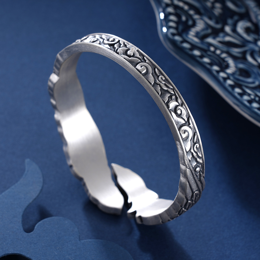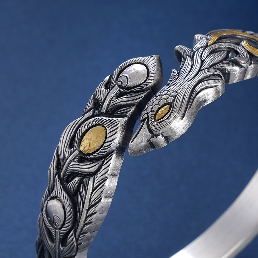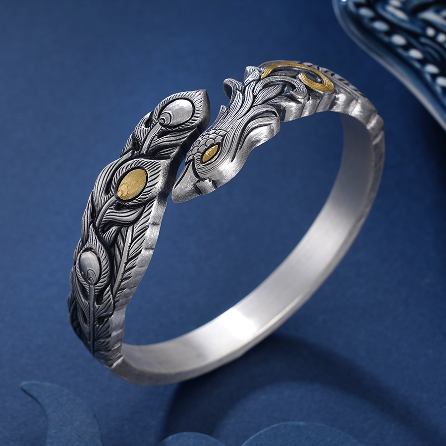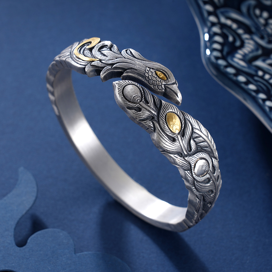【寓意】:足银凤舞手镯,以錾刻形式演绎新中式美学。凤凰首尾环环相扣,嵌金点缀,神韵生动,古韵流淌。寓意祥瑞和幸福。