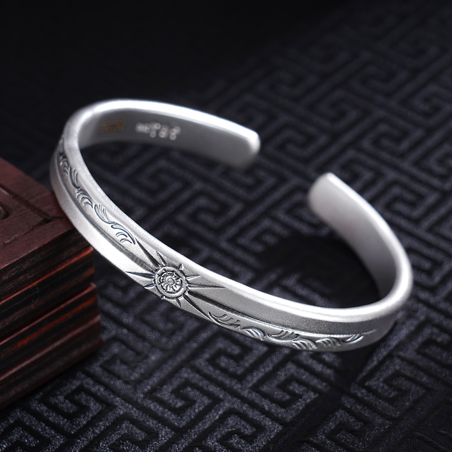 【寓意】:手镯以太阳为灵感设计,经过錾刻打磨,熠熠生辉,东方美学尽显。寓意如日方升,前途无限。