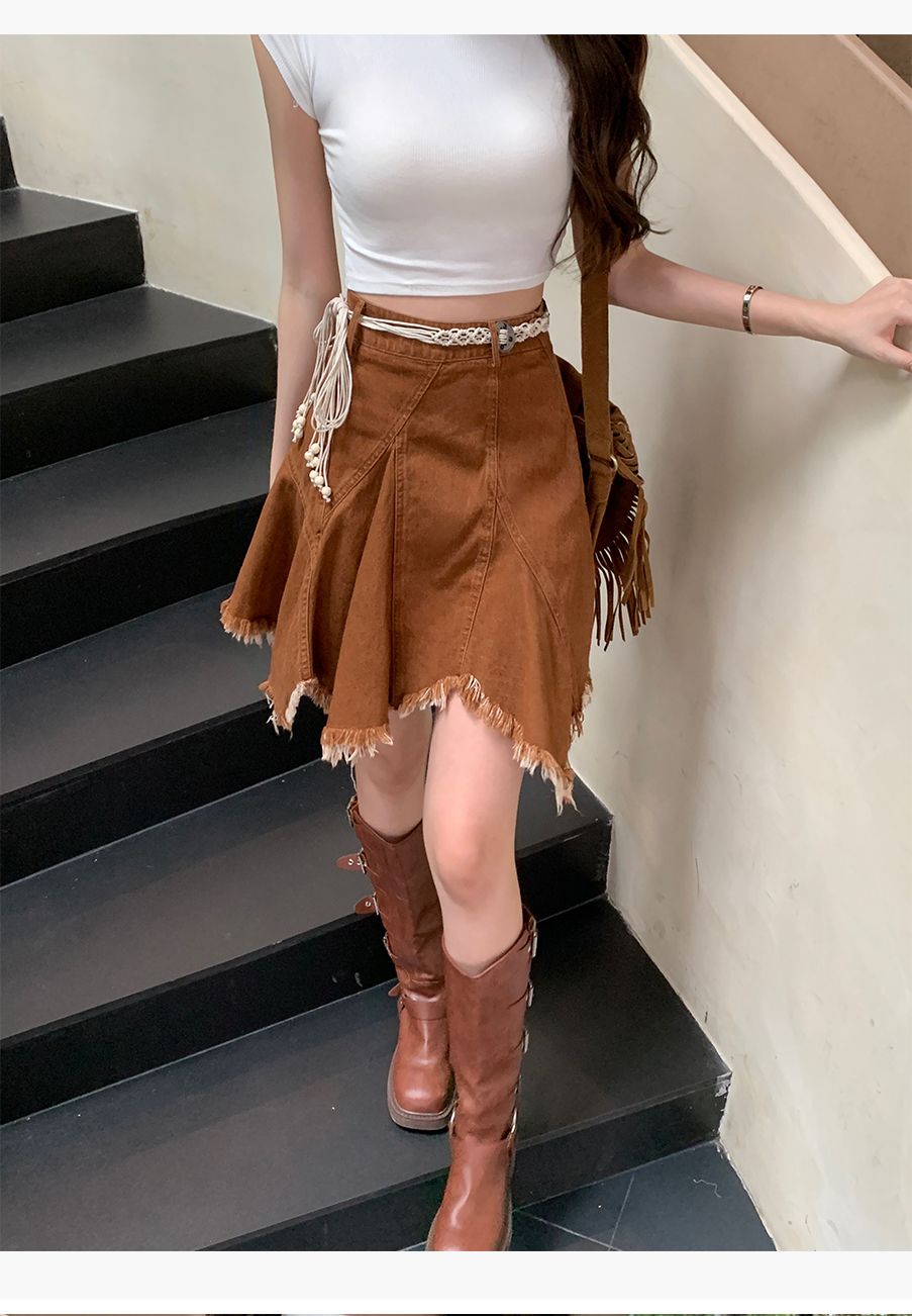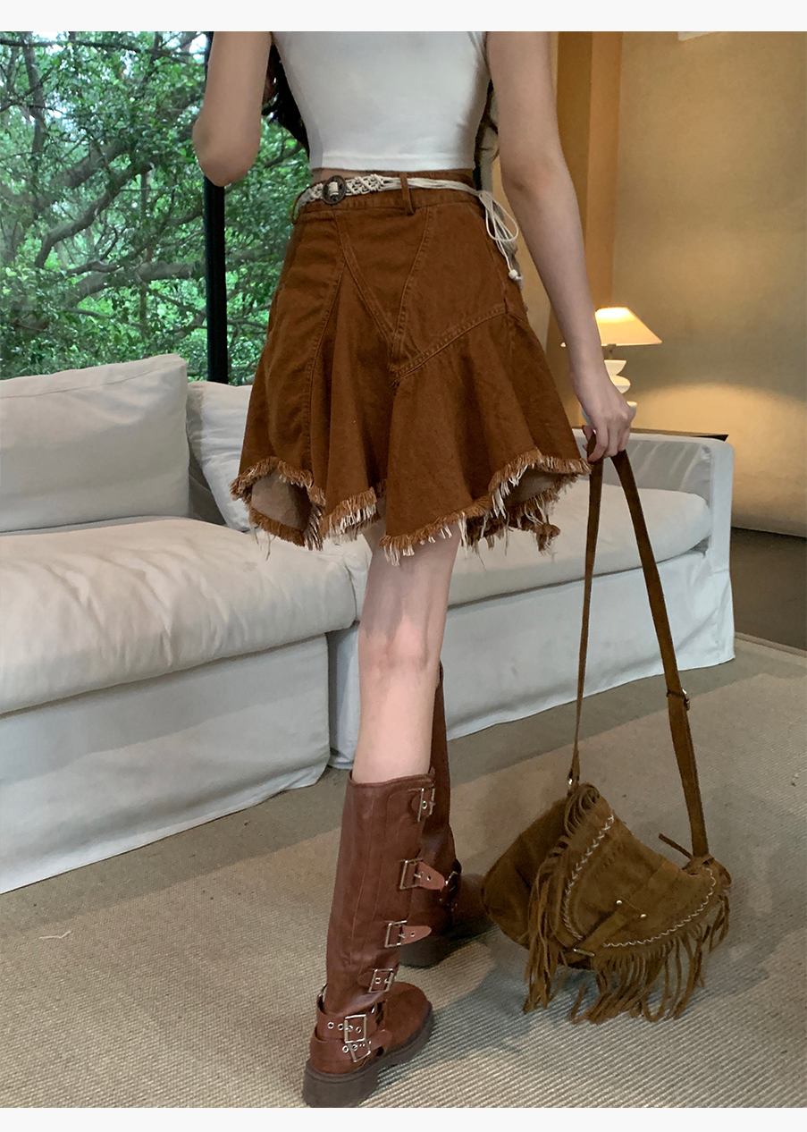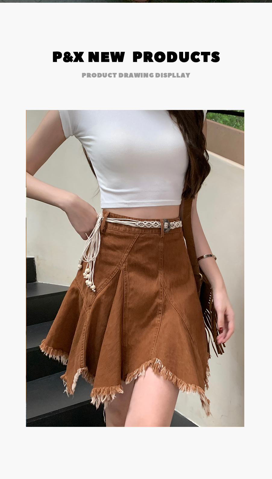 P&X设计师女装夏季百搭复古不规则牛仔半身短裙824207675 咖啡