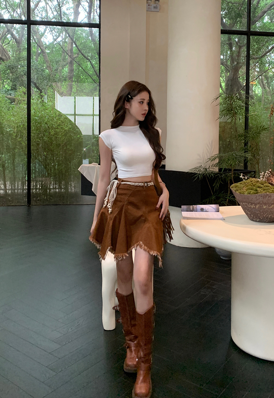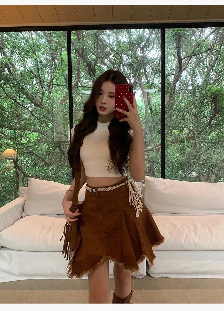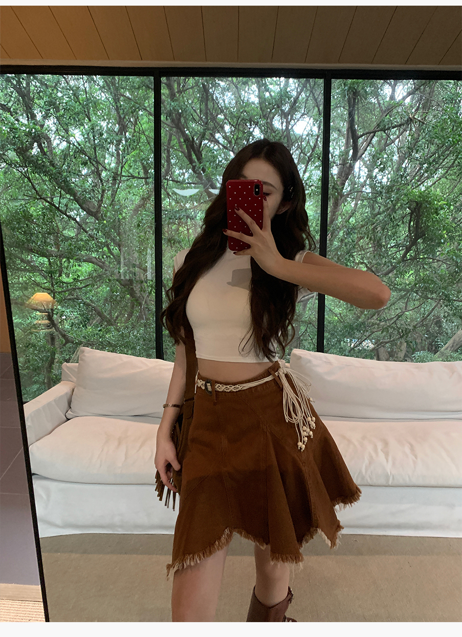 P&X设计师女装夏季百搭复古不规则牛仔半身短裙824207675 咖啡