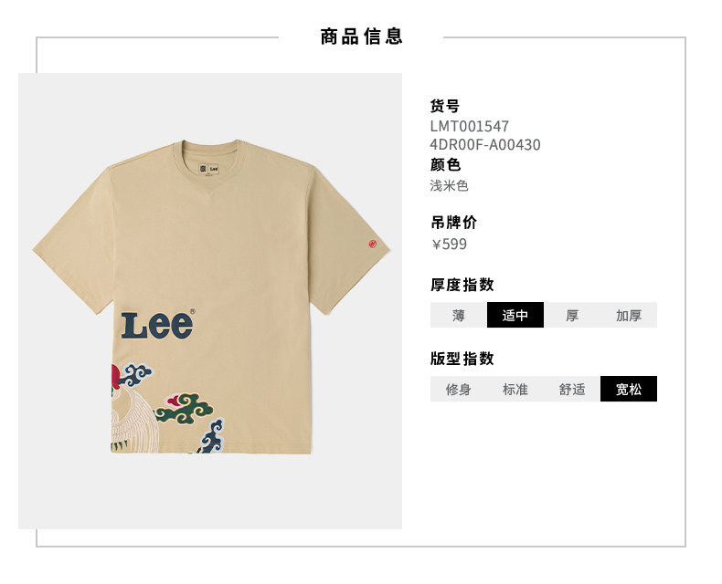 Lee故宫联名男士宽松101+刺绣圆领短袖T恤LMT0015474DR00FA00430