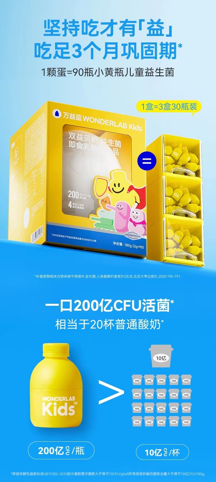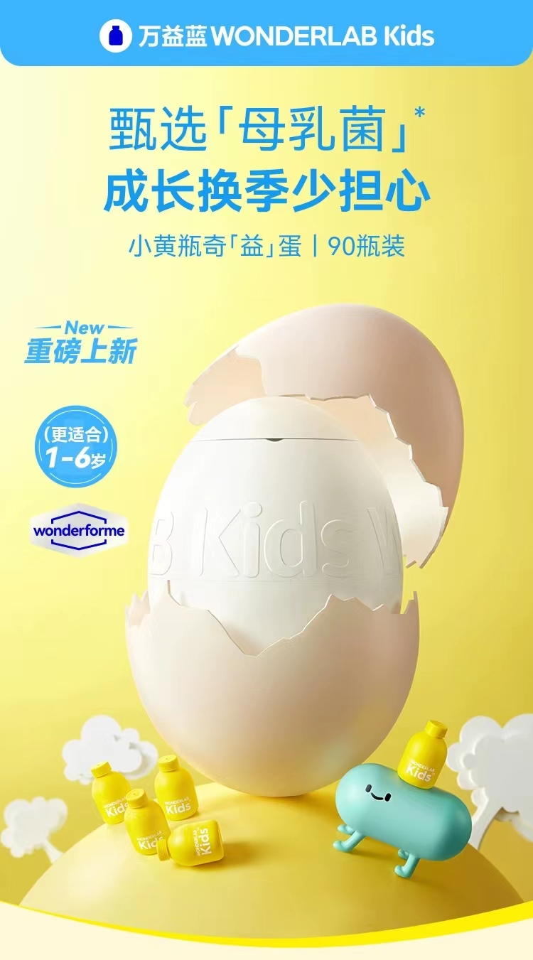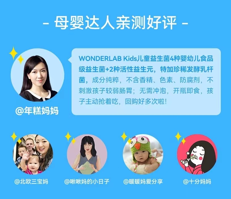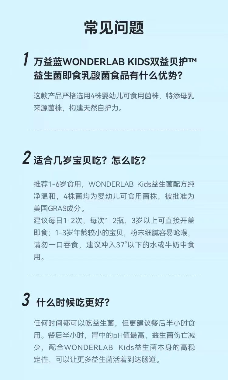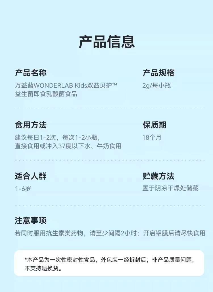 【产品名称】:万益蓝WONDERLAB Kids双益贝护™益生菌即食乳酸菌食品
