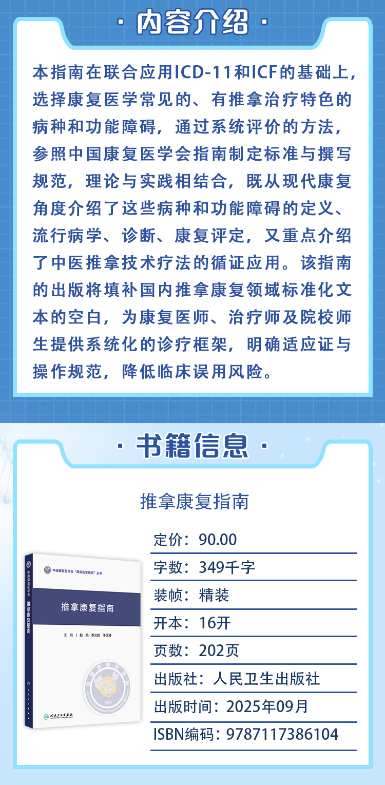 本指南在联合应用ICD-11和ICF的基础上,选择康复医学常见的、有推拿治疗特色的病种和功能障碍,通过系统评价的方法,参照中国康复医学会指南制定标准与撰写规范,理论与实践相结合,既从现代康复角度介绍了这些病种和功能障碍的定义、流行病学、诊断、康复评定,又重点介绍了中医推拿技术疗法的循证应用。该指南的出版将填补国内推拿康复领域标准化文本的空白,为康复医师、治疗师及院校师生提供系统化的诊疗框架,明确适应证与操作规范,降低临床误用风险。