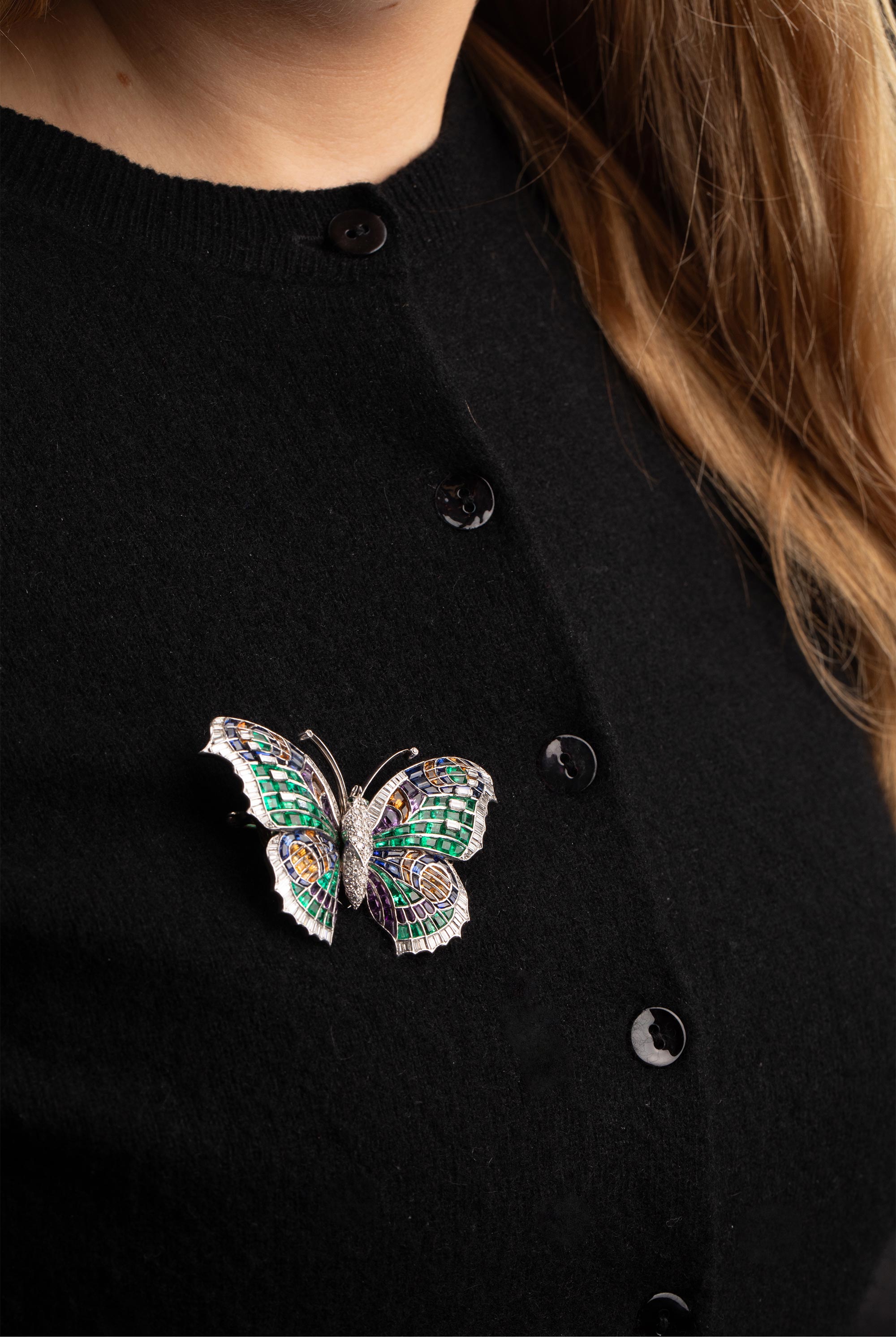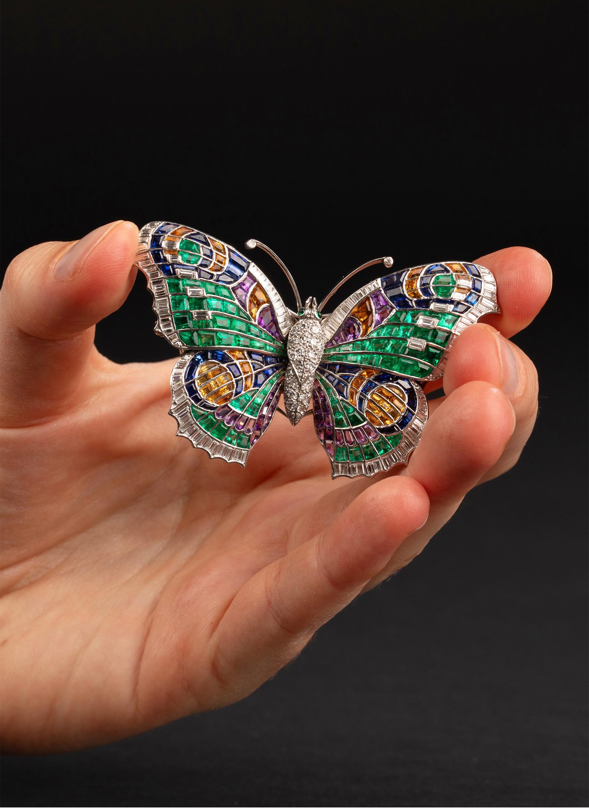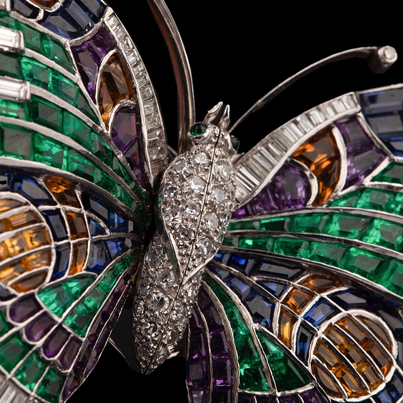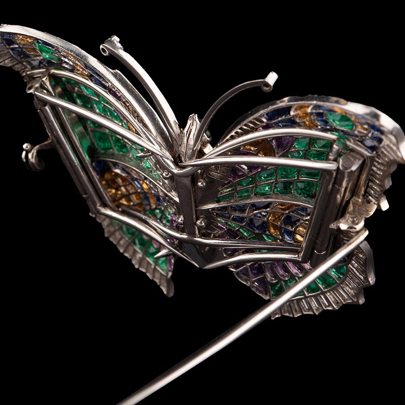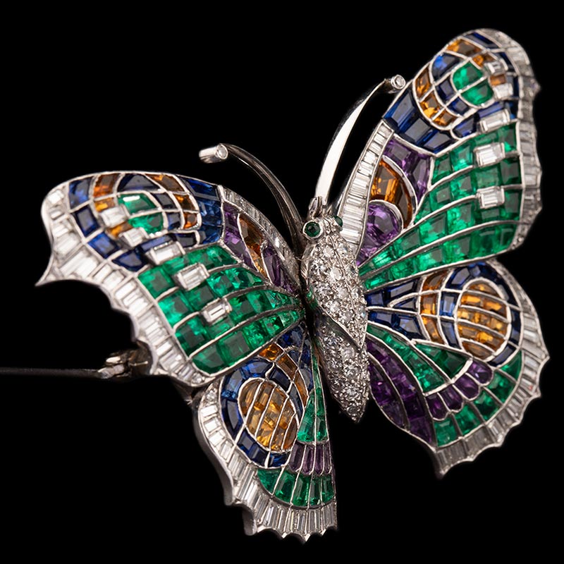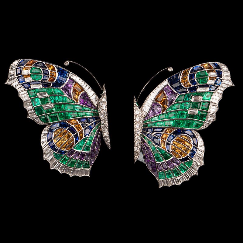 1960年代英国出品蝴蝶造型铂金镶嵌祖母绿钻石紫水晶托帕石及黄水晶可拆卸双夹式胸针