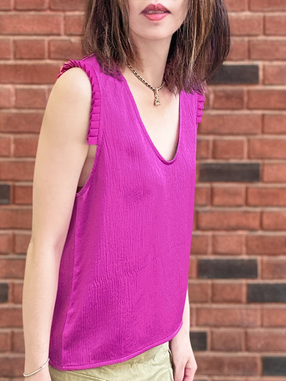 TYNVIE 小荷叶装饰V领背心-玫红色
