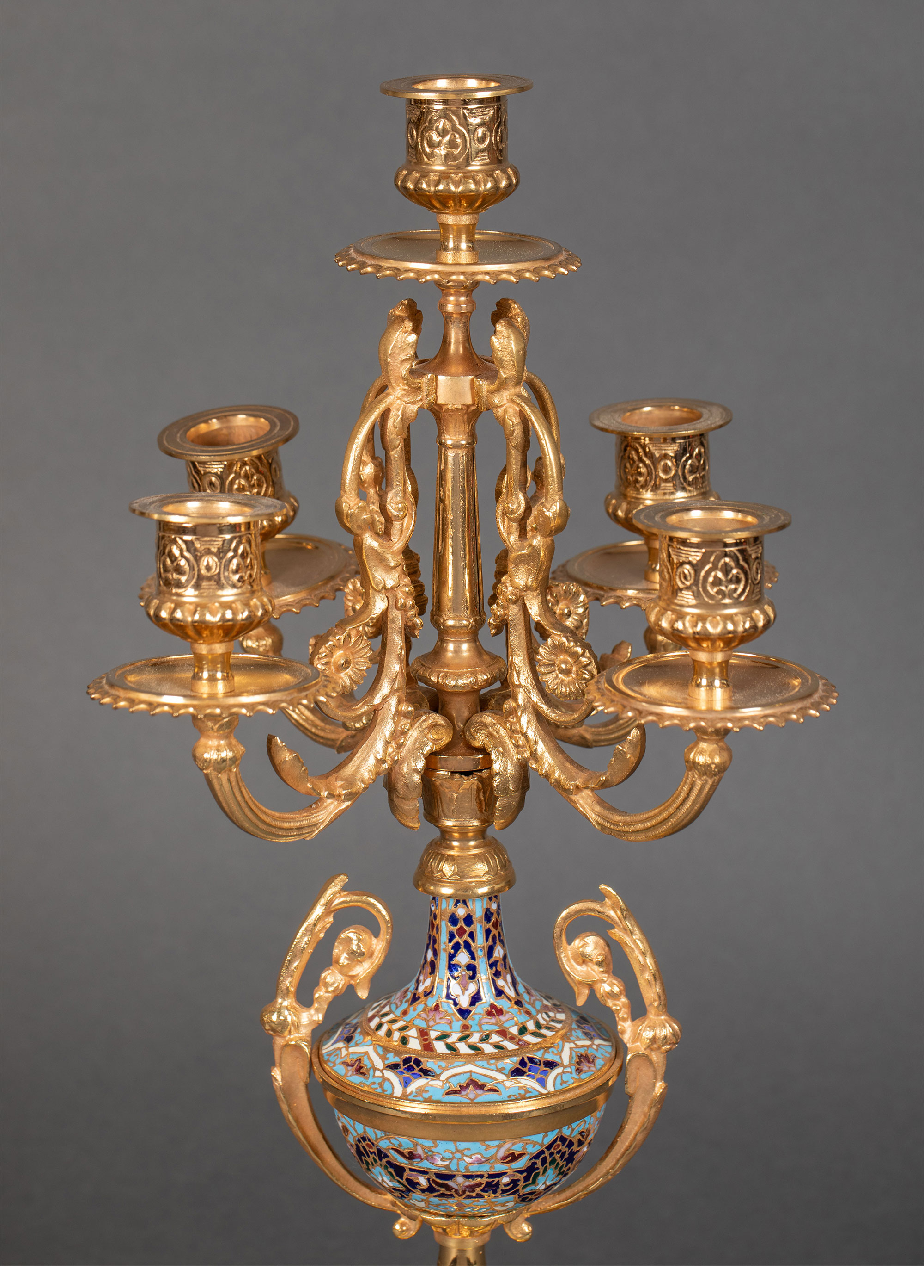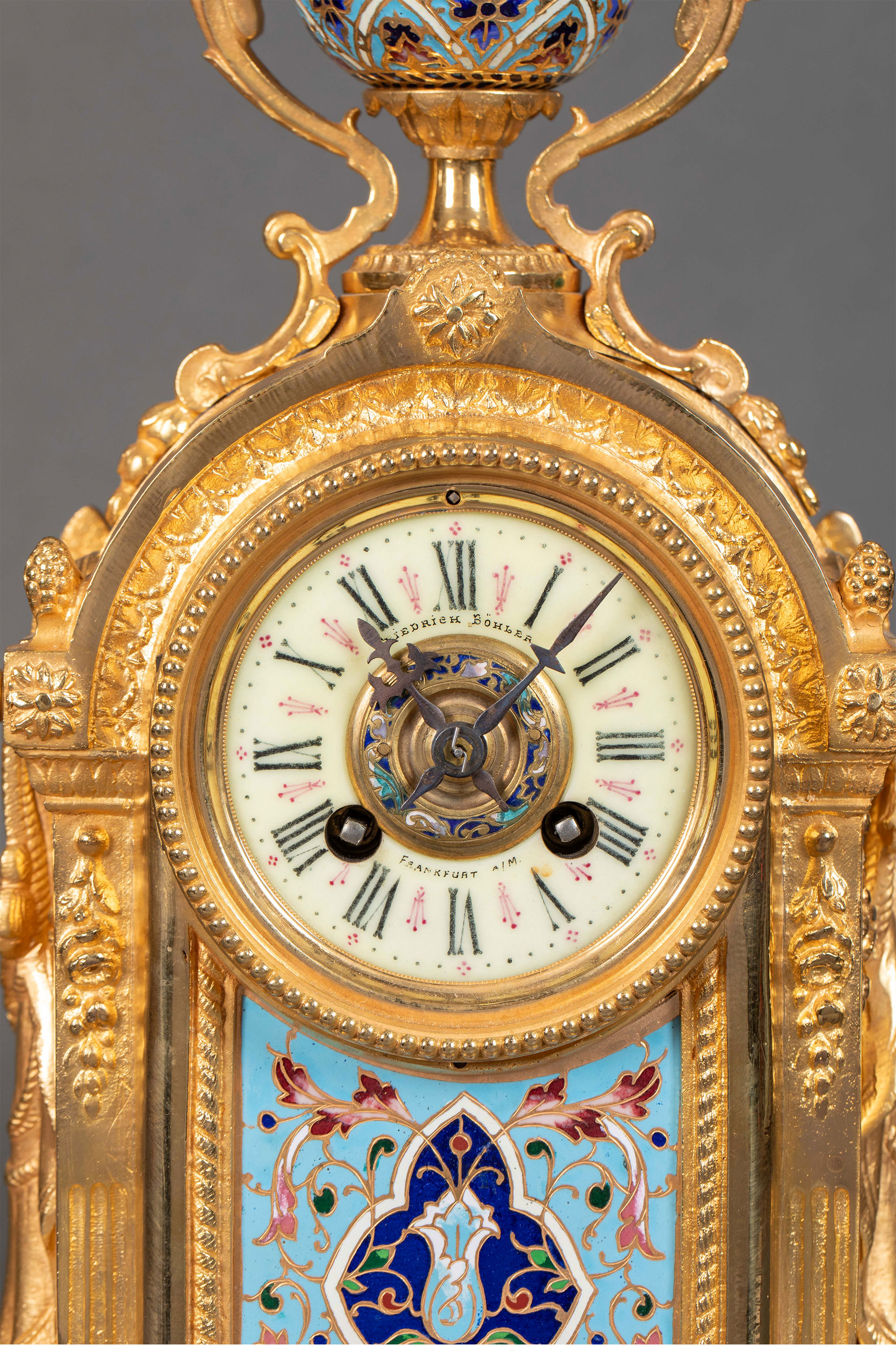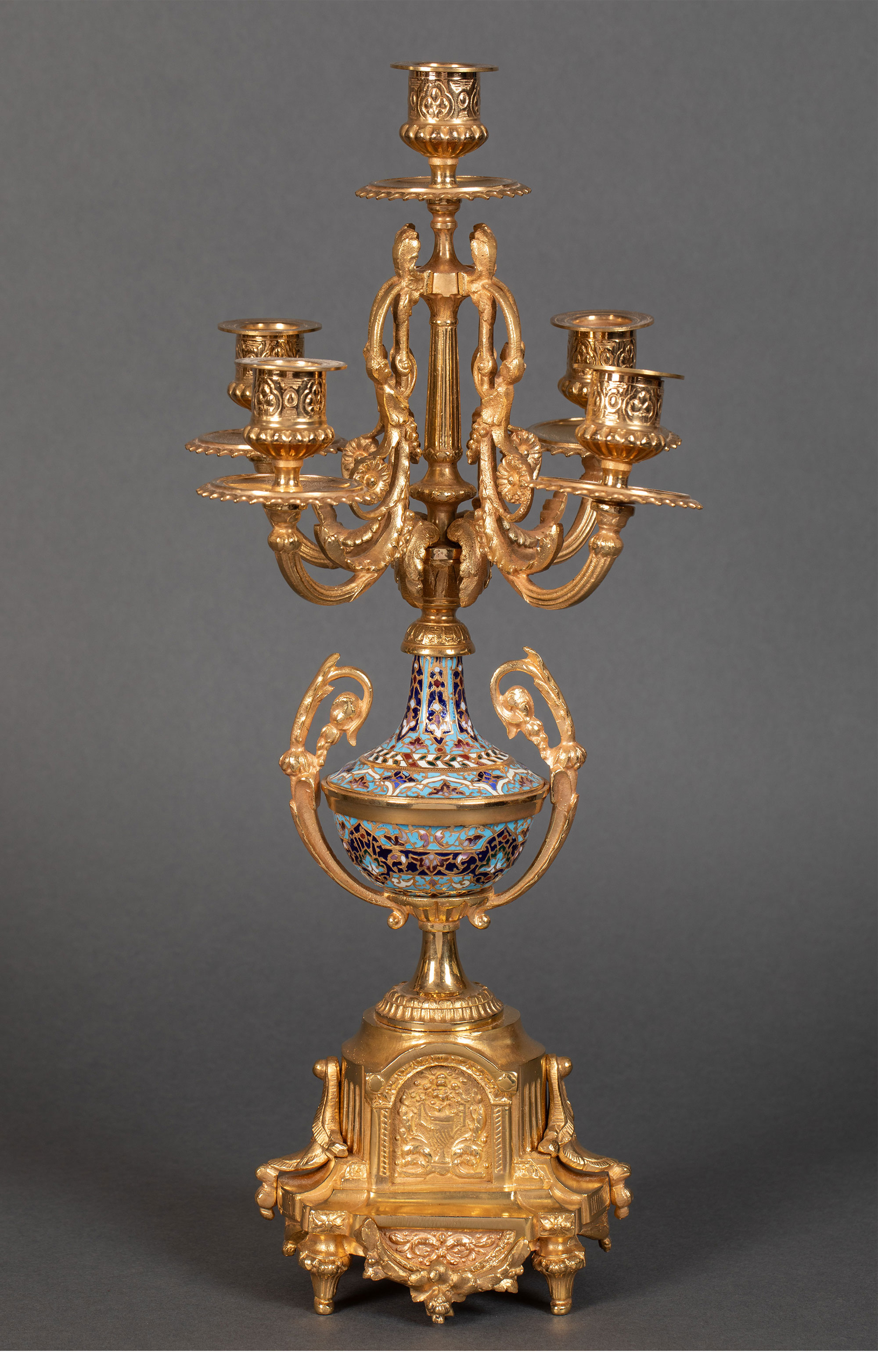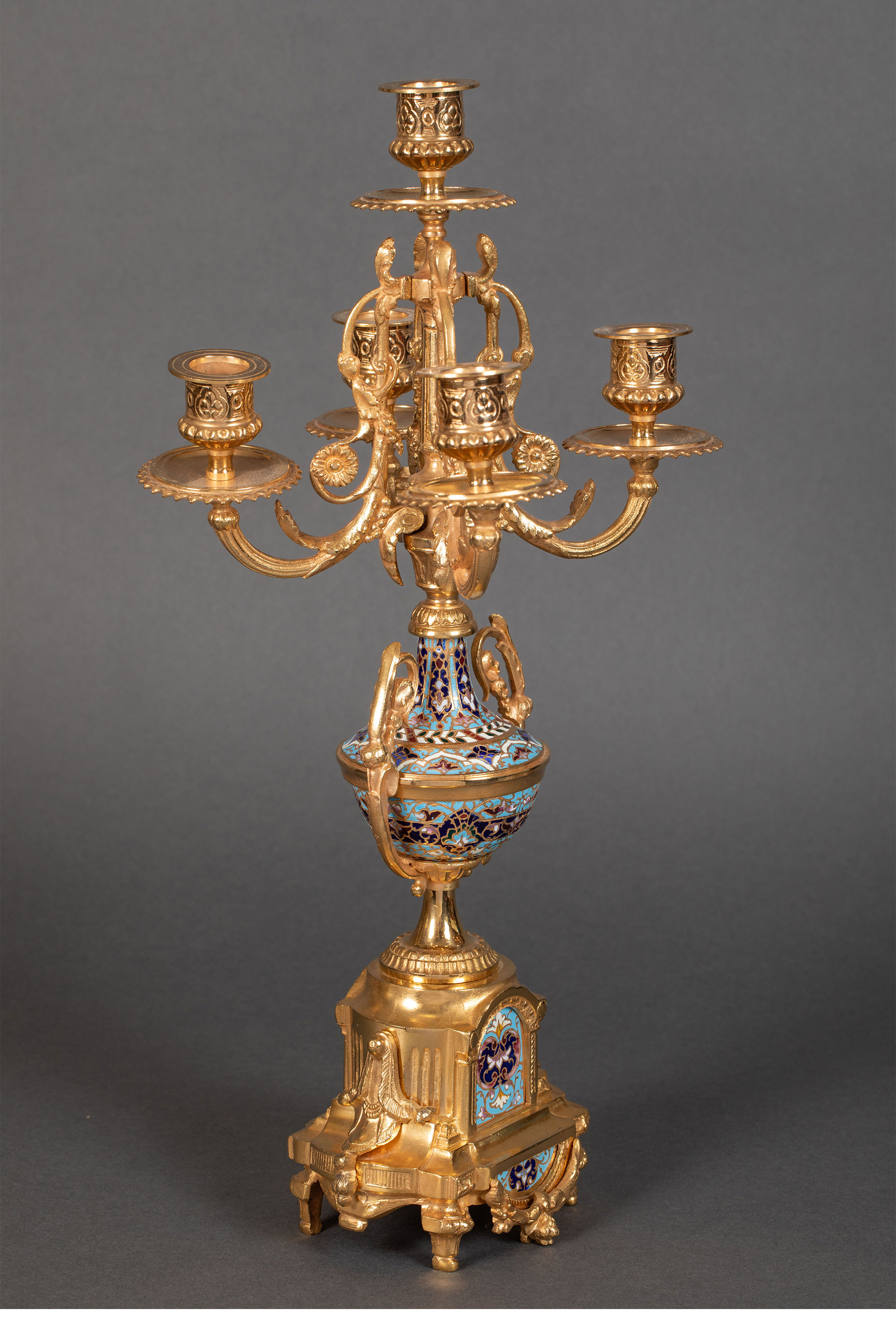19世纪末德国出品新古典主义风格铜鎏金精雕镶嵌錾胎珐琅座钟烛台三件套