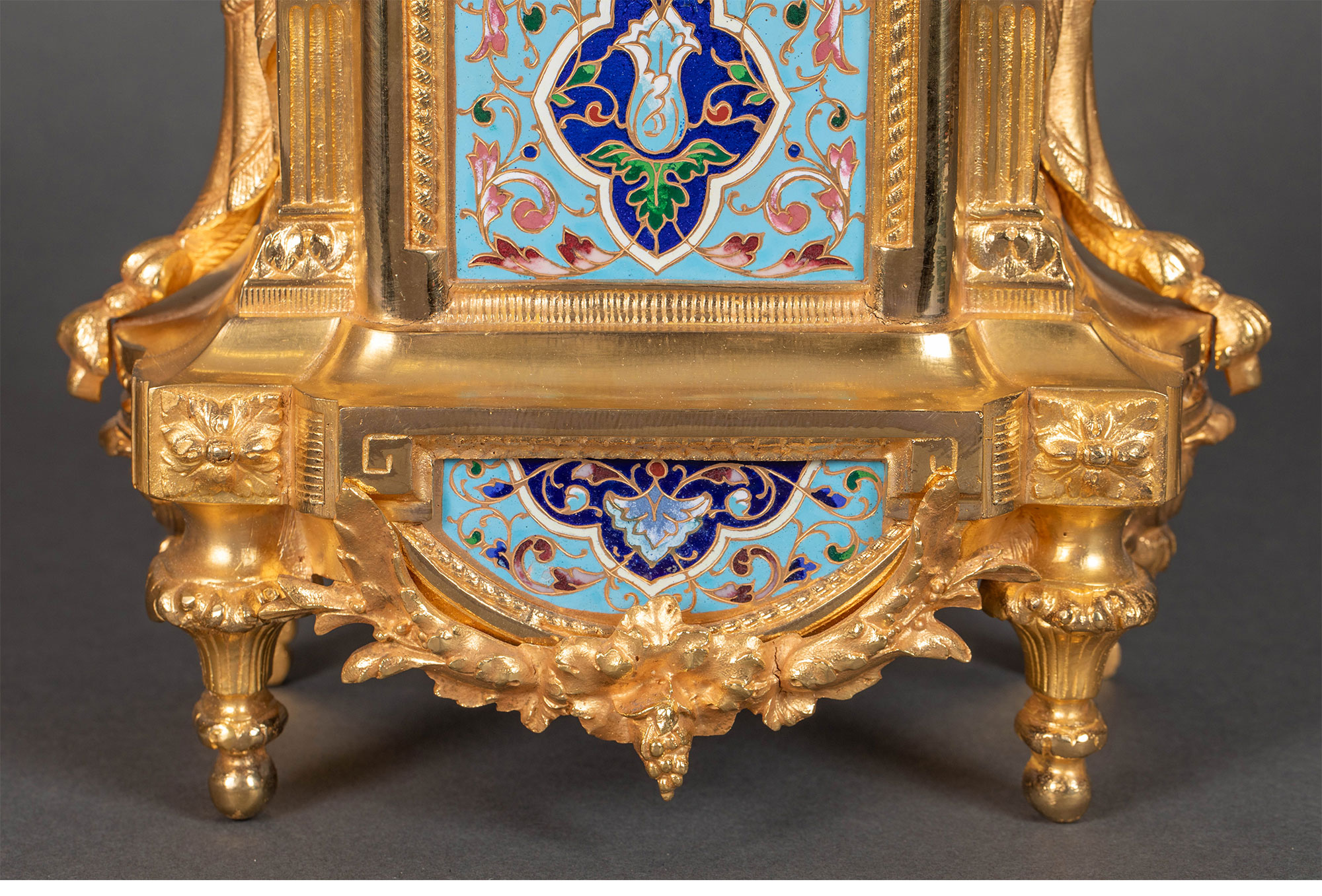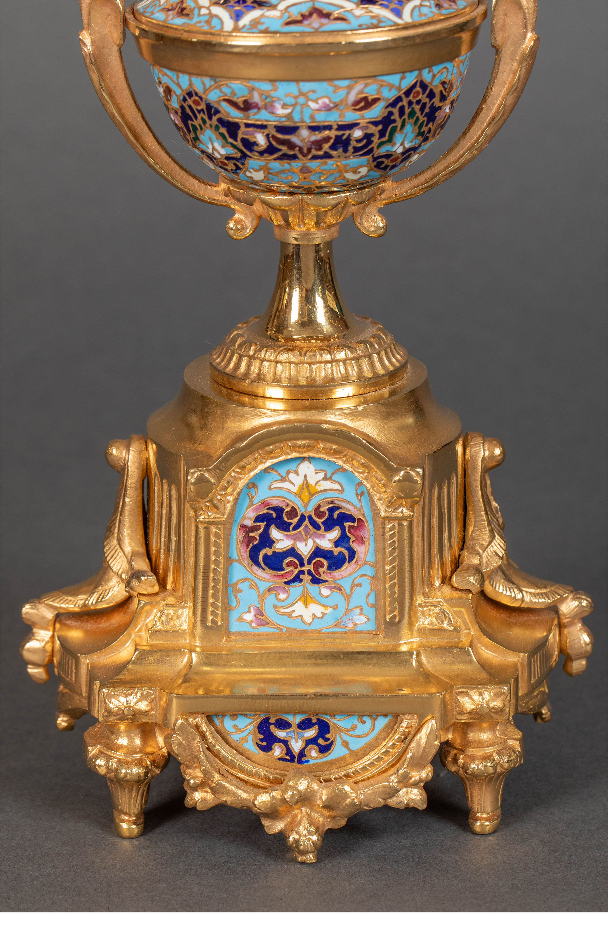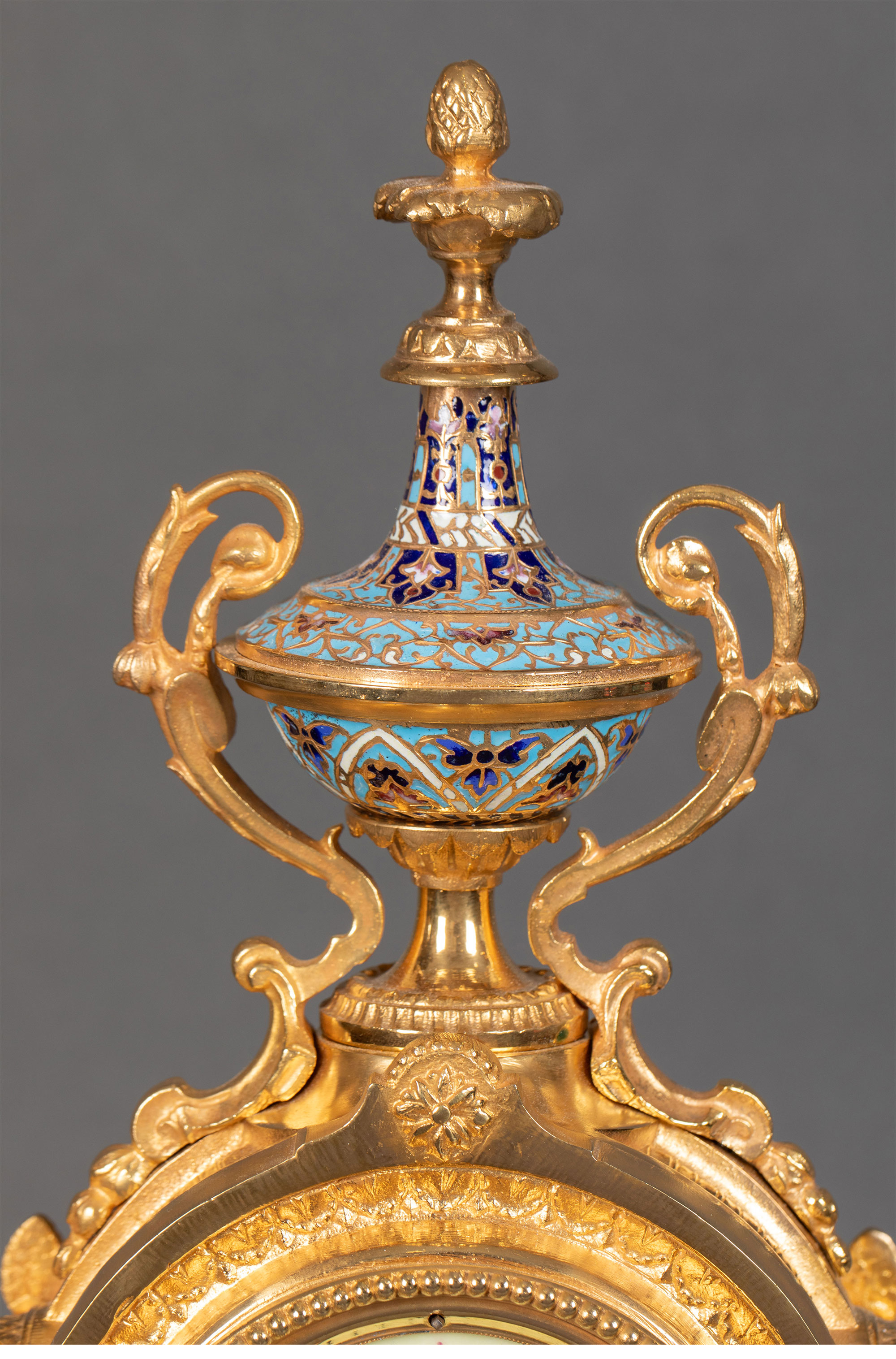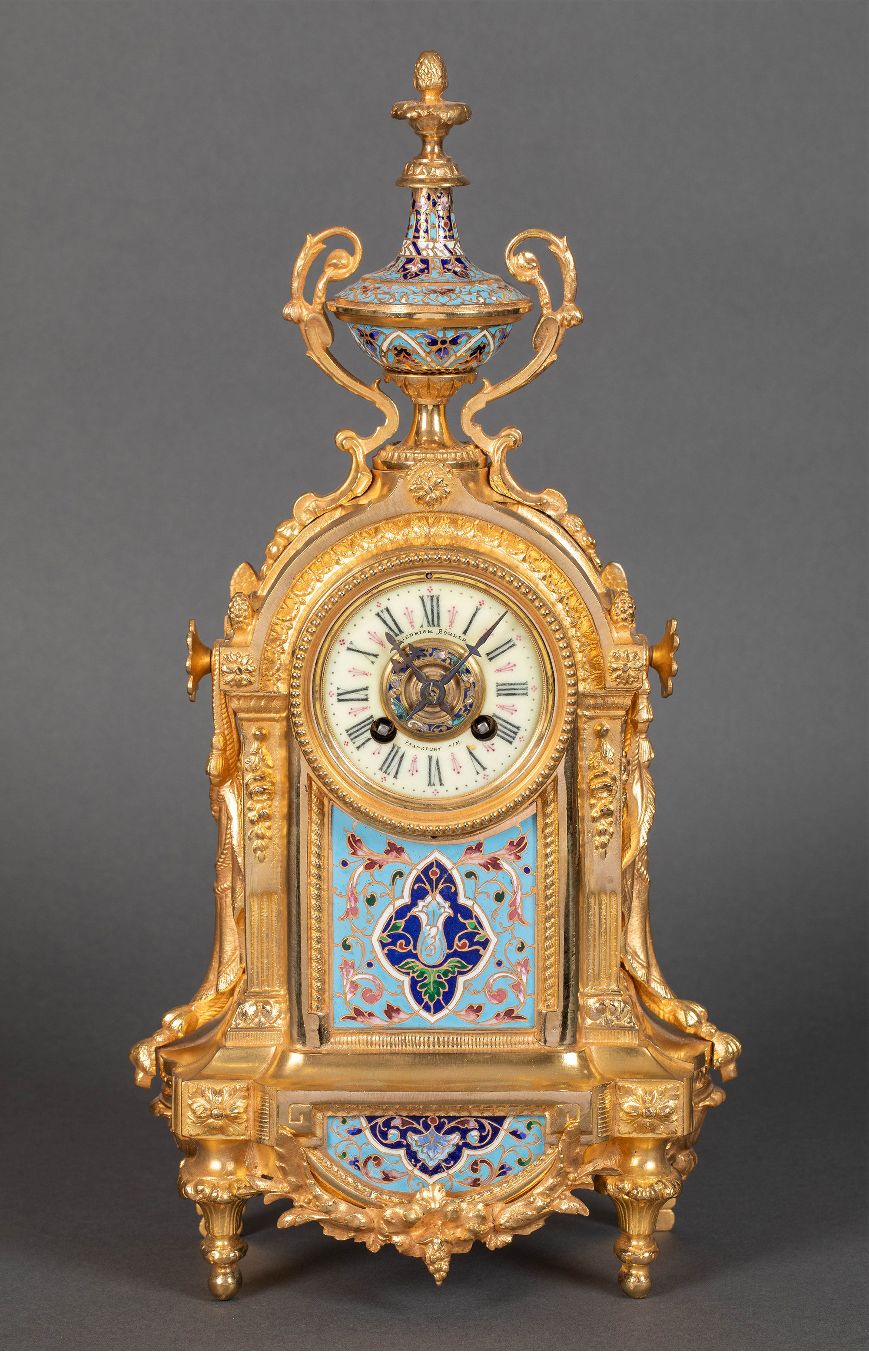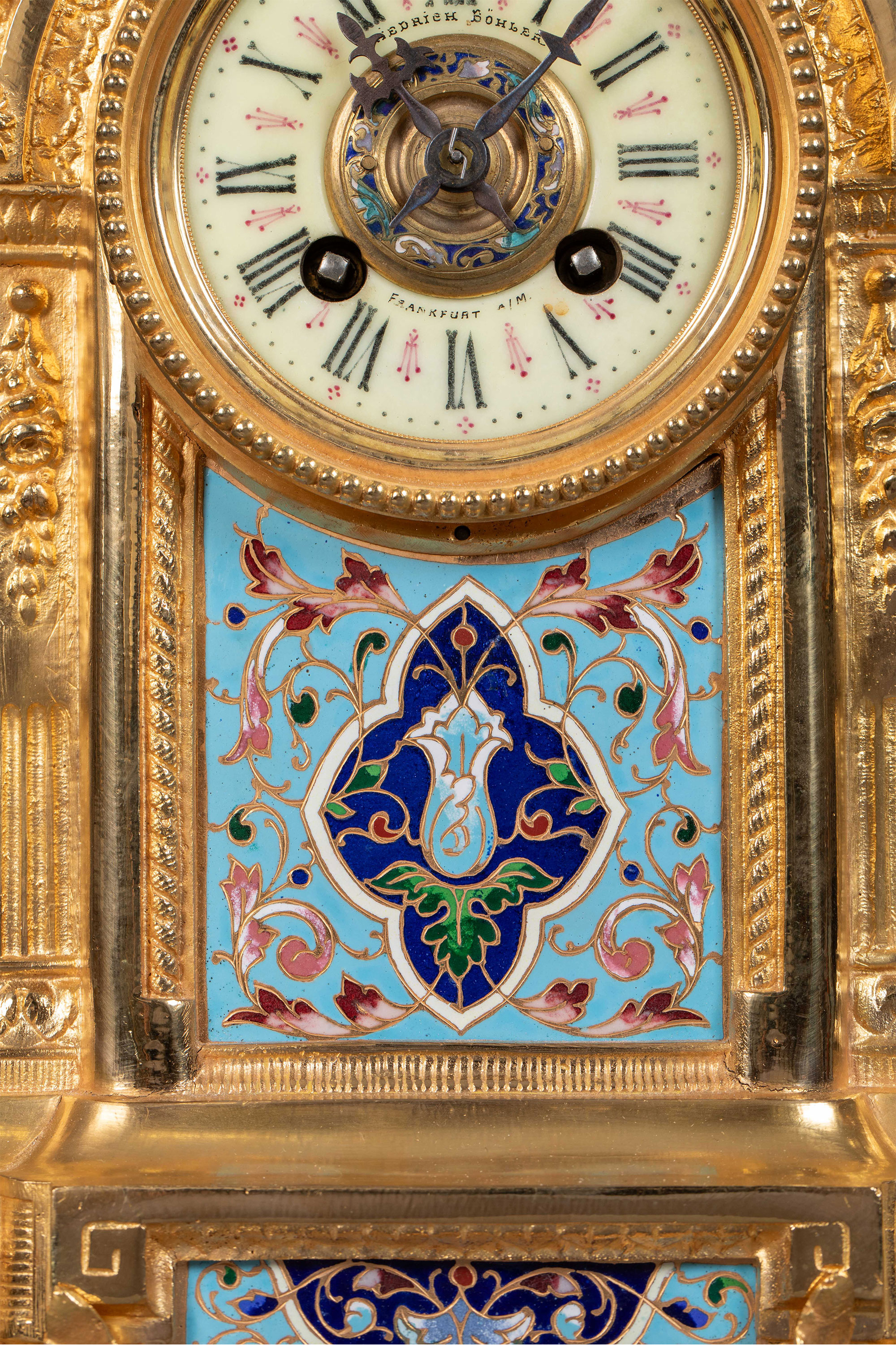 19世纪末德国出品新古典主义风格铜鎏金精雕镶嵌錾胎珐琅座钟烛台三件套