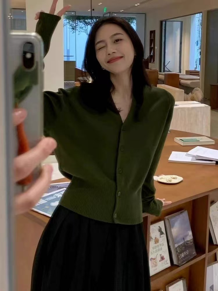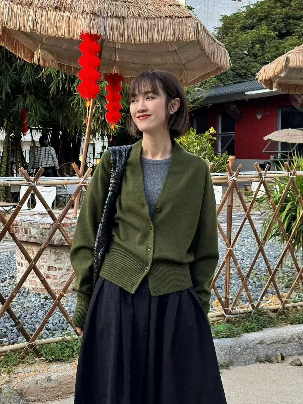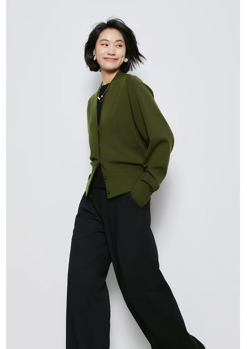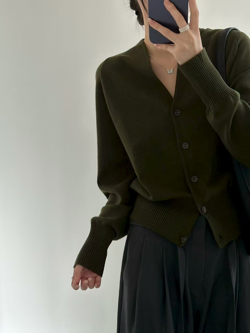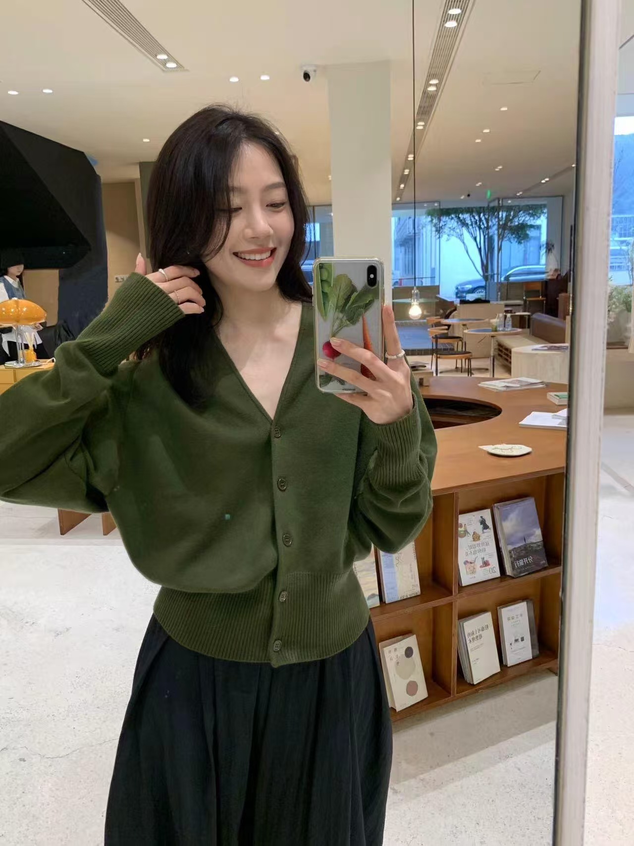 爆款3-7天发货!isabelle marran苔藓绿极简秋冬气质V领开衫JS3699034
