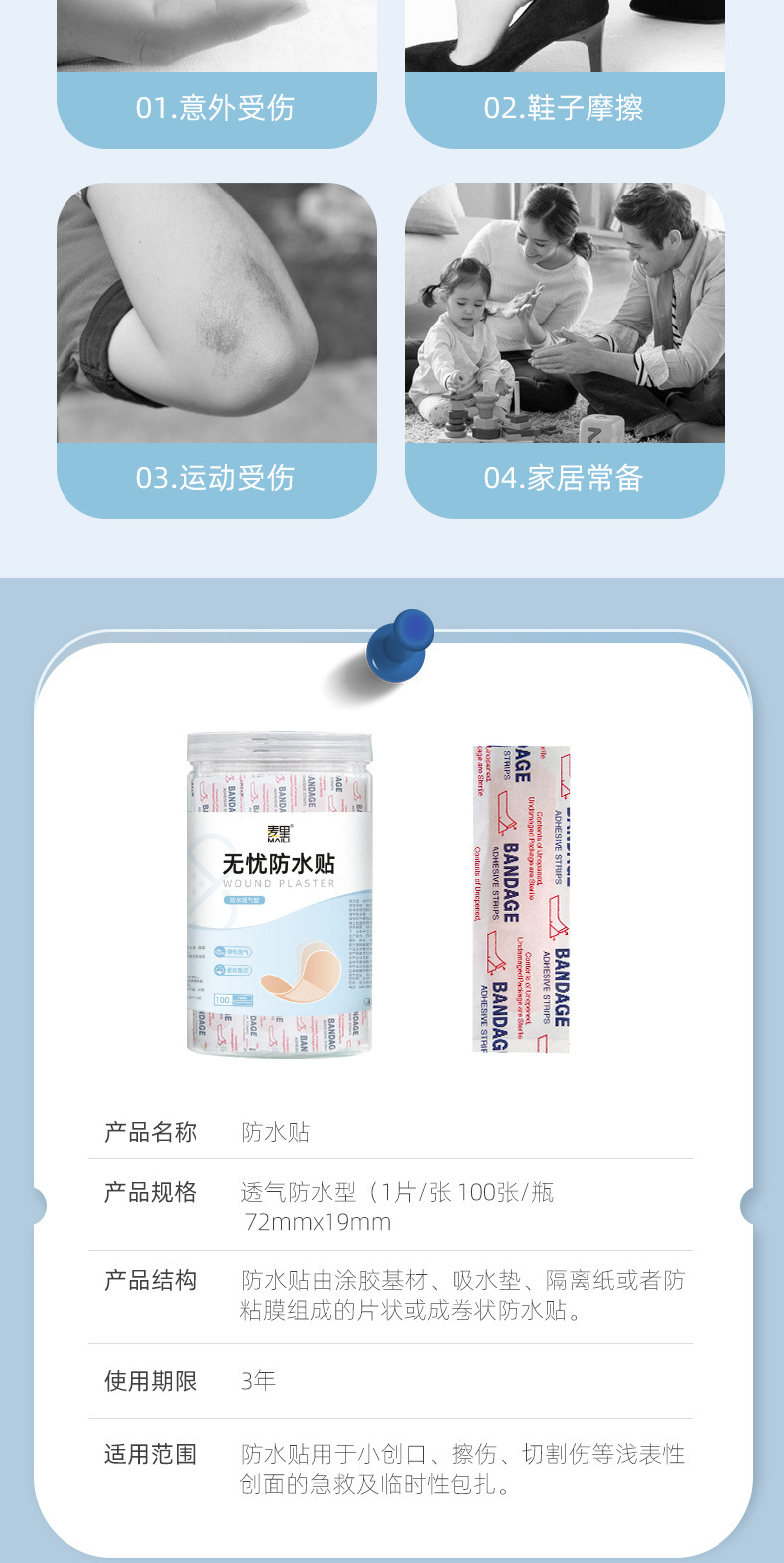 「100片装!防水型」防水贴居家日用防水护理伤口贴弹力防磨脚独立包装