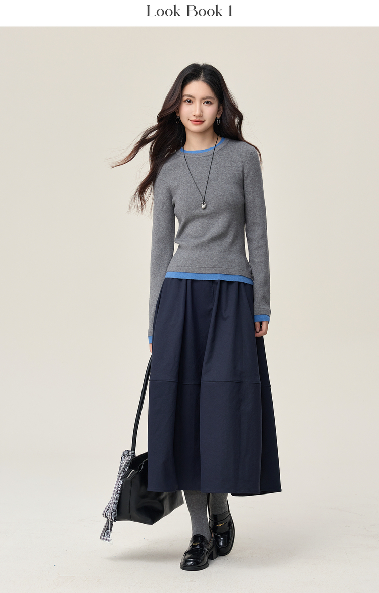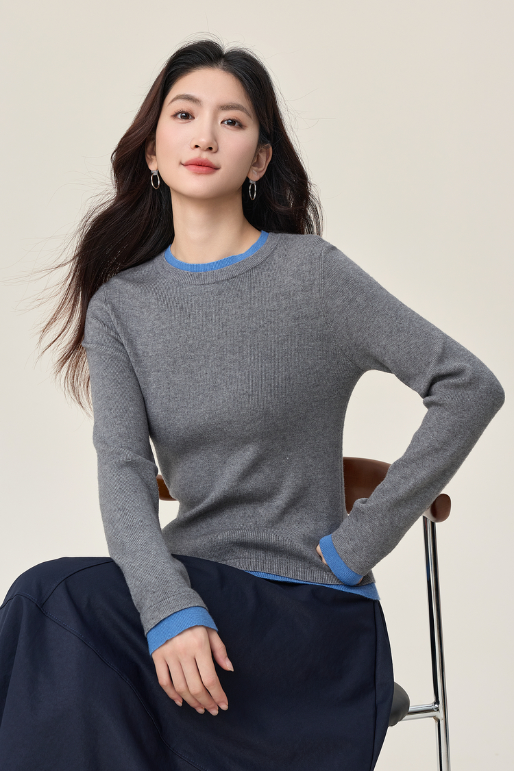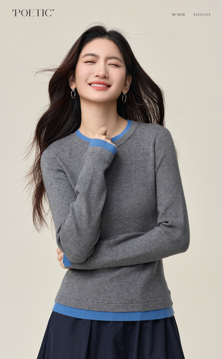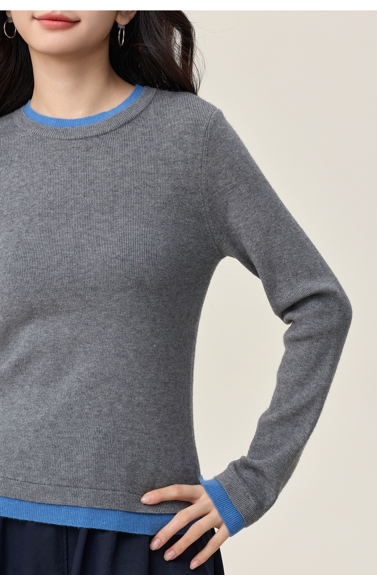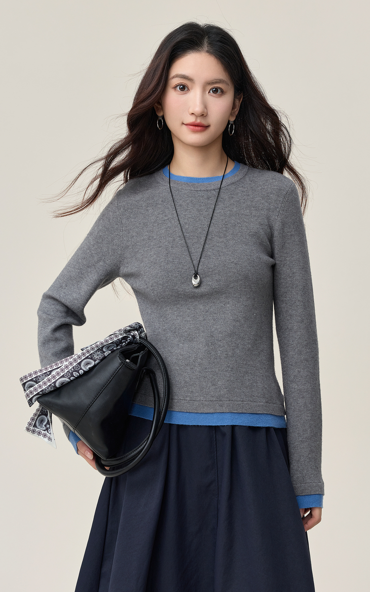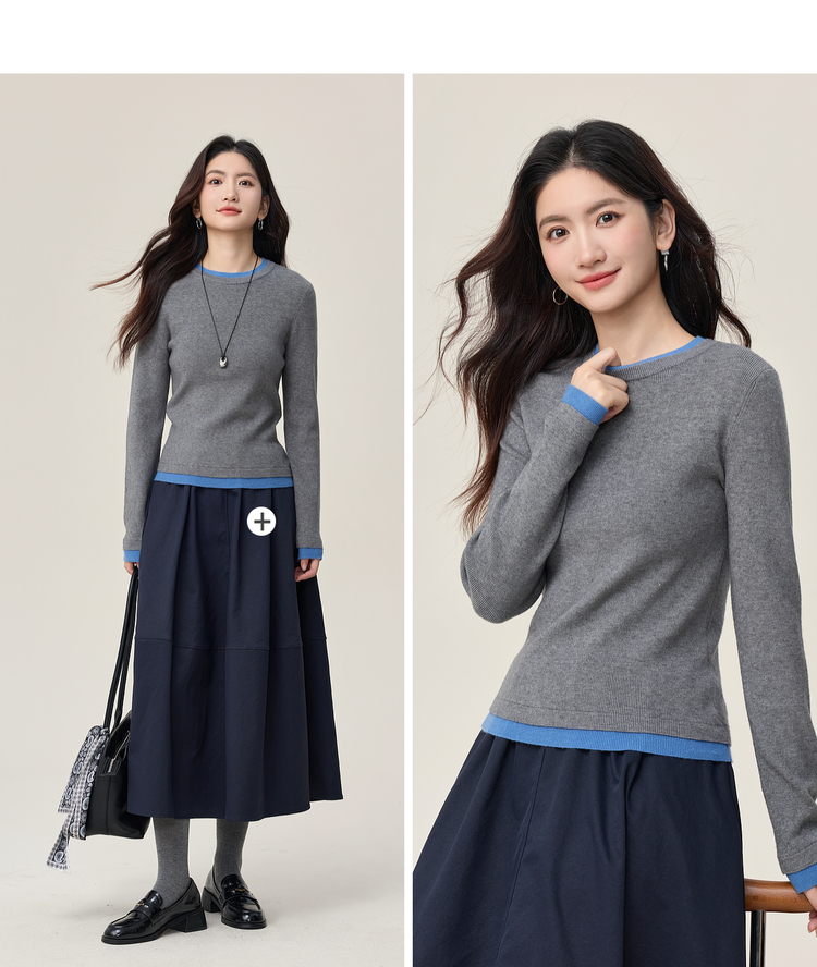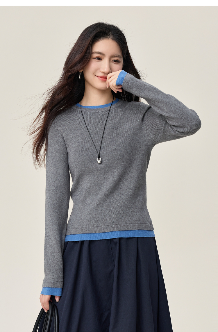 【周末秒杀】熙世界叠穿假两件正肩毛衣女2025年秋冬新款设计感撞色针织打底衫