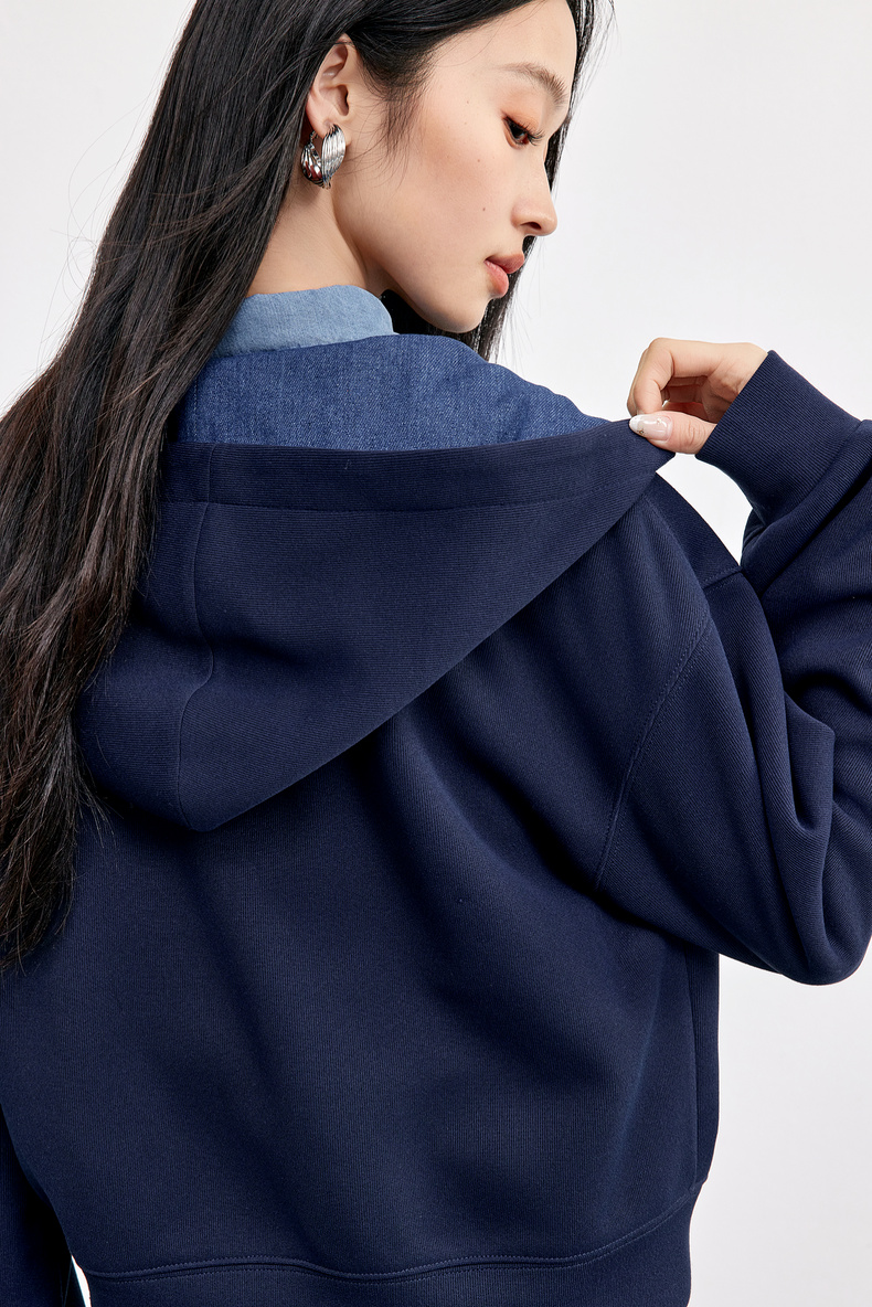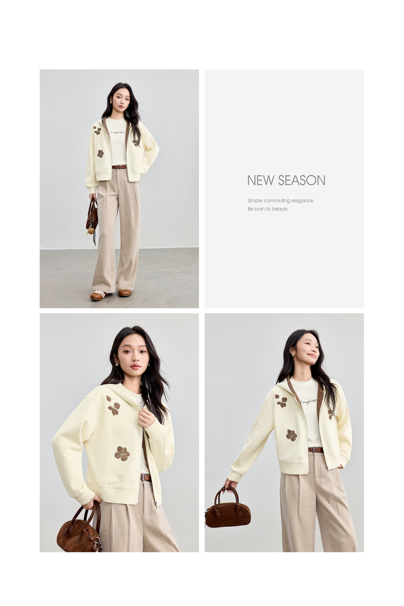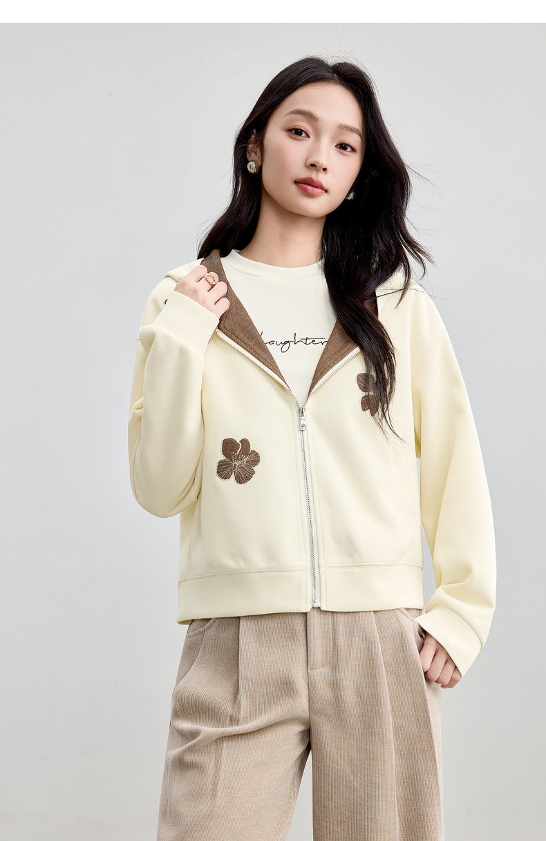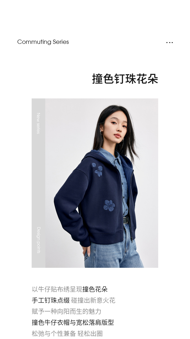 【内购】【钉珠花朵】简约通勤撞色拼接连帽拉链宽松显瘦落肩长袖针织外套-153WC2565