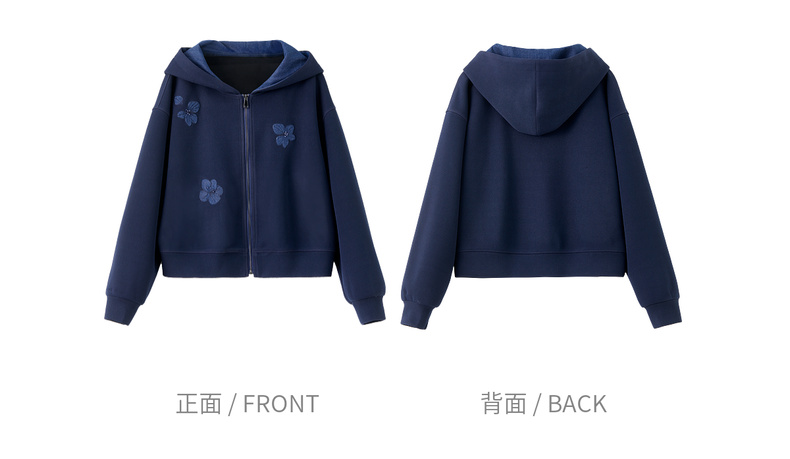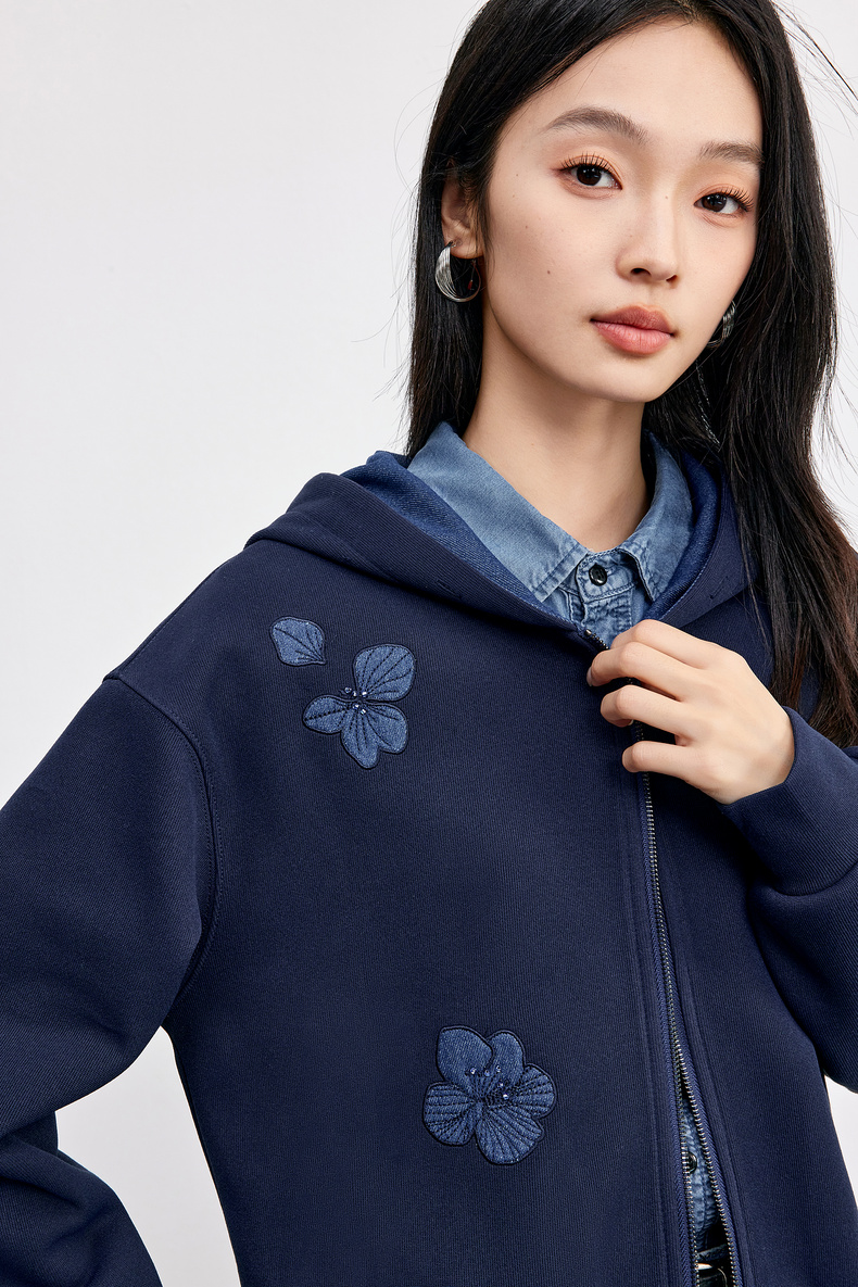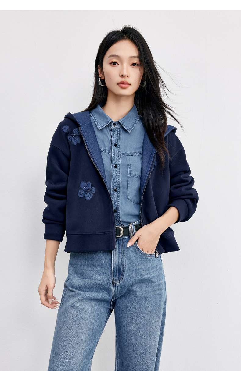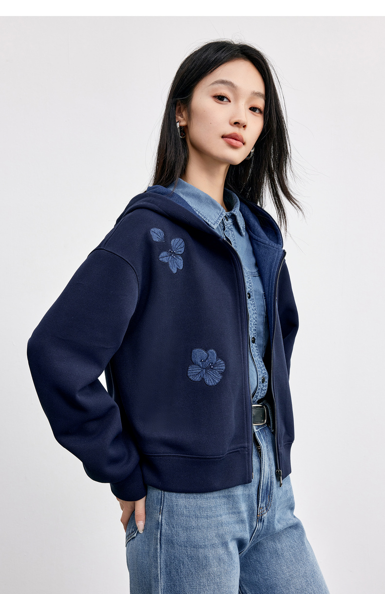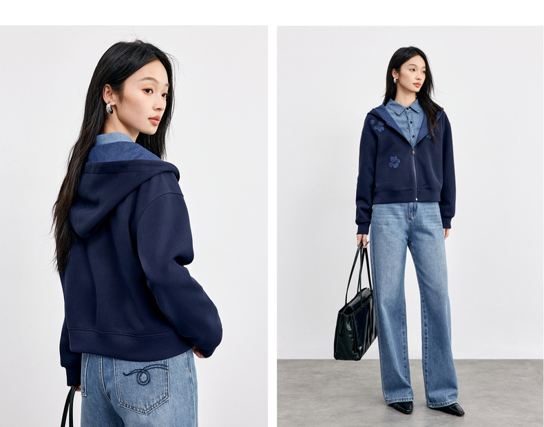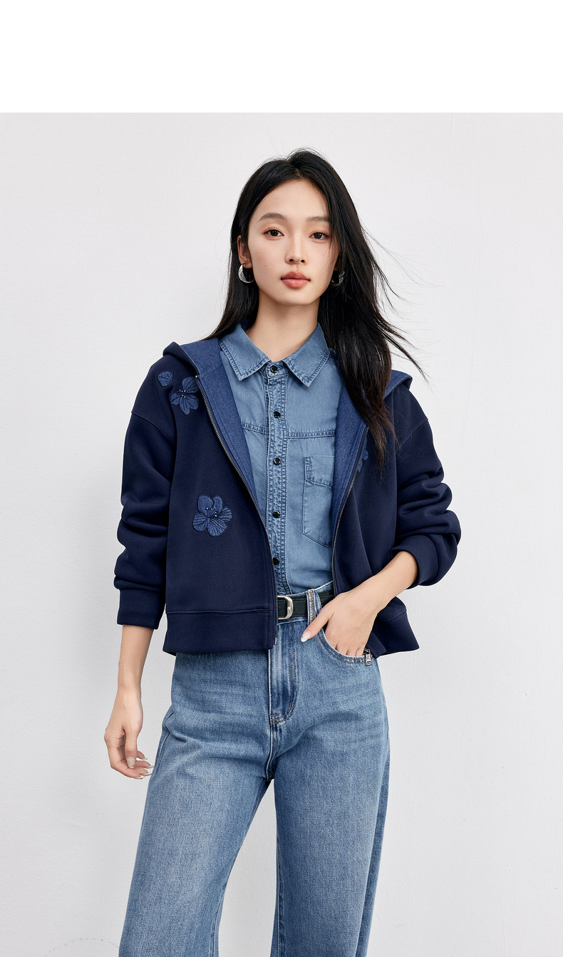 【内购】【钉珠花朵】简约通勤撞色拼接连帽拉链宽松显瘦落肩长袖针织外套-153WC2565