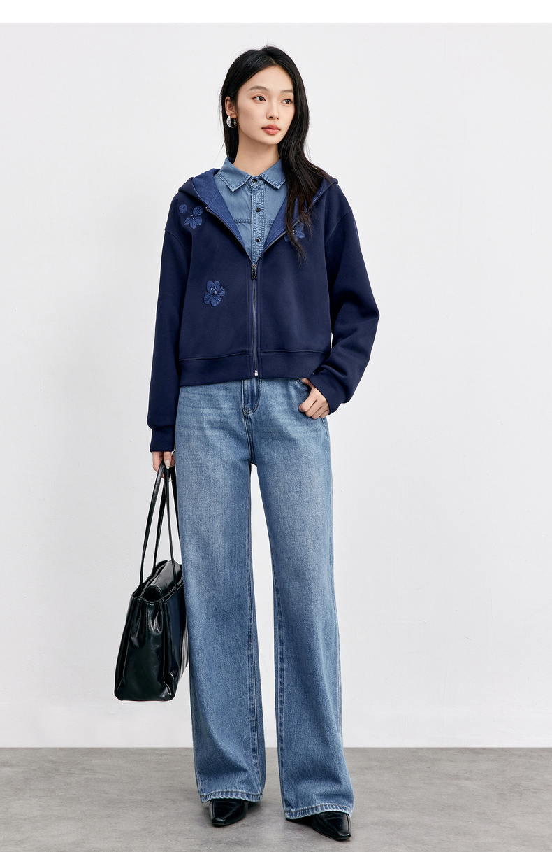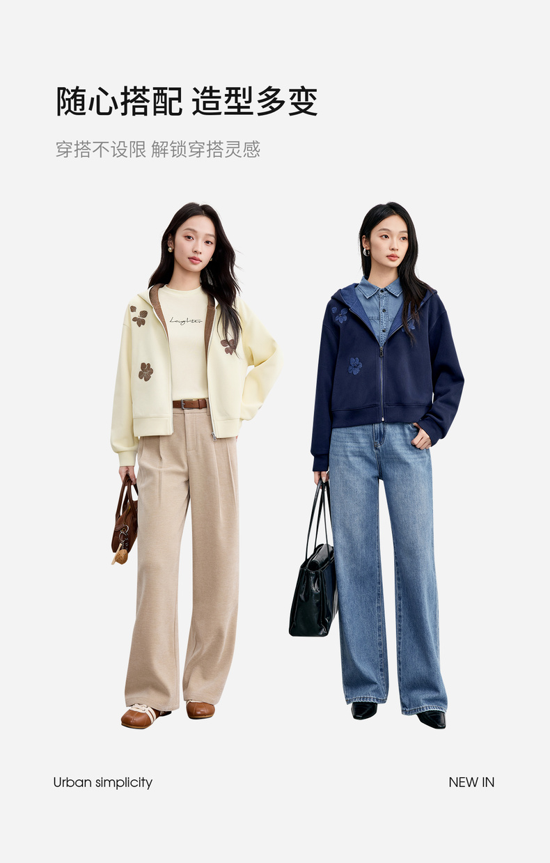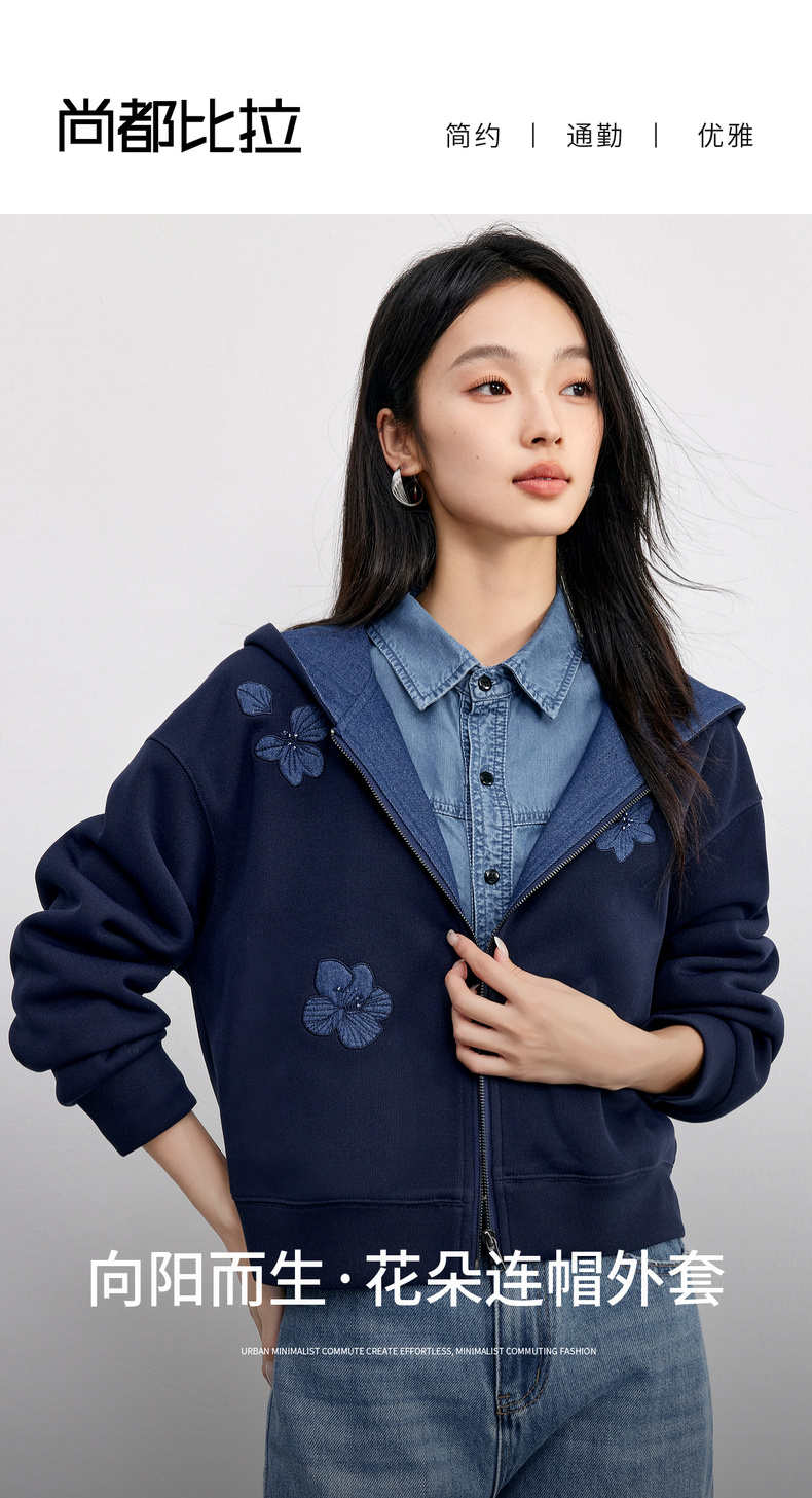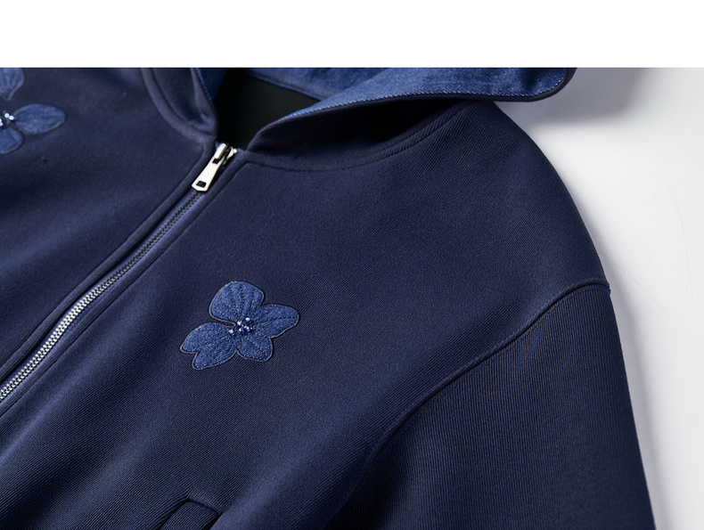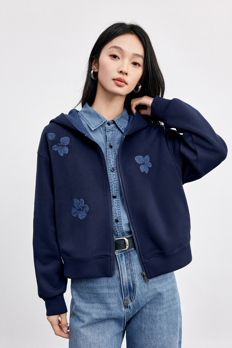 【内购】【钉珠花朵】简约通勤撞色拼接连帽拉链宽松显瘦落肩长袖针织外套-153WC2565