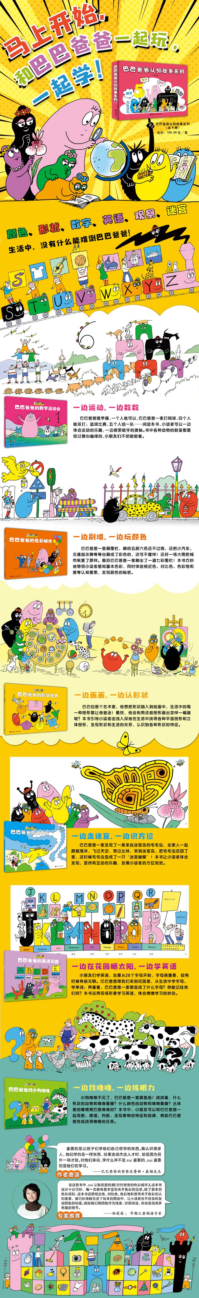 “巴巴爸爸认知故事系列”巧妙运用巴巴爸爸一家强大的变形特点,把小读者带进一个极富想想的神奇阅读情境。跟随巴巴爸爸,小读者可以轻松认知颜色、形状、英文字母,巧妙培养数的概念、观察力和方位知觉。