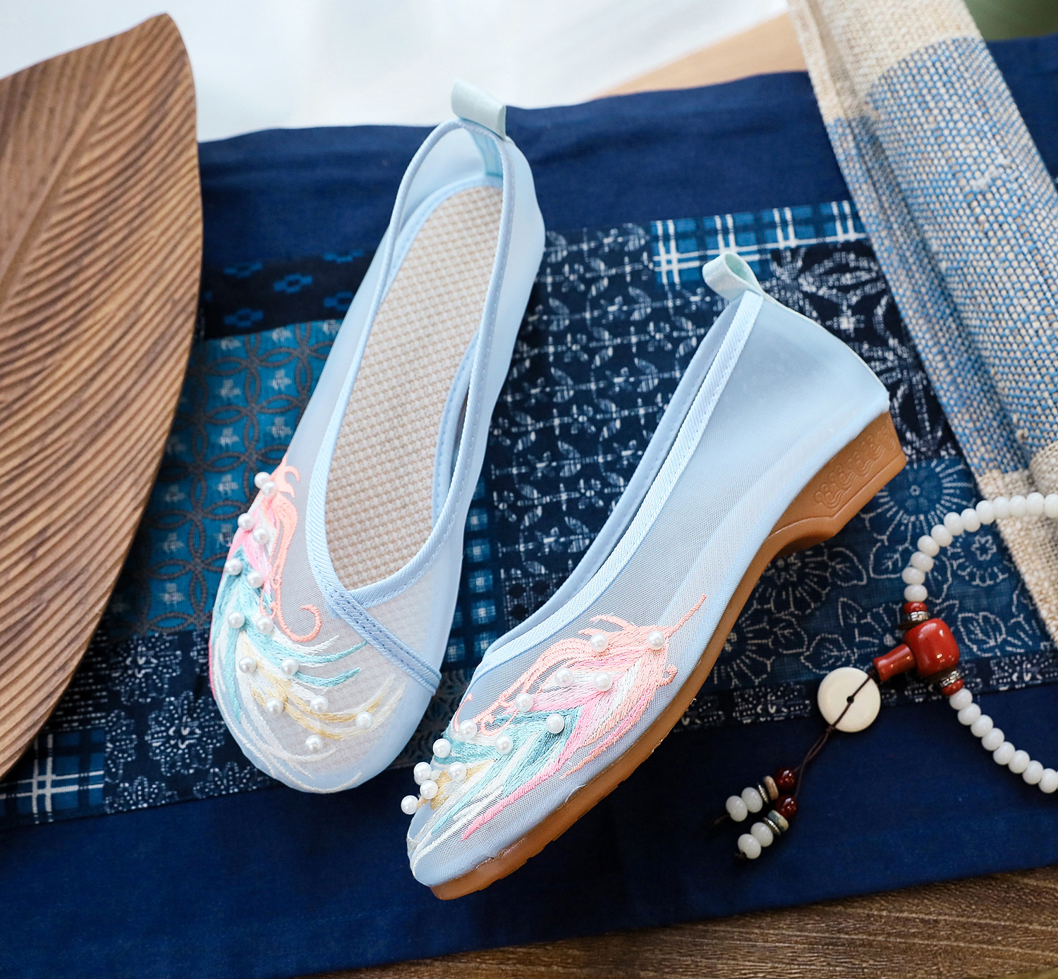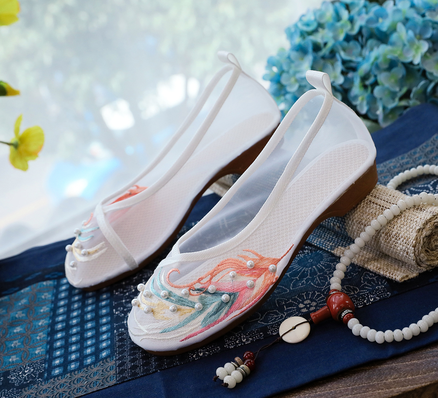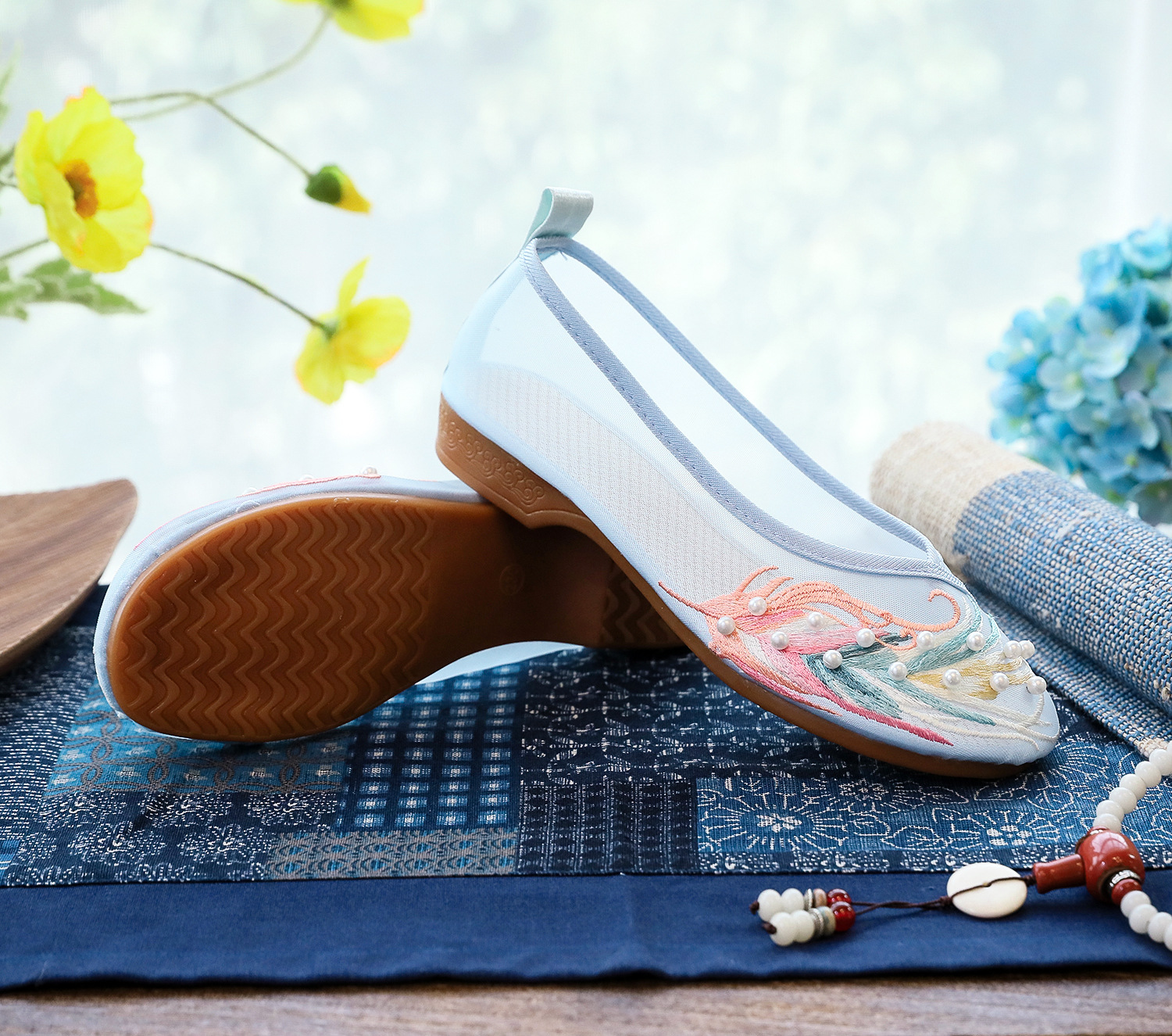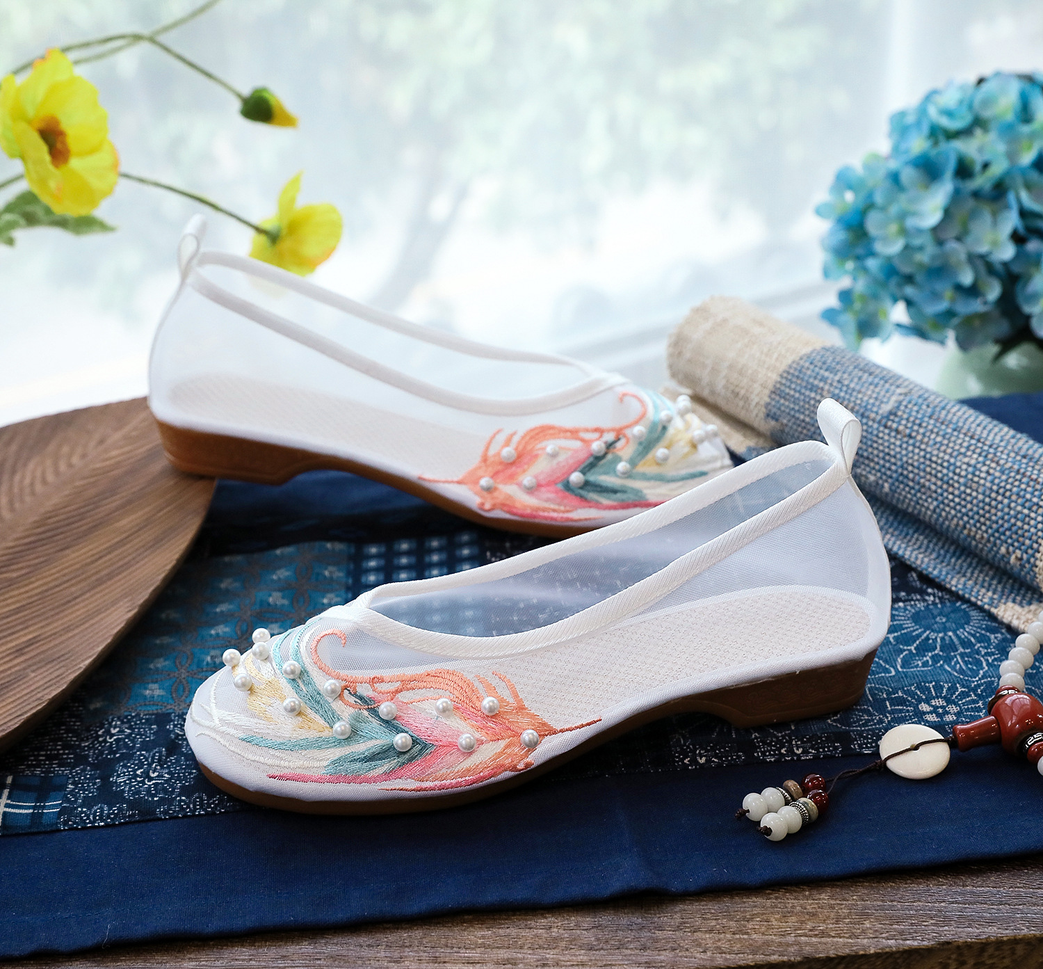 【网纱彩羽】古风圆头,镂空平底绣花鞋 YR