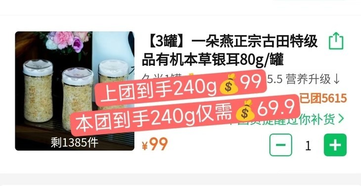 中秋送礼!秋季滋补润肺 滋阴养颜,就选一朵燕有机本草银耳! 央视严选大品牌,久光在售高端滋补品牌 团团万单卖爆!品质口碑足够硬1 天然有机认证!带有机标! 全程有机种植+有机加工,双有机健康食品! 特级品有机本草银耳! 之前大罐到手240g💰99,中秋破价福利! 开团小包装40g*6罐到手240g,仅需💰69.9❗ 还送礼袋!全网最炸机制!卷到天花板❗ 上海久光百货一罐80g就要💰109呢 这个价格真的太值了!家庭必备囤囤囤! 今天开团,不到1张毛爷爷能买一堆 在外面真买不到什么东西 这个牌子主要做线下 能进上海久光百货的肯定不是差的品牌品质!