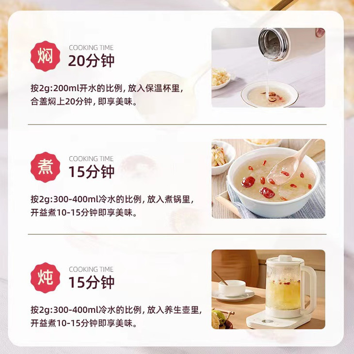 食用方法如下👇👇👇 舀3勺银耳倒入焖烧杯 根据个人口味加入银耳伴侣 倒入100度开水倒至8分满 拧紧盖子焖20分钟即可食用