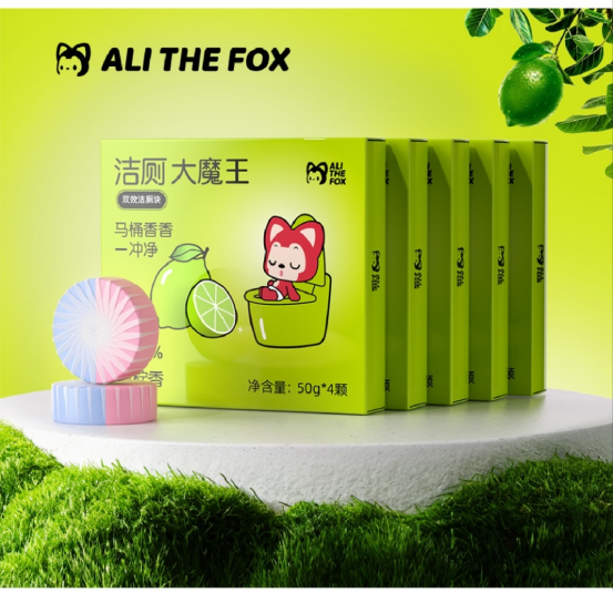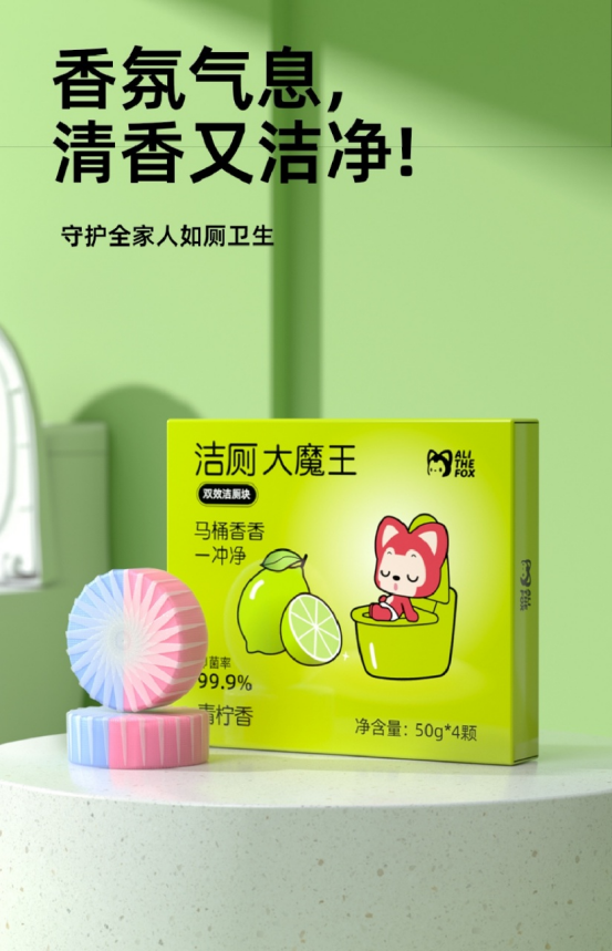 🔺 青柠/白桃香型 嗅觉经济学:用香型定义「厕所社交」 • 青柠香:柠檬草+薄荷提取物,对标星级酒店洗手间“高级感”,掩盖外卖火锅后异味场景刚需。 • 白桃香:白桃汁香气分子复刻,宝妈群体“厕所育儿”场景——孩子抗拒刺鼻消毒水味,主动要求去厕所玩贴纸书。 传统洁厕块香精浓度超5%导致呛鼻 阿狸将浓度控制在0.8%+天然植萃 安全放心使用,轻松化解卫生间异味