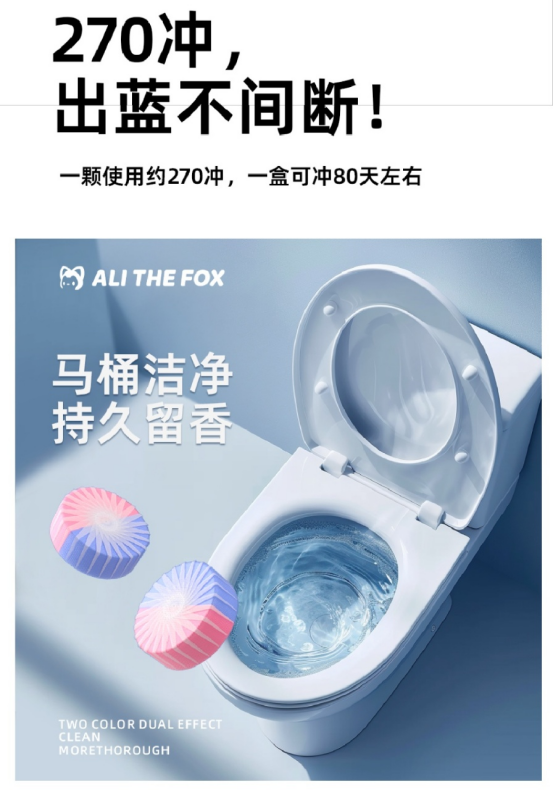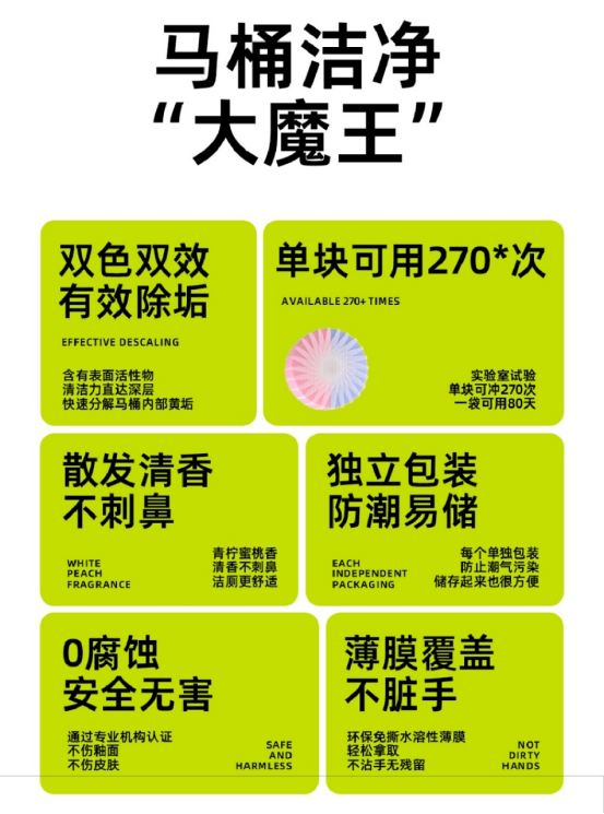 懒人福音!0接触+0腐蚀的精致洁厕 传统洁厕块沾手、易受潮❓ 洁厕剂刺鼻伤釉面?❓ 频繁更换太麻烦❓ 【阿狸 洁厕大魔王】 🔺独立密封包装+水溶膜黑科技 单手一丢自动溶解,不湿手不黏腻 防潮设计南方梅雨季也不结块! 🔺 0腐蚀配方 马桶陶瓷层、橡胶圈、皮肤接触全防护 淡雅果香替代化学呛味! 🔺长效缓释黑科技 冲水即释放活性成分,1次投入=270次免刷洗 租房党/996打工人的「隐形家务管家」!