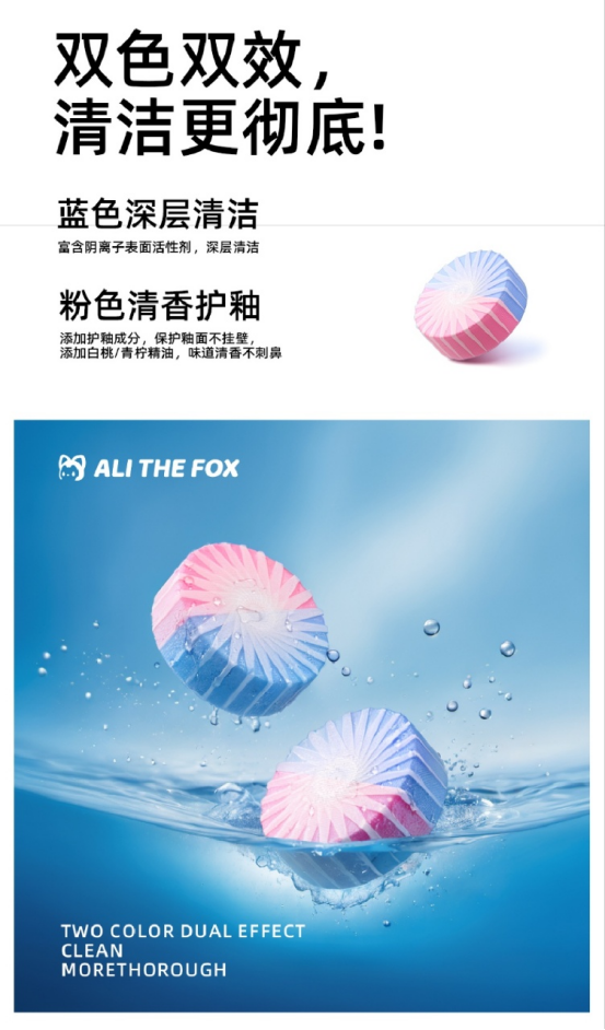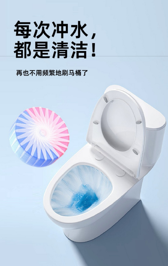 🔺 双色双效,有效除垢 蓝粉CP,科学分工 1次清洁=去污+护釉+留香 通过渗透、包裹、分解三步 连马桶边缘凹槽的10年老垢也能“连根拔起” 🔵 蓝色核心:阴离子表面活性剂“定向爆破” 粉色核心:硅氧烷护釉层+微胶囊锁香技术 护釉成分在马桶表面形成纳米级疏水膜 污渍“滑”入水中不残留 精油包裹在可降解微胶囊内 冲水时破裂释放香气,留香时长提升3倍 🔺 单块270次长效实证 不是「标称」是「实测」! 冲水100次后依然能打」