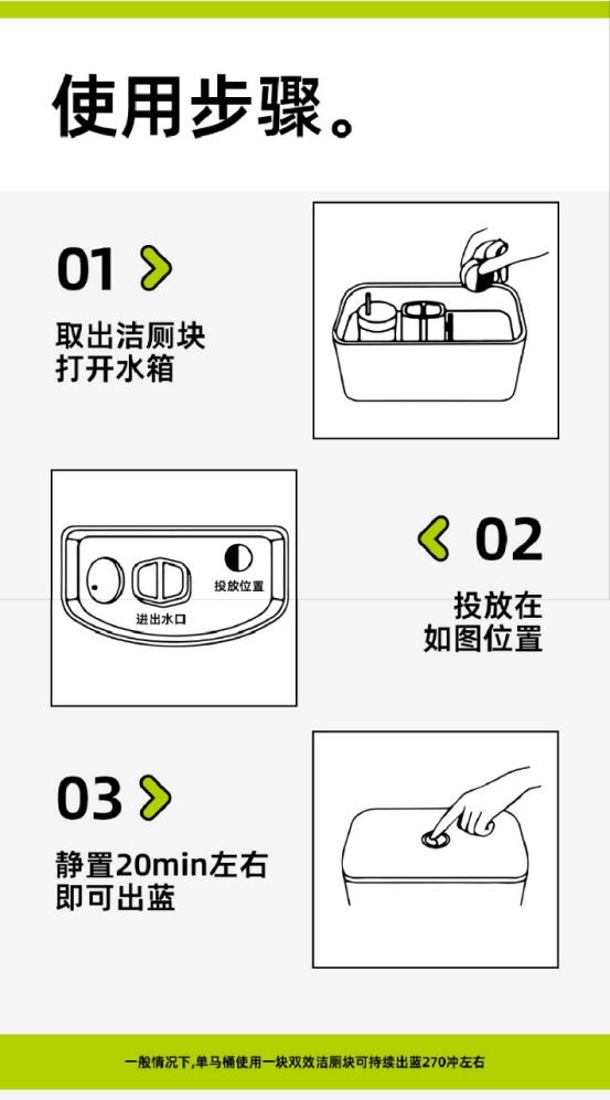 采用缓释凝胶技术,遇水释放量动态调节 低水量时仅释放基础清洁成分 大量冲水时加强去污力,避免无效损耗 按家庭日均冲水10次计算 1颗=27天用量 上班族租房换房无需拆走 直接用到天荒地老!